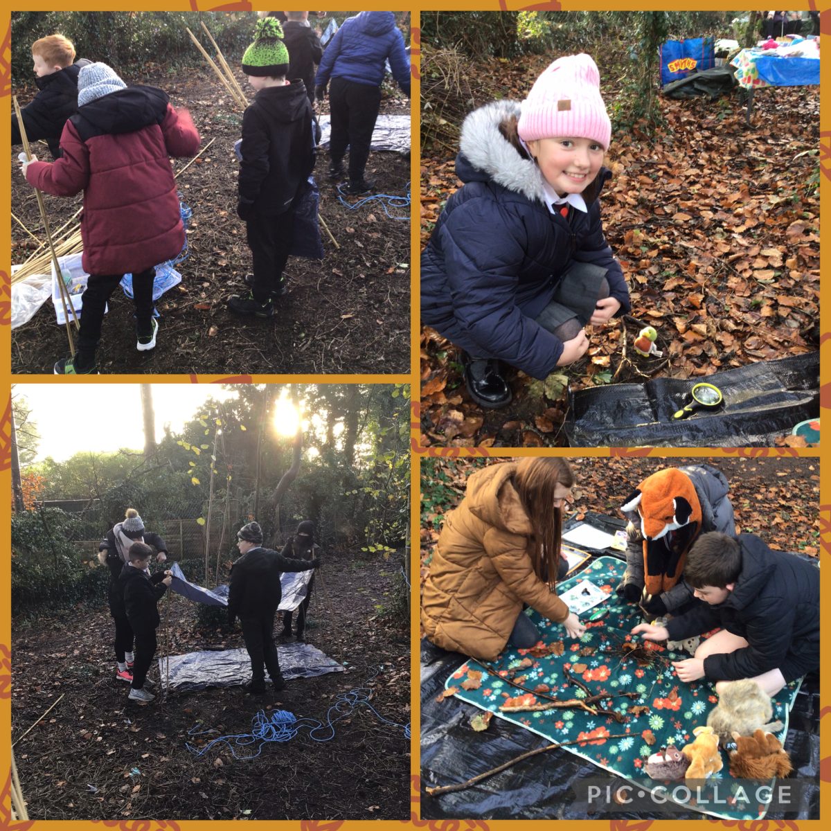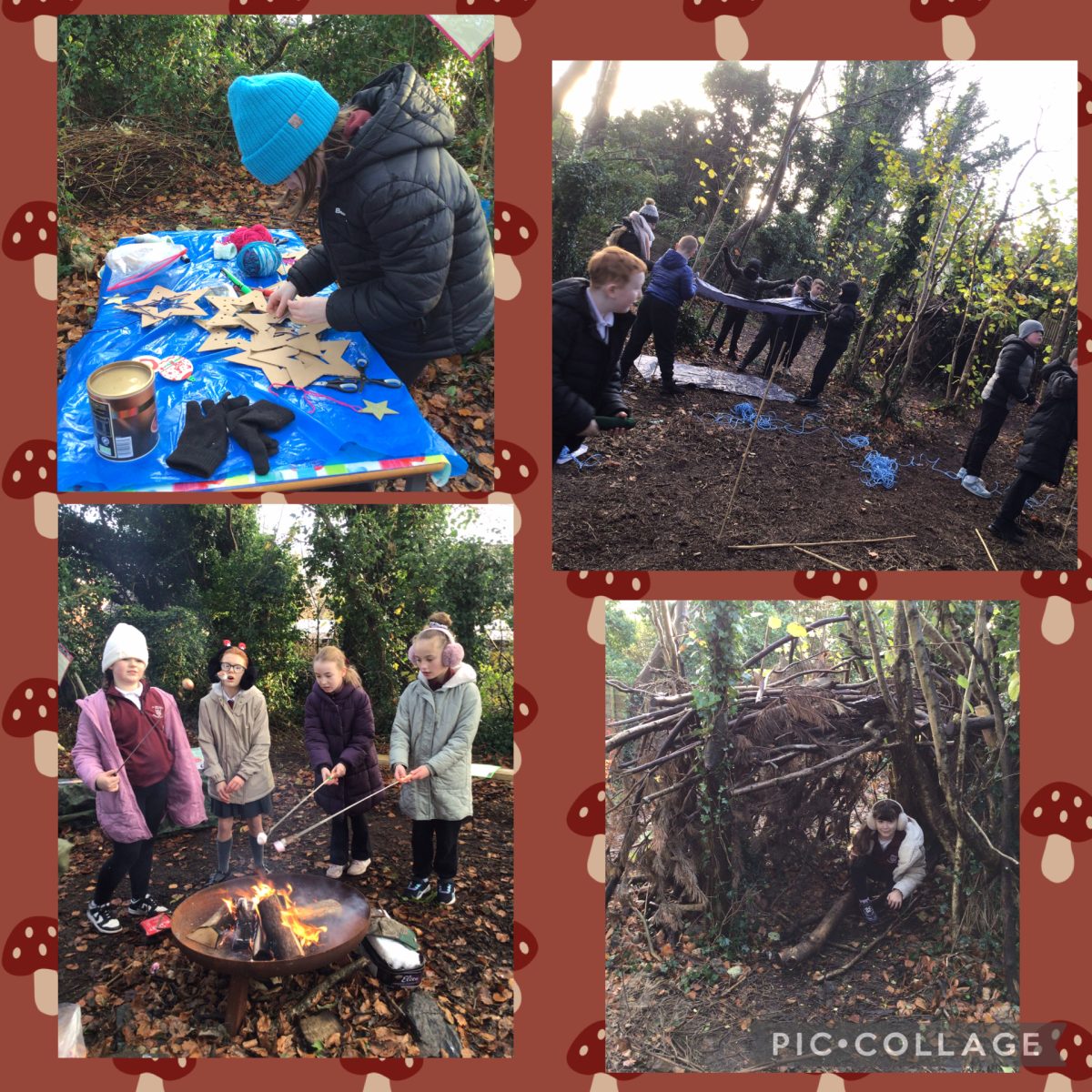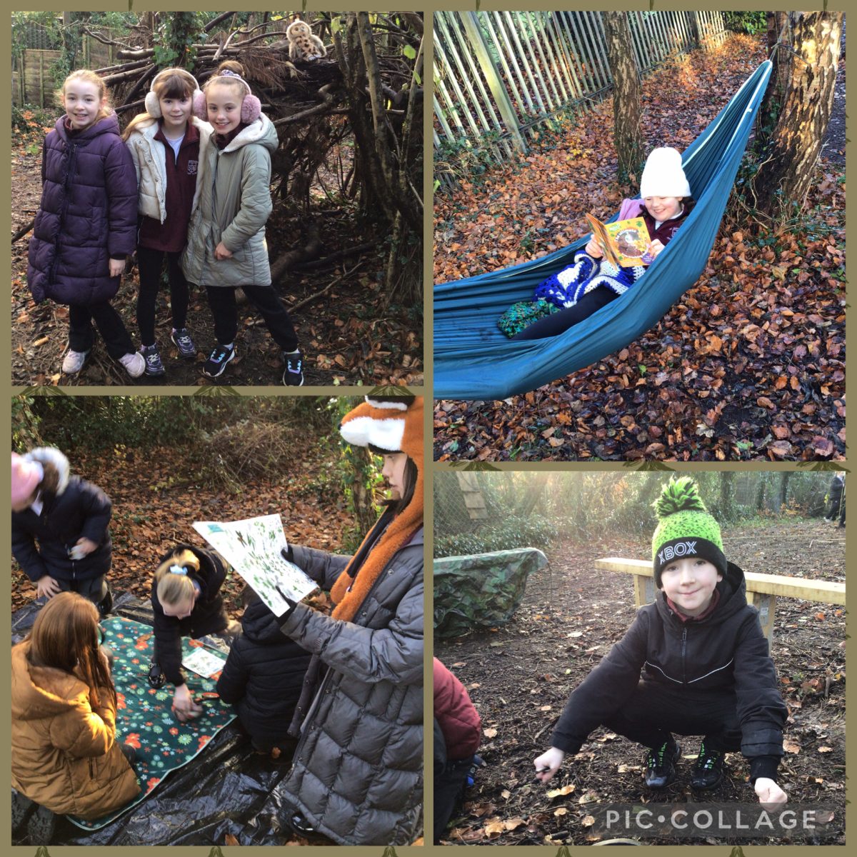 We built and found suitable places for the different animals to live over the Winter within our forest school. We made wooden charms depicting Winter scenes and hung them around the forest. We put up our hammock and read about woodland animals while relaxing listening to the birds in our forest.