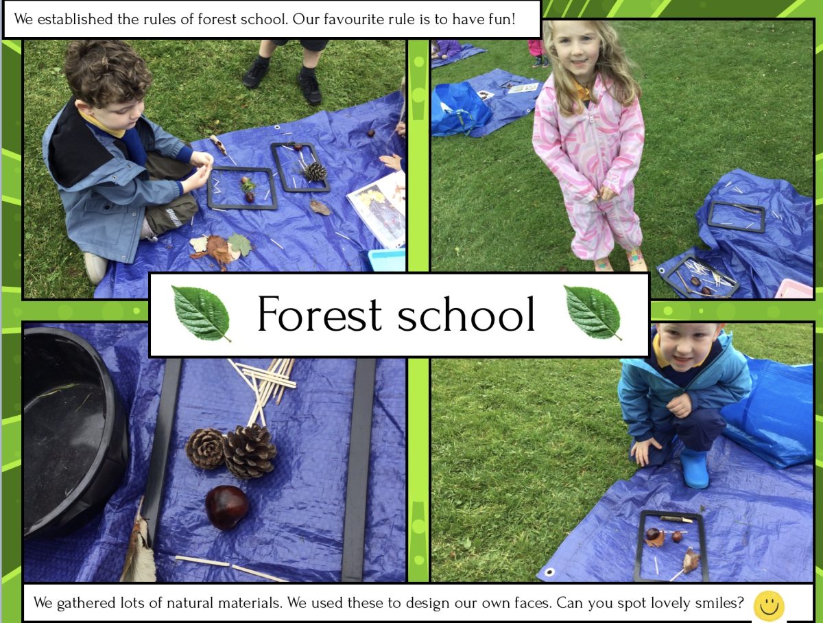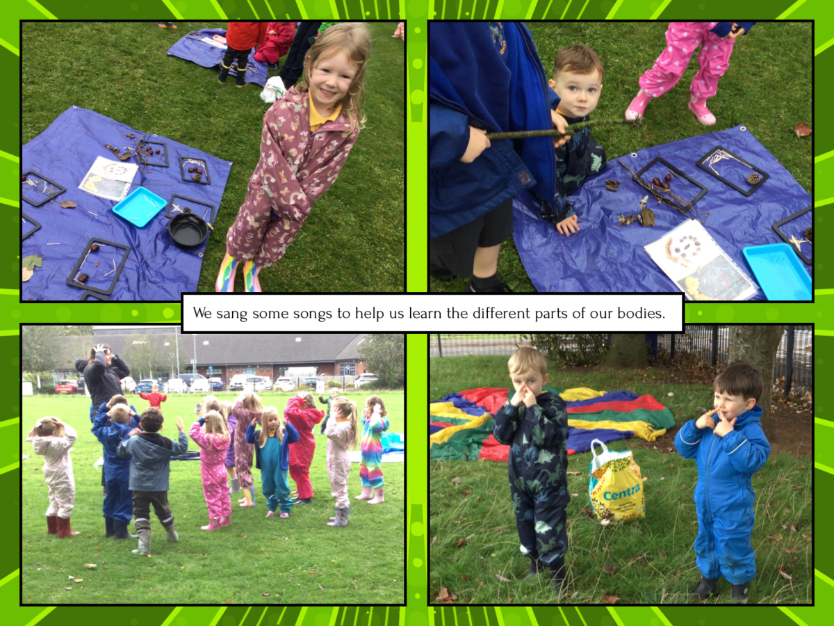 We sang some songs to help us remember the parts of our bodies. We played some listening games too. We looked at pictures of nature faces and talked about what materials could be used. The children collected natural materials from our area and using frames, created their own fabulous faces.