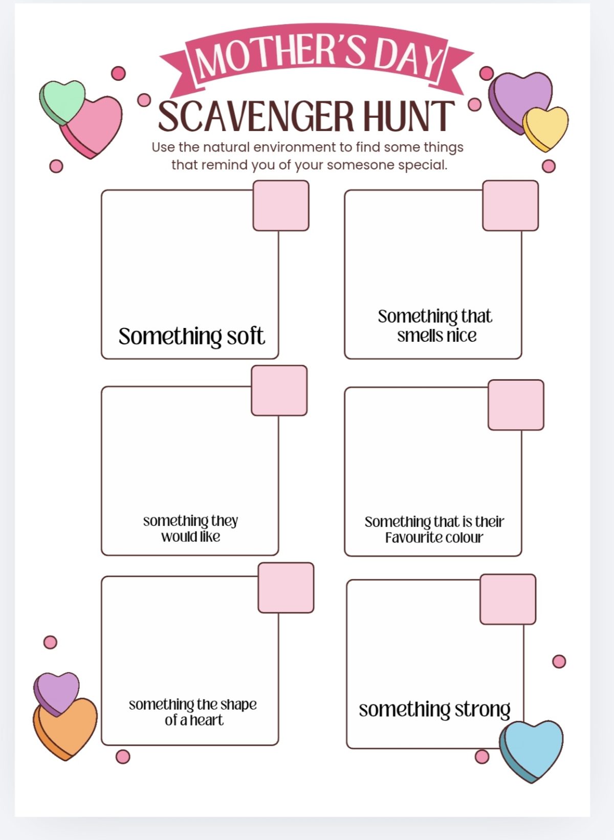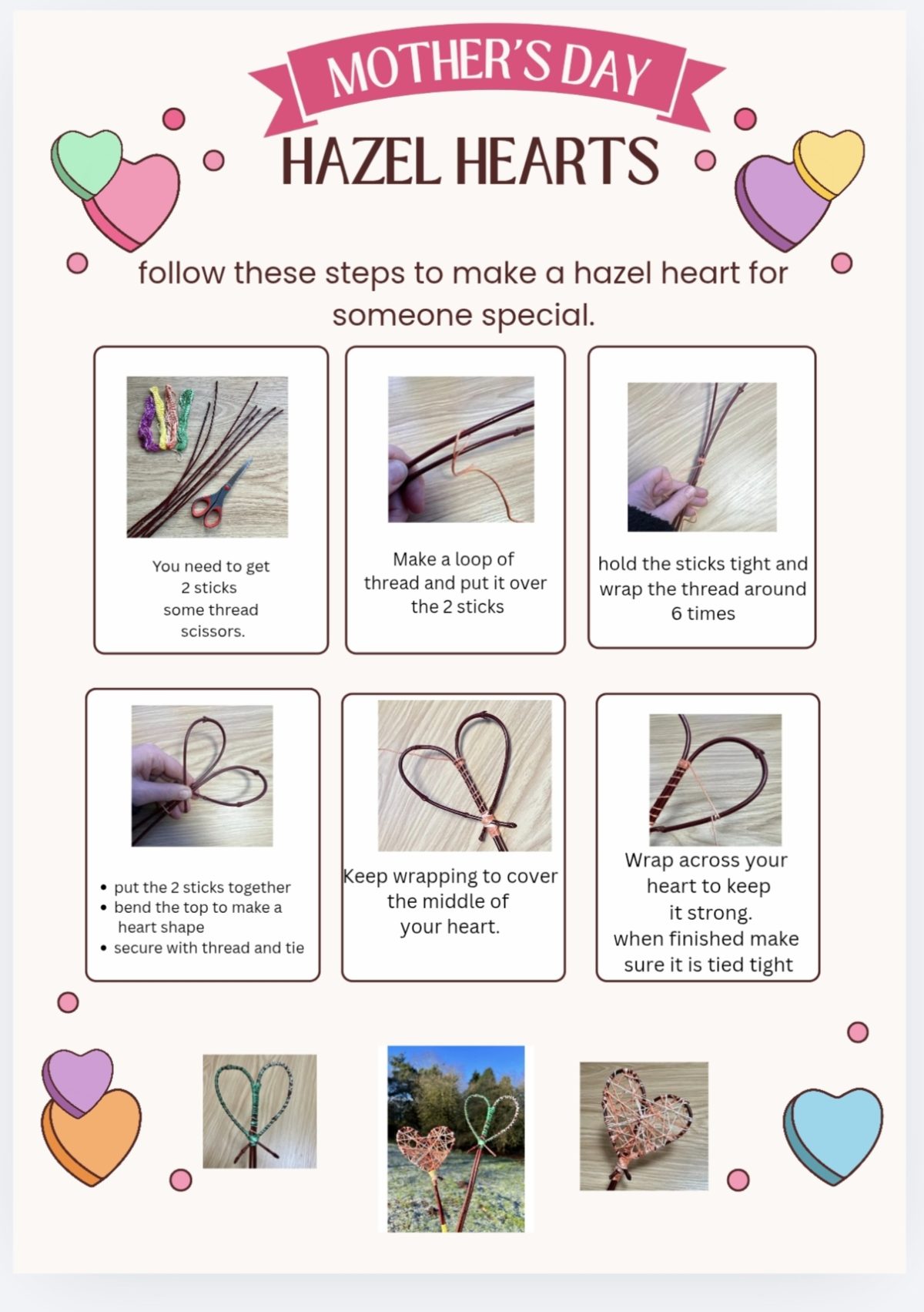 We created beautiful mothers day Hazel hearts and decorated them using wool and natural materials .We first looked at how to create hearts with our bodies- can you make one on your own, in pairs, in groups- then we identified heart shapes in the environment and completed a mothers day scavenger hunt