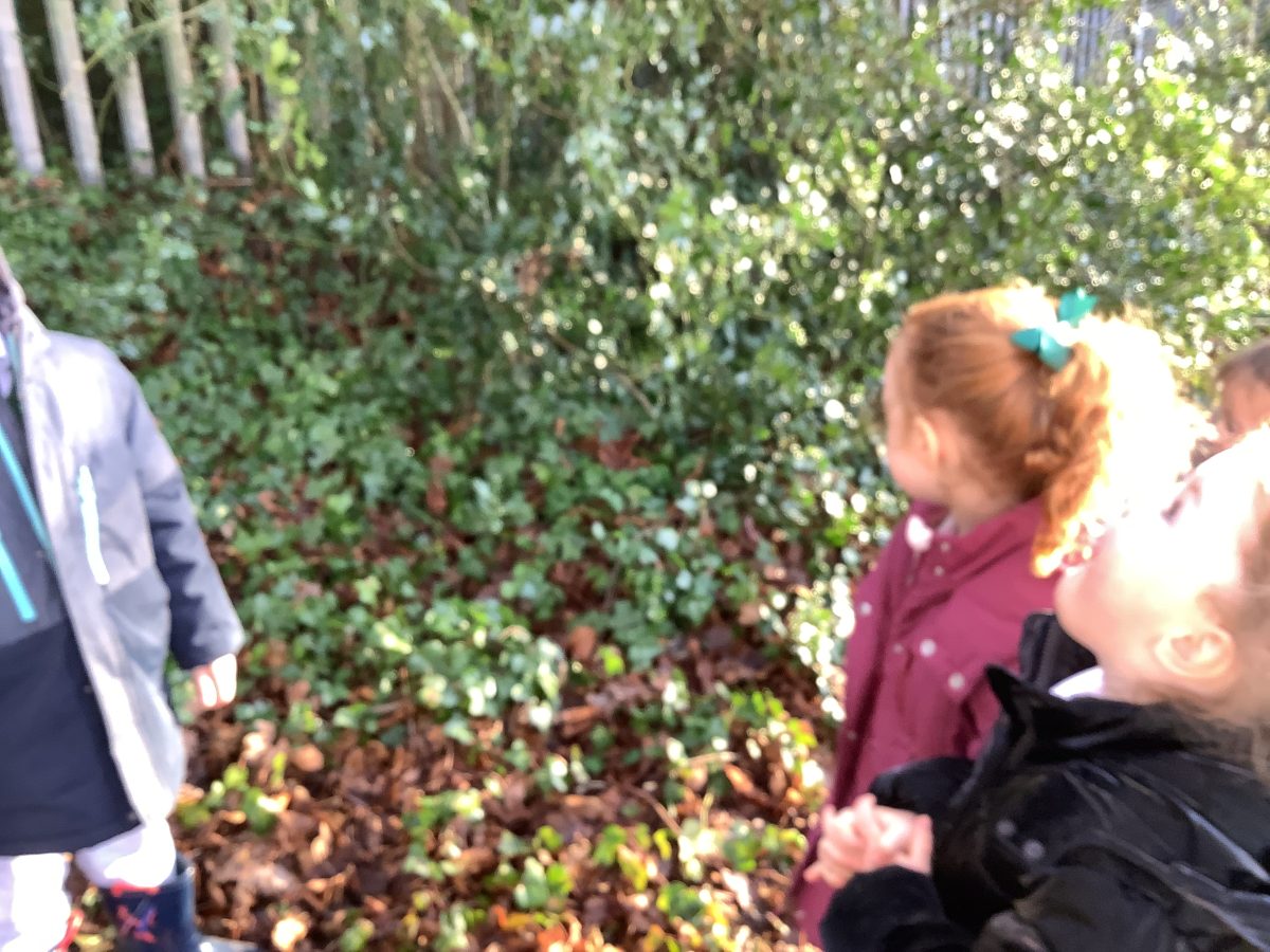 We observed that most trees had no leaves. We recalled that this is because it is winter. We saw buds beginning to grow on these trees. We saw some evergreen plants and we remembered they were called holly and ivy! We used our senses to describe them!