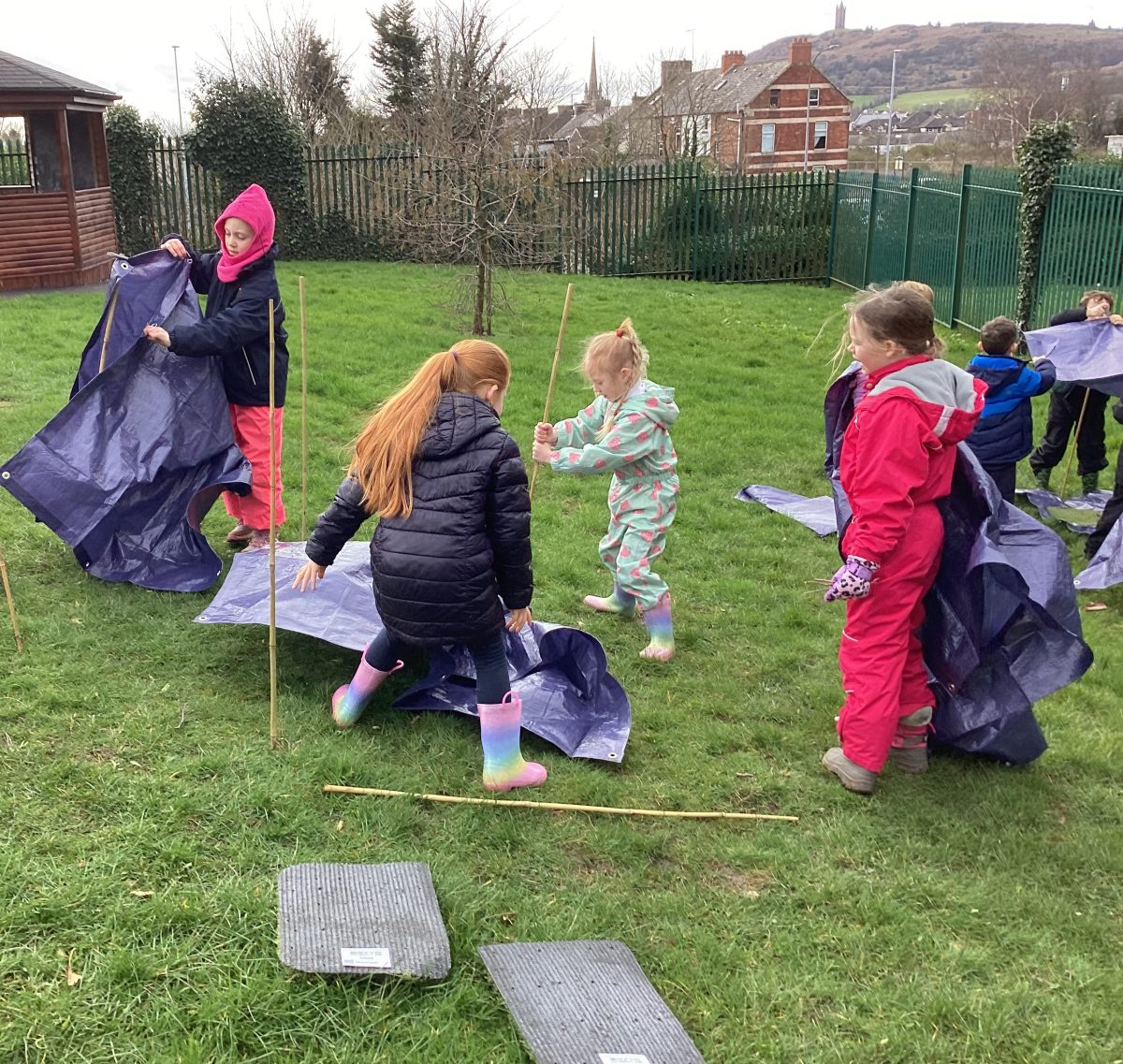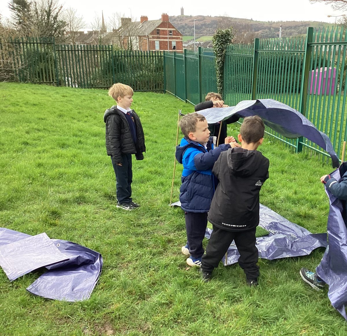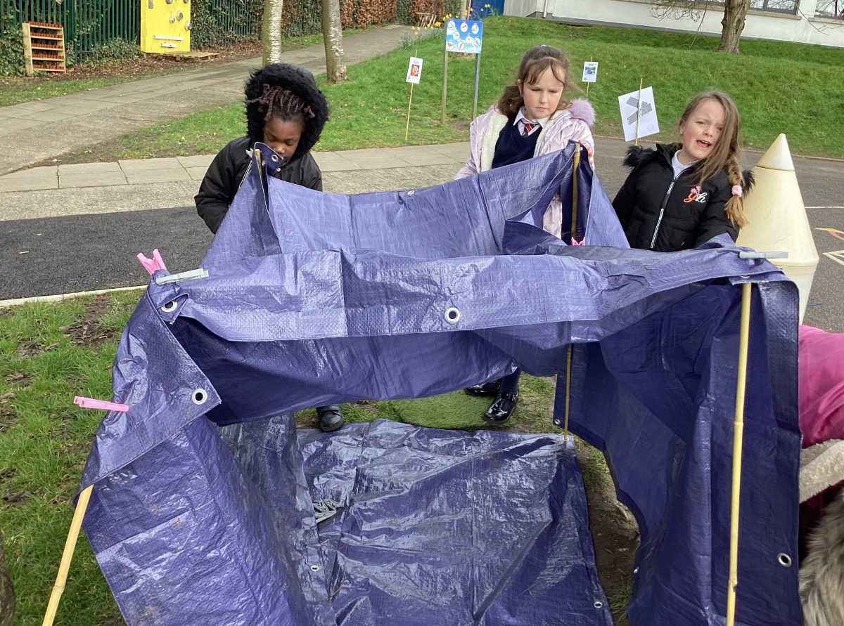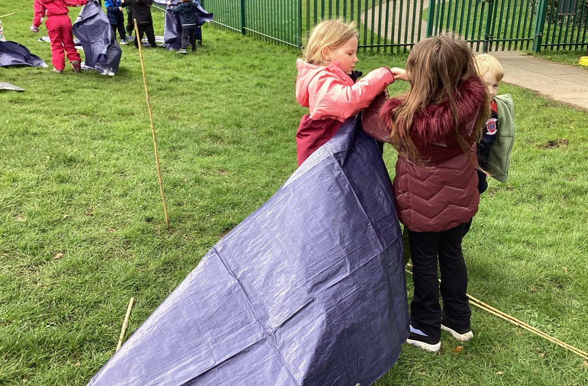 we discussed names of animals homes. The children put in the boundary flags. I called out an animal home and they ran to the correct boundary flag animal. the children then got into groups and created their own den together. Lots of great team work and fun.