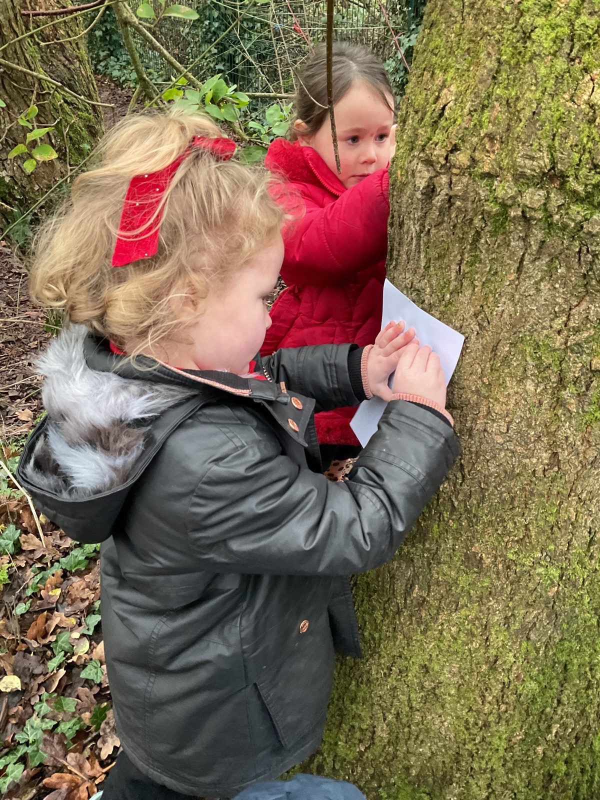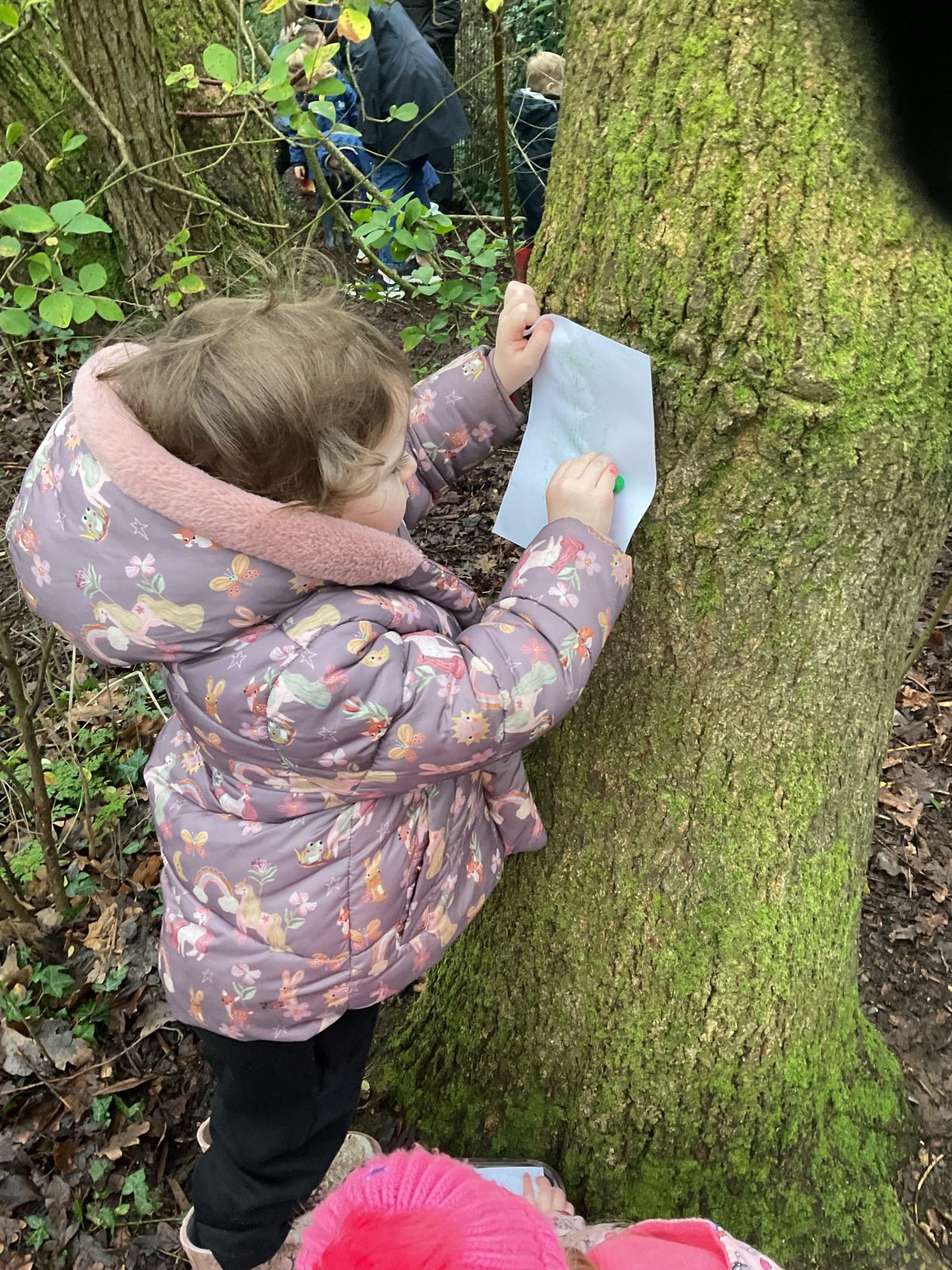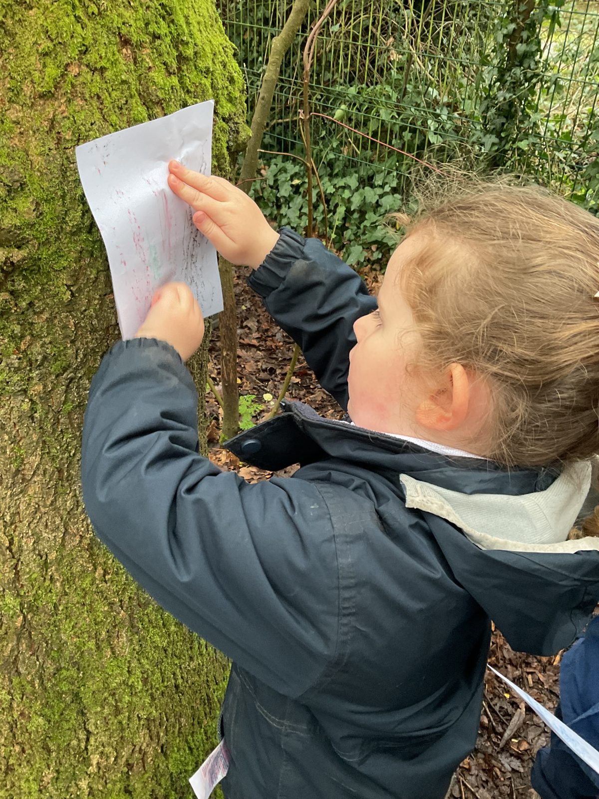 We looked at the pattern of the bark on our trees in our Forest Den. We used crayons to make bark rubbings with our friends from St Anne’s Nursery School