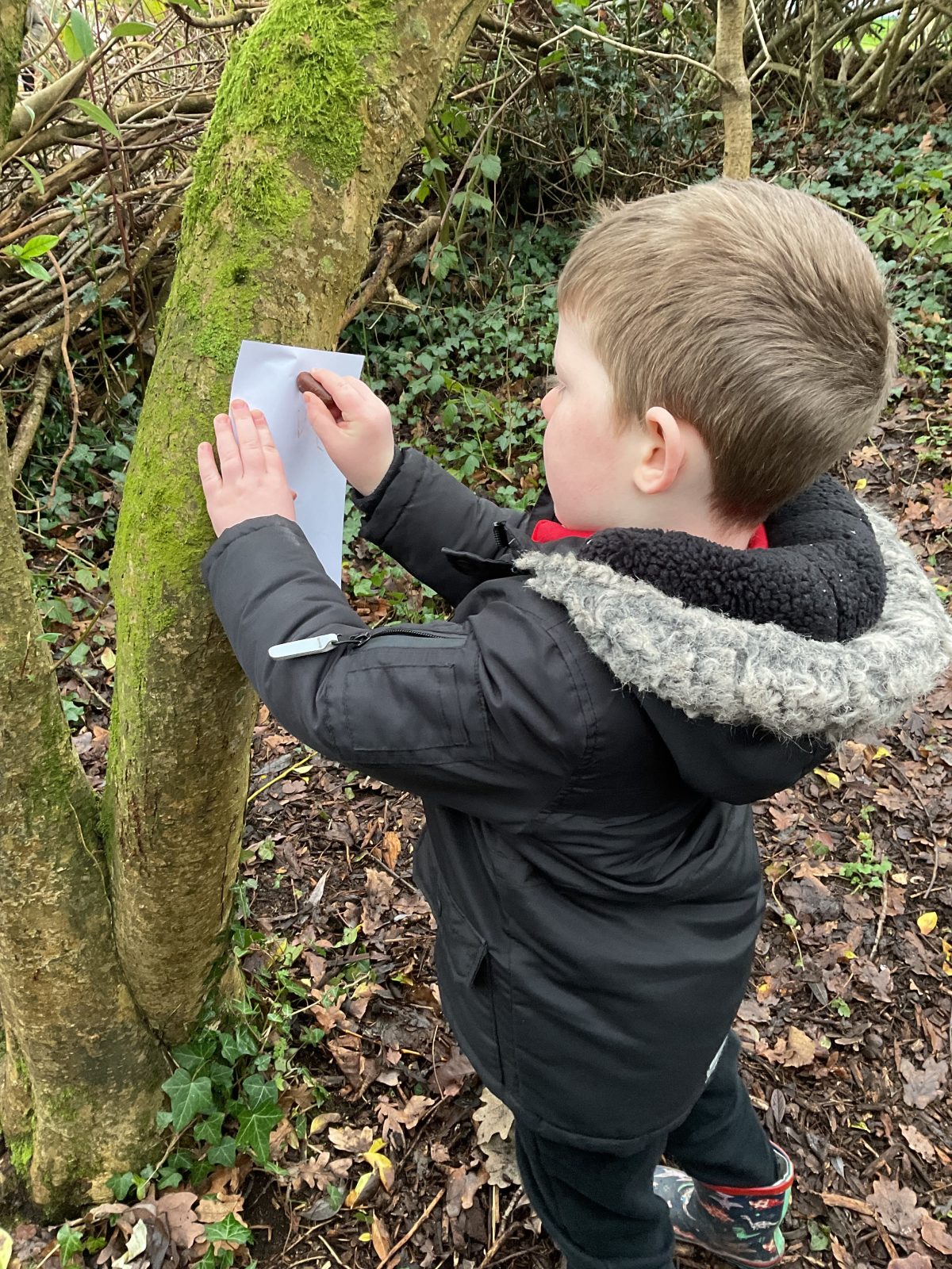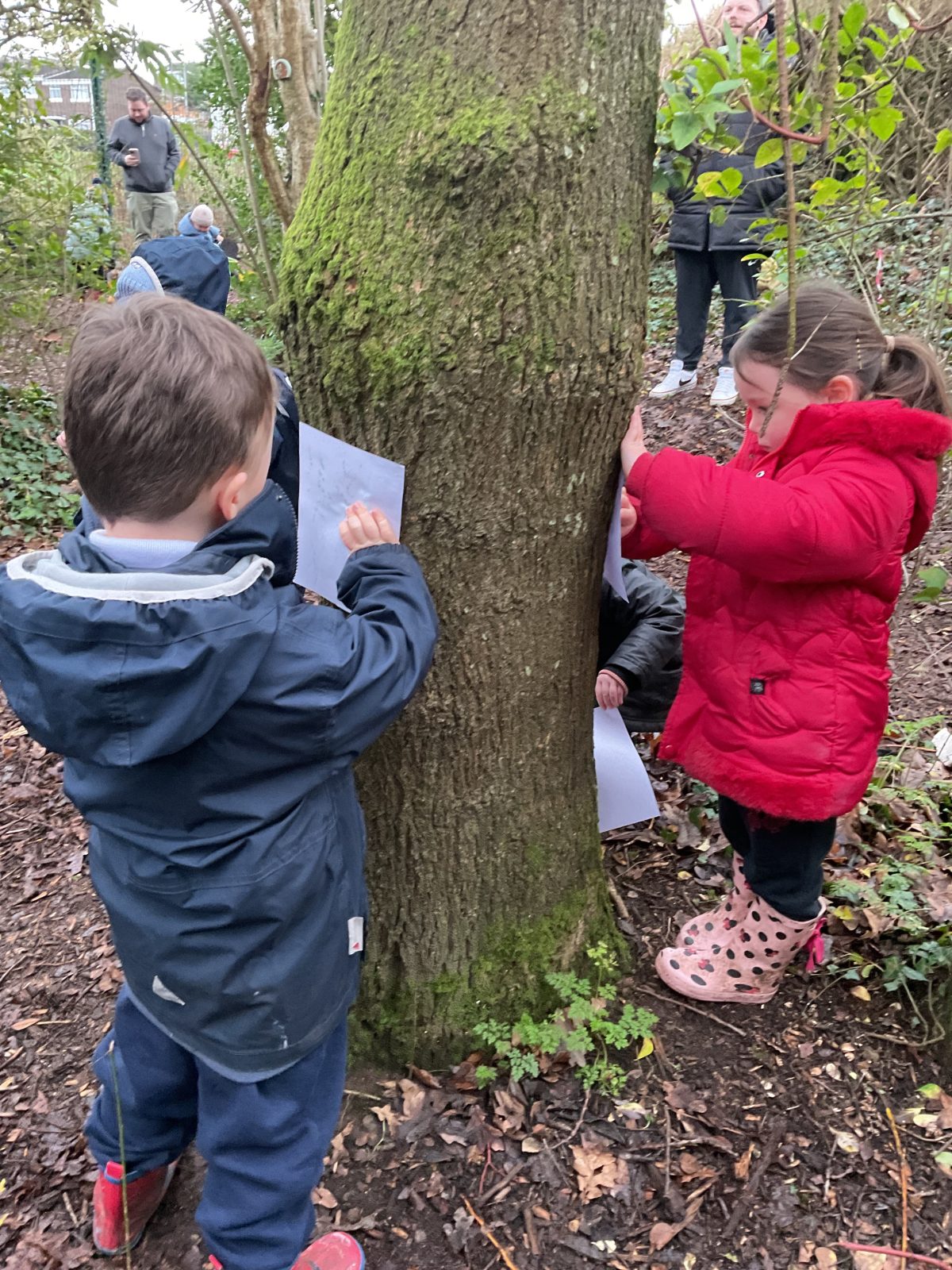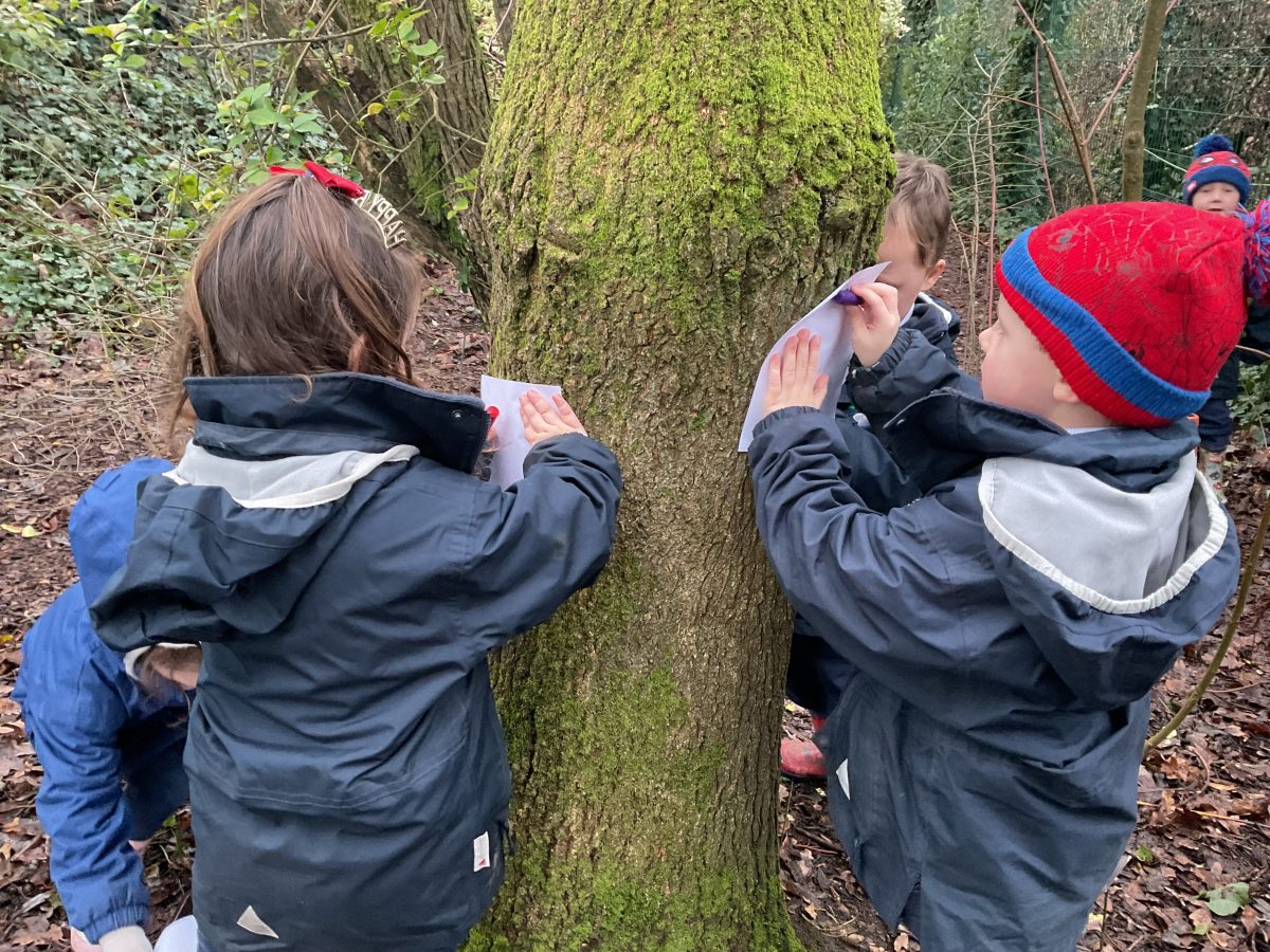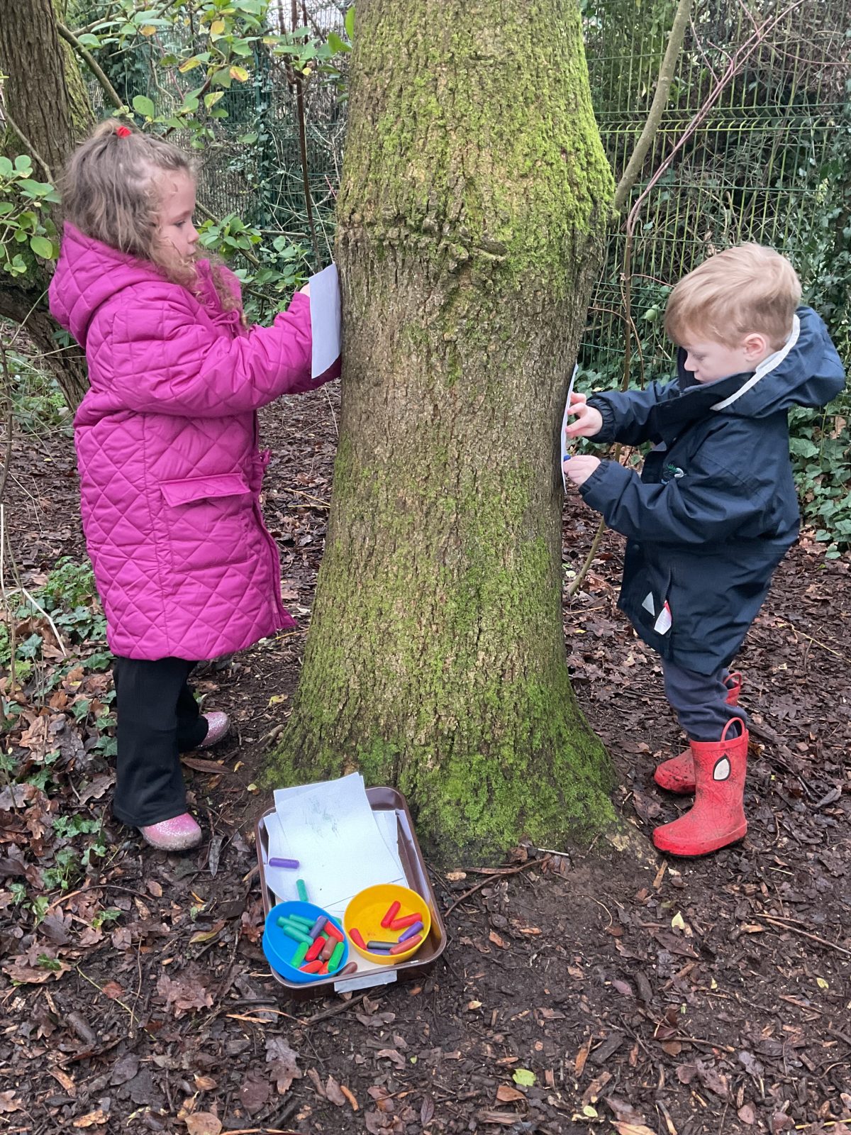 We looked at the pattern of the bark on our trees in our Forest Den. We used crayons to make bark rubbings with our friends from St Anne’s Nursery School