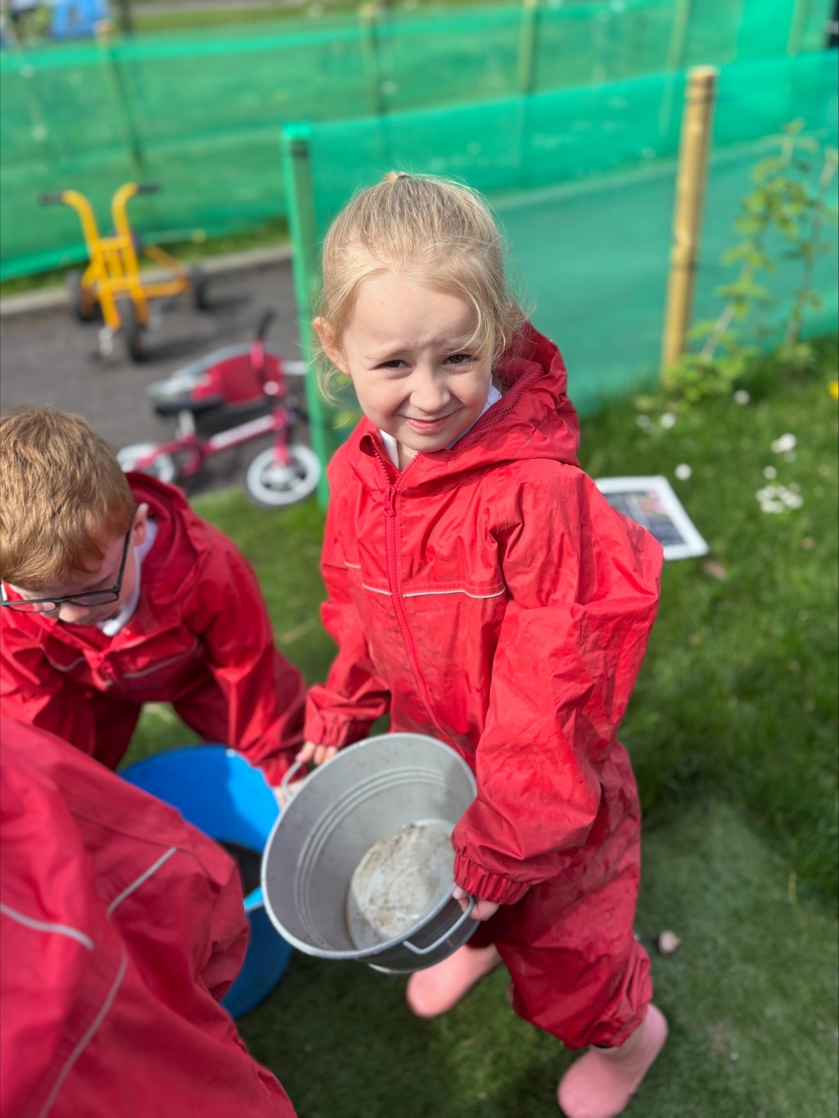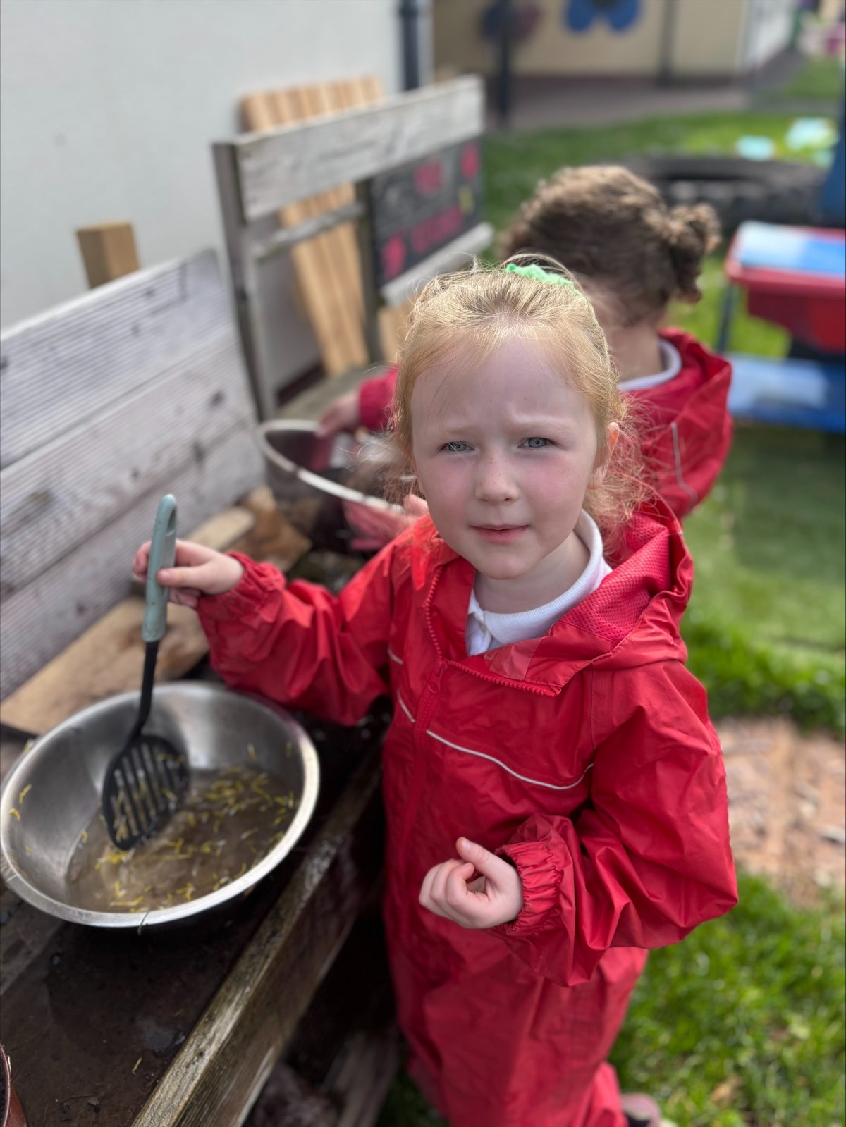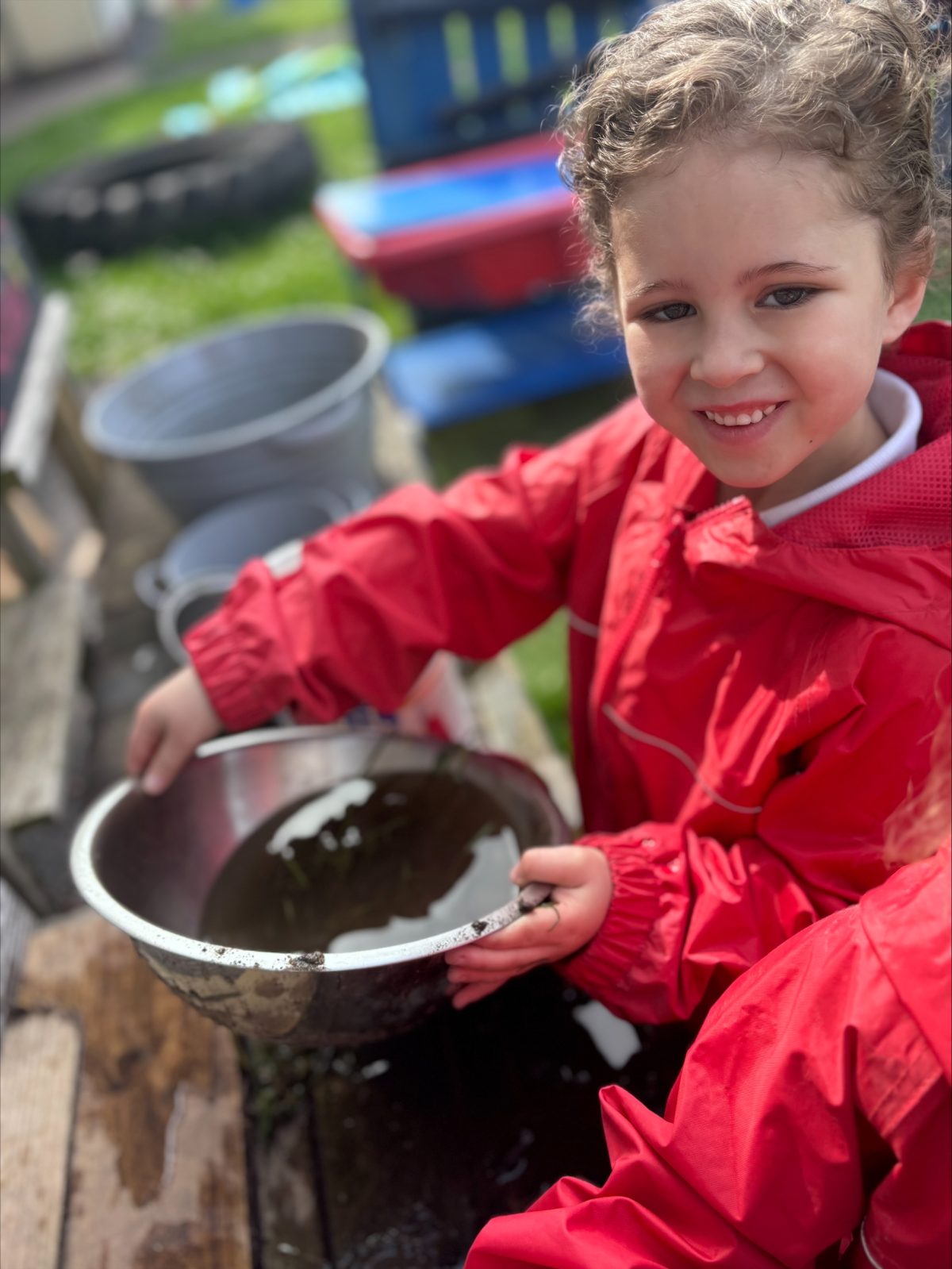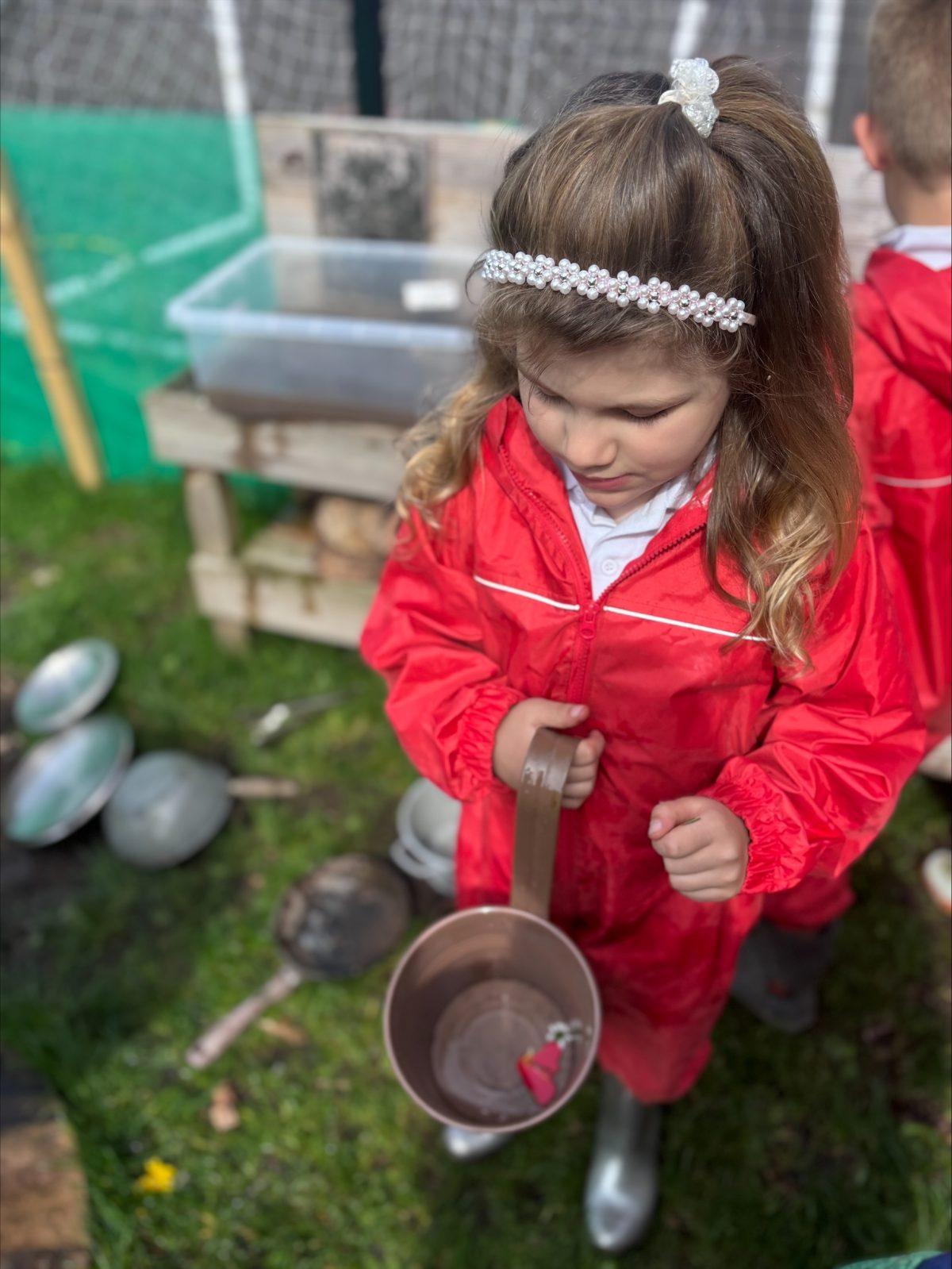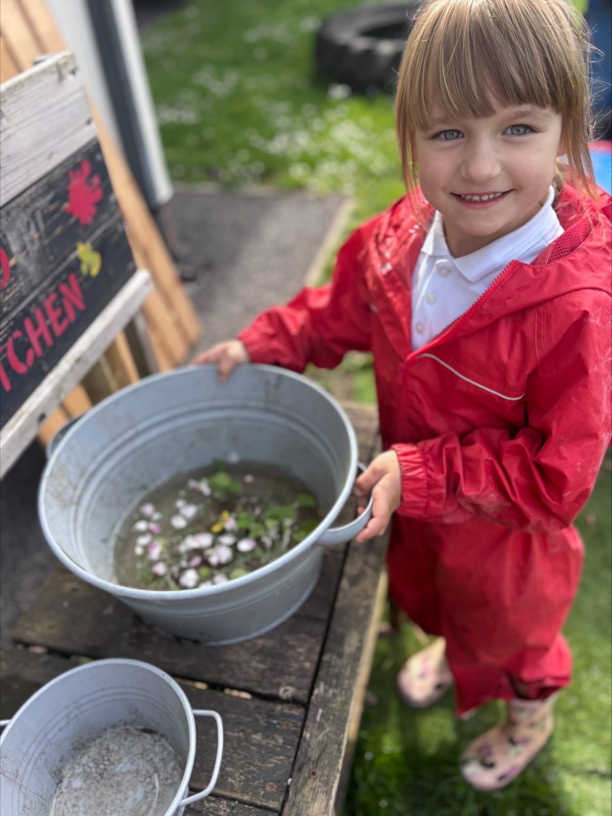 Making petal soup- filling, pouring, measuring, full, empty, following a recipe