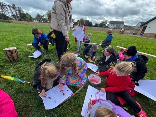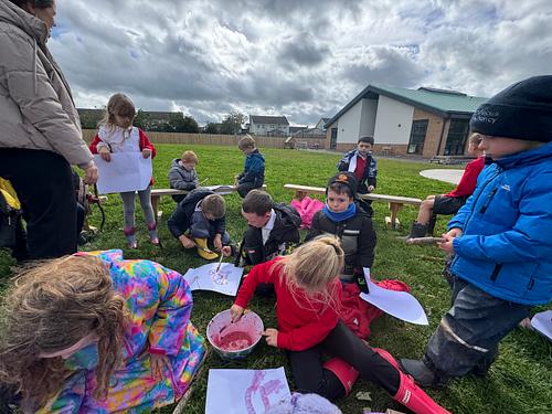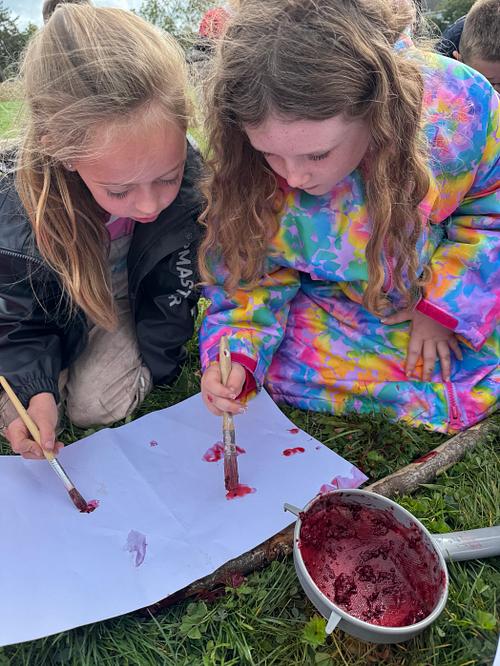Using sticks as natural paintbrushes, children engaged in creative mark‑making on a variety of outdoor surfaces. They explored how the paint behaved differently on wood, fabric, and card, and many developed their own techniques for blending or layering the natural dyes.