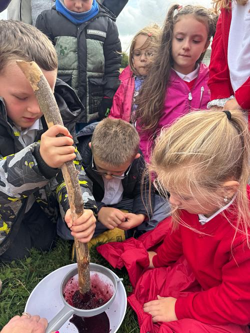 Back at our base area, the group worked collaboratively to sieve the berries and extract the natural pigment. They then combined the juice with cornflour to create a simple, eco‑friendly paint. This hands‑on process encouraged curiosity, scientific thinking, and problem solving as they experimented with quantities, textures, and colour intensity.
