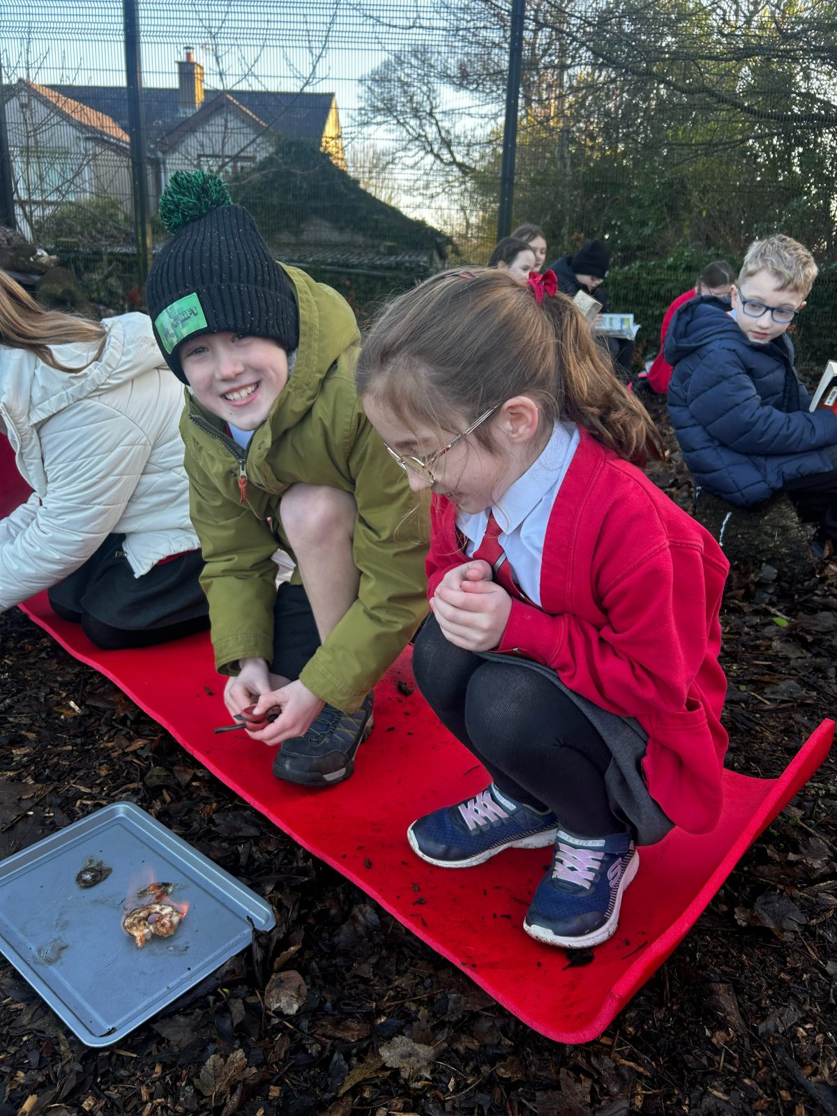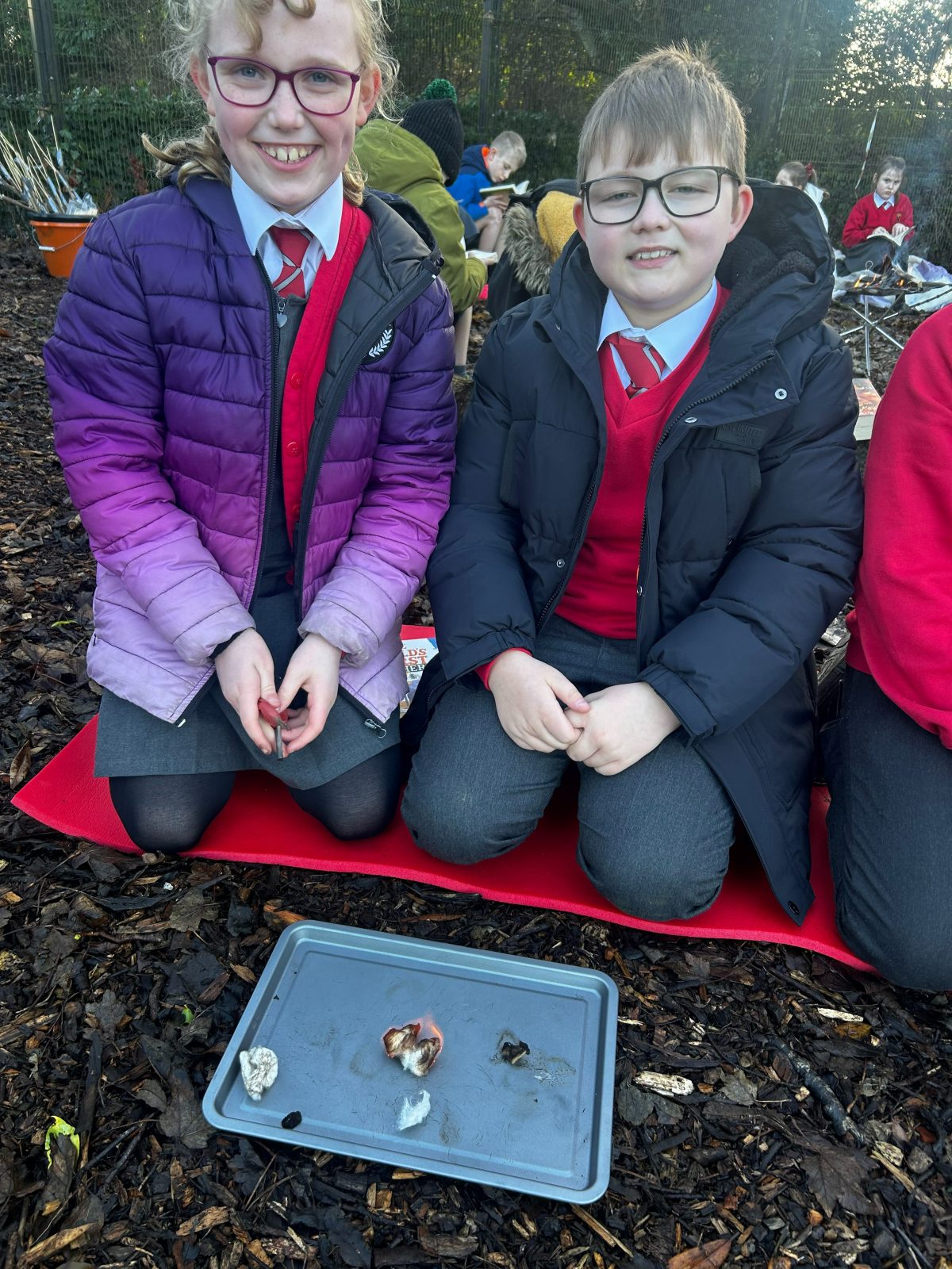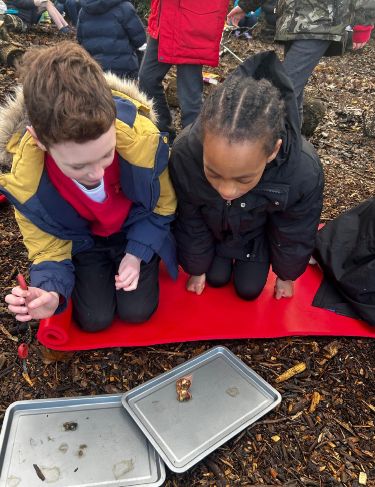 P5 ventured down to our Forest School Activity Zone today to try to light some fires. They have been investigating the science behind lighting a fire as part of their ‘Early Man’ topic. In this session they began by hearing the fire safety rules and discussed why it was so important for Early People to have access to fire. They then split into pairs and used flint strikers and cotton wool balls to attempt to light their own fires. We discussed what methods helped to light the cotton wool ball the quickest and what they thought might hinder this. P5 were then treated to a toasted marshmallow as a reward for all their hard work.