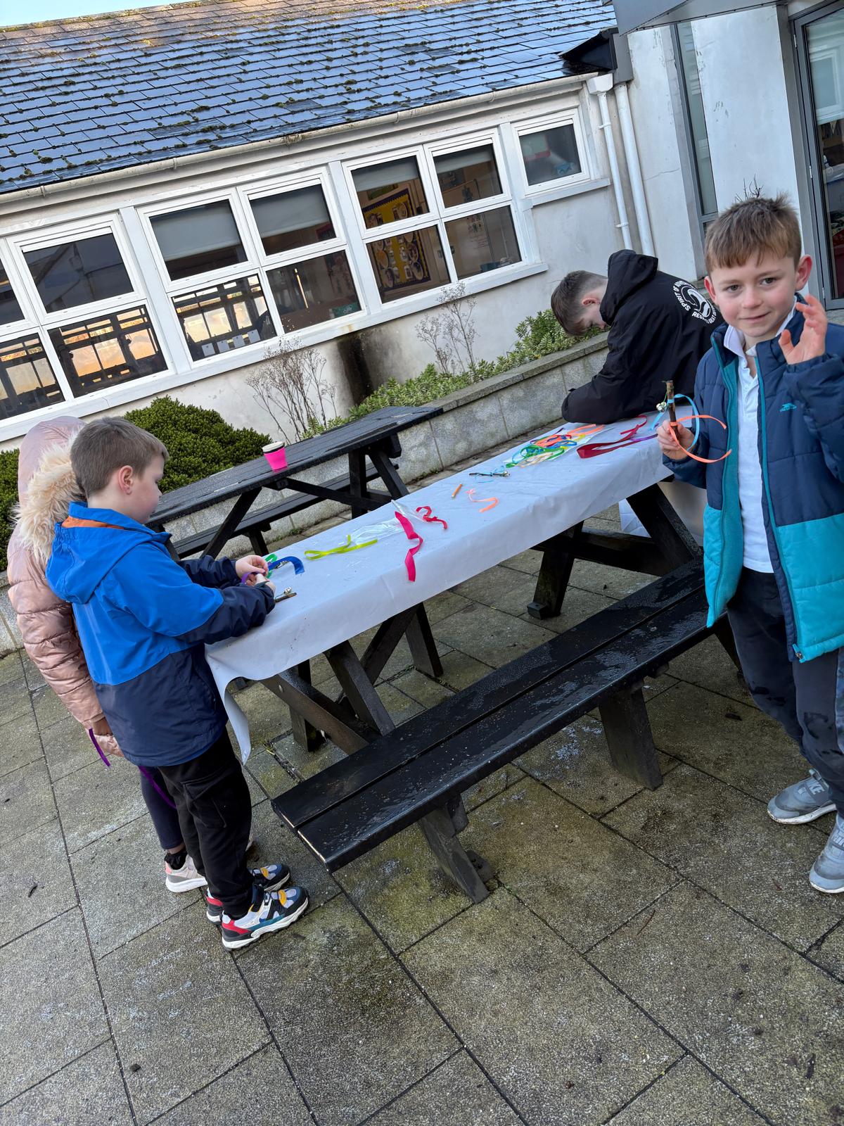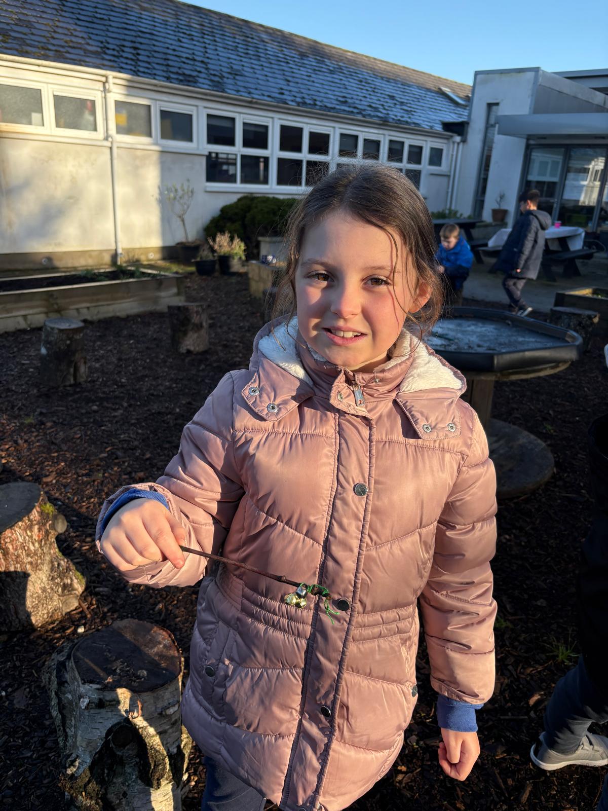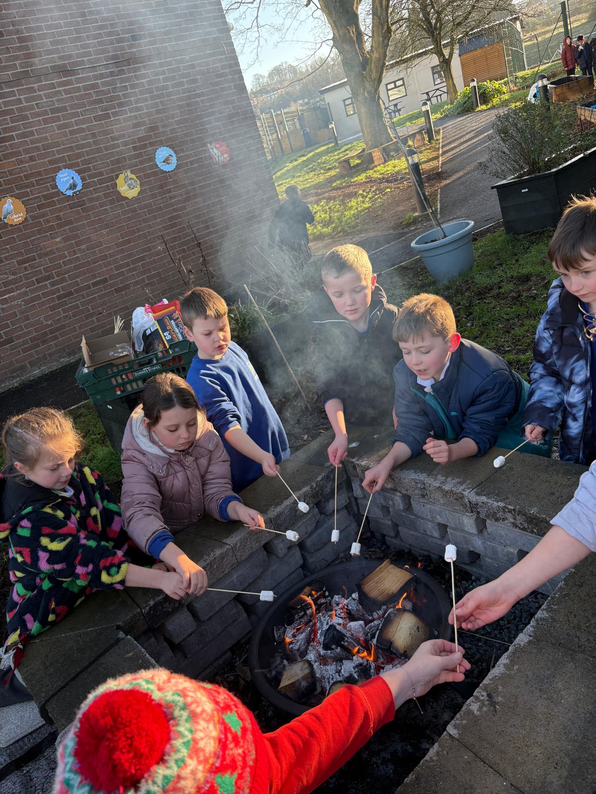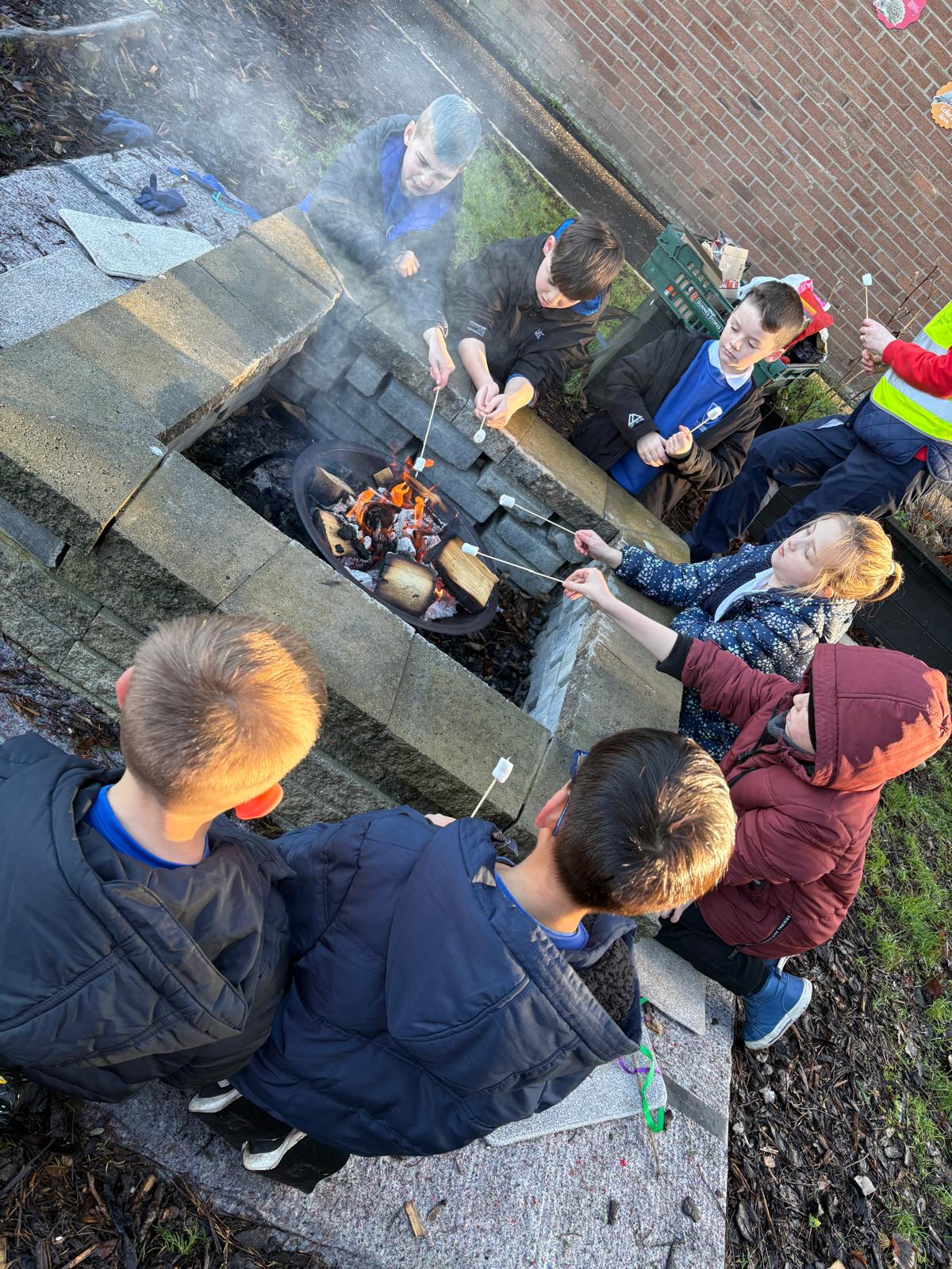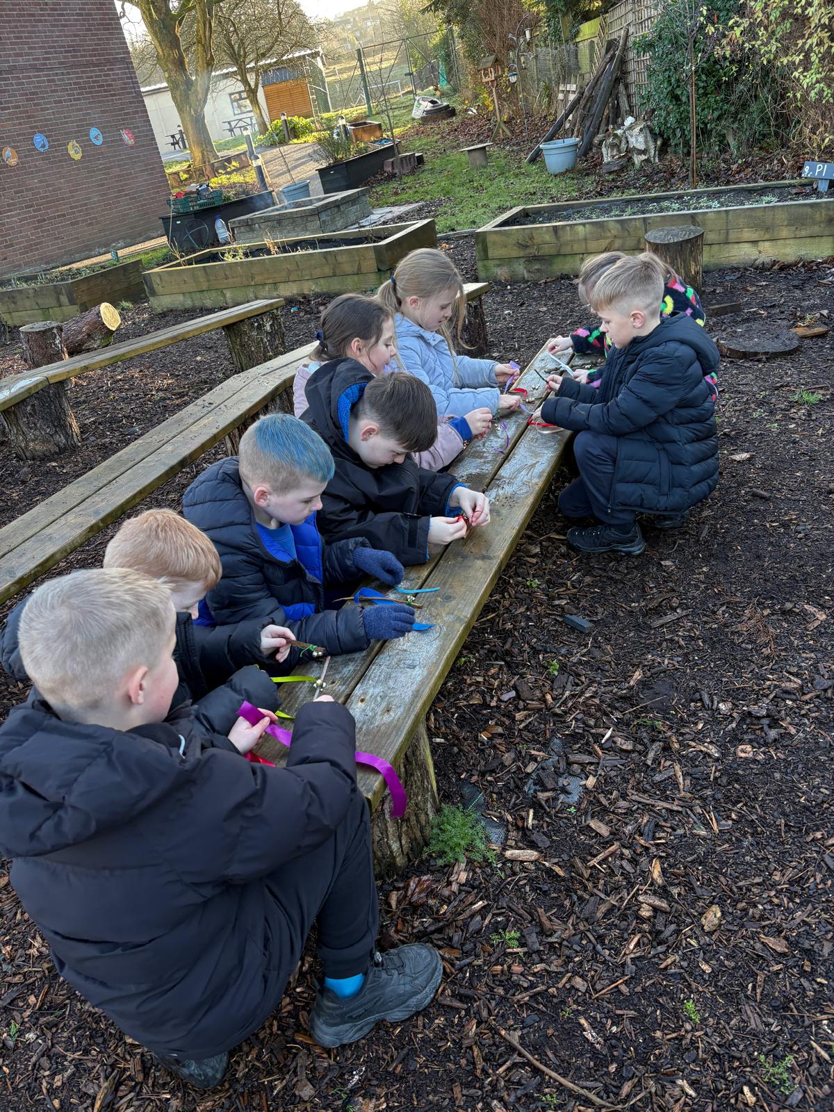 P5 learnt to tie knots while making jingle bell sticks. they used sticks to tie small bells and ribbons too. They also learnt about fire safety – how to light a fire safely and how to use water to put it out.