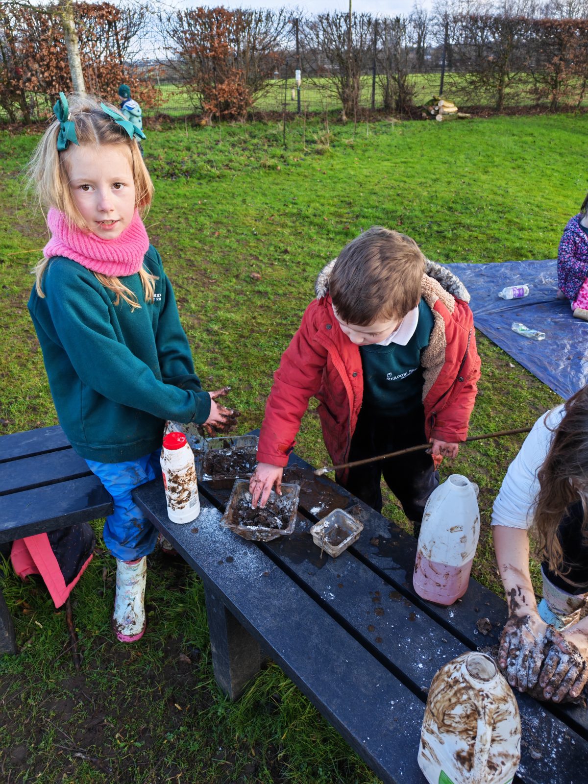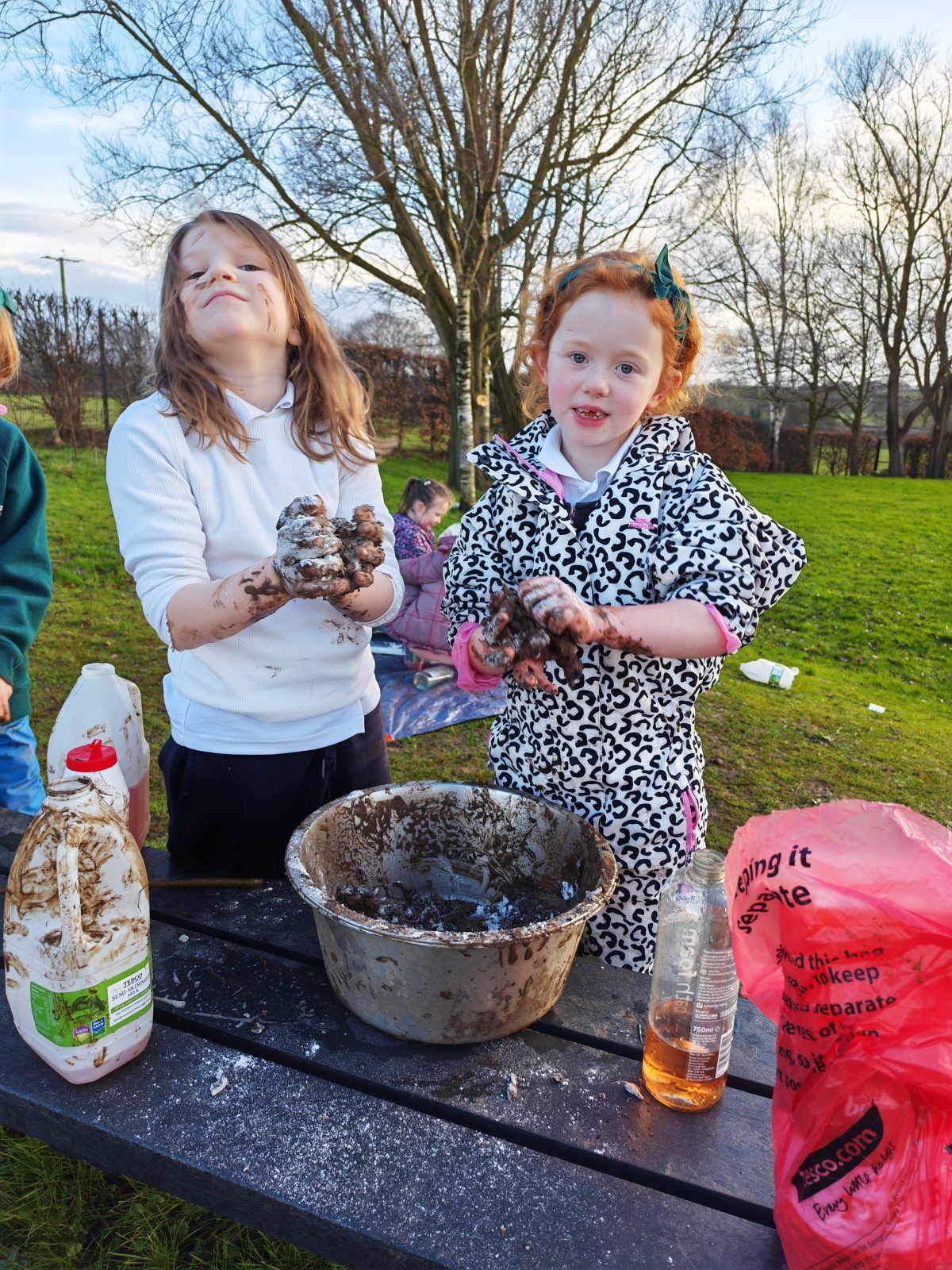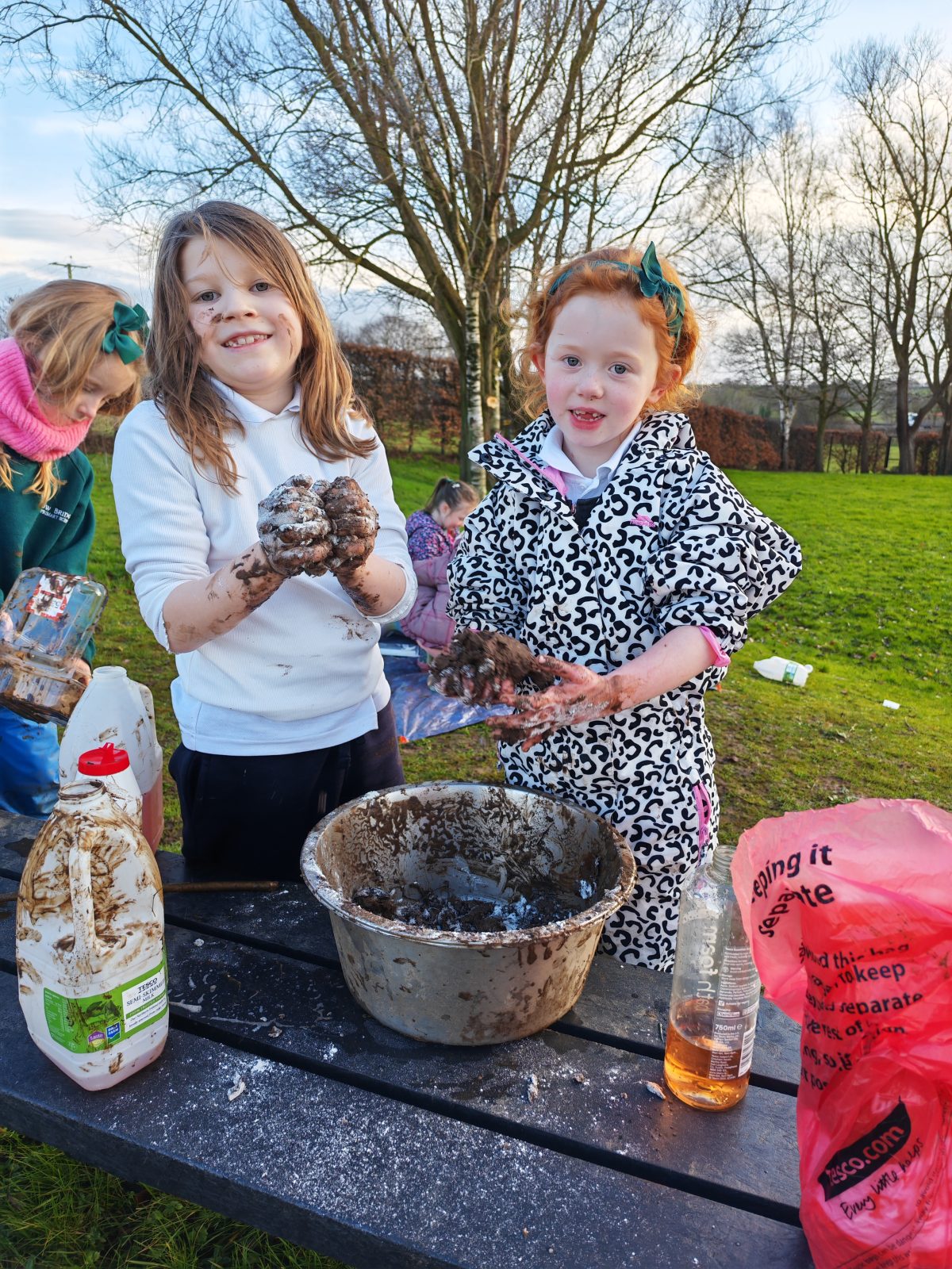 Making mud press and cakes. Making mud dough. Potion making. Signs and pictures. Boys made a home from wood in the willow dome for stitch, a cuddly toy. They made signs for the home. Looks pulled up to make a home. Tree climbing. When they get stuck, taking them through what to do to get down rather than rescuing all the time