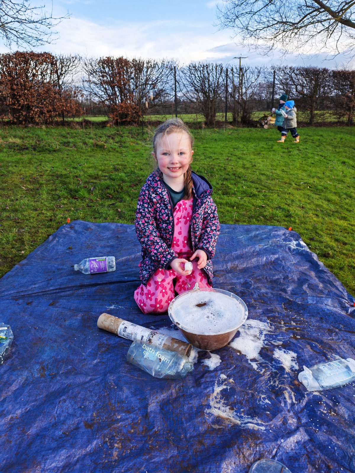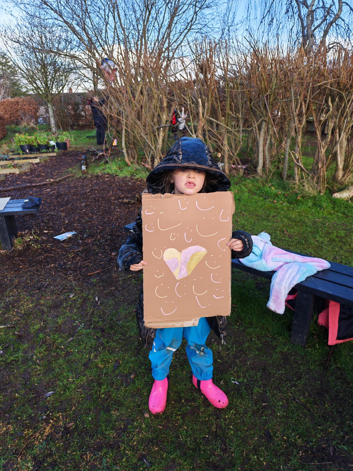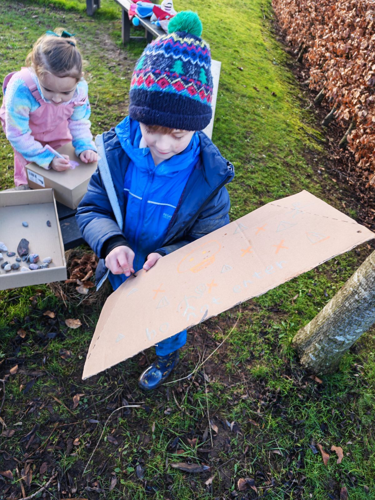 Making mud press and cakes. Making mud dough. Potion making. Signs and pictures. Boys made a home from wood in the willow dome for stitch, a cuddly toy. They made signs for the home. Looks pulled up to make a home. Tree climbing. When they get stuck, taking them through what to do to get down rather than rescuing all the time