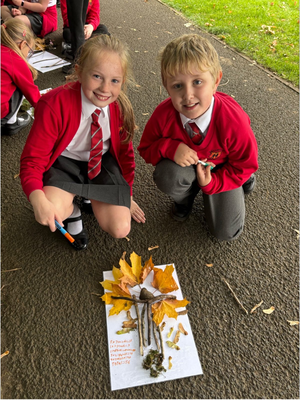 P6 visited the Six Mile Water Park to create their own pictures for display in the ‘Forest School Art Gallery’. They first gathered natural resources in teams. After this they assigned values (below 10) to each resource and by the end they could work out the value of their picture using their multiplication facts. Children created a great range of pictures with a variety of natural resources used.
