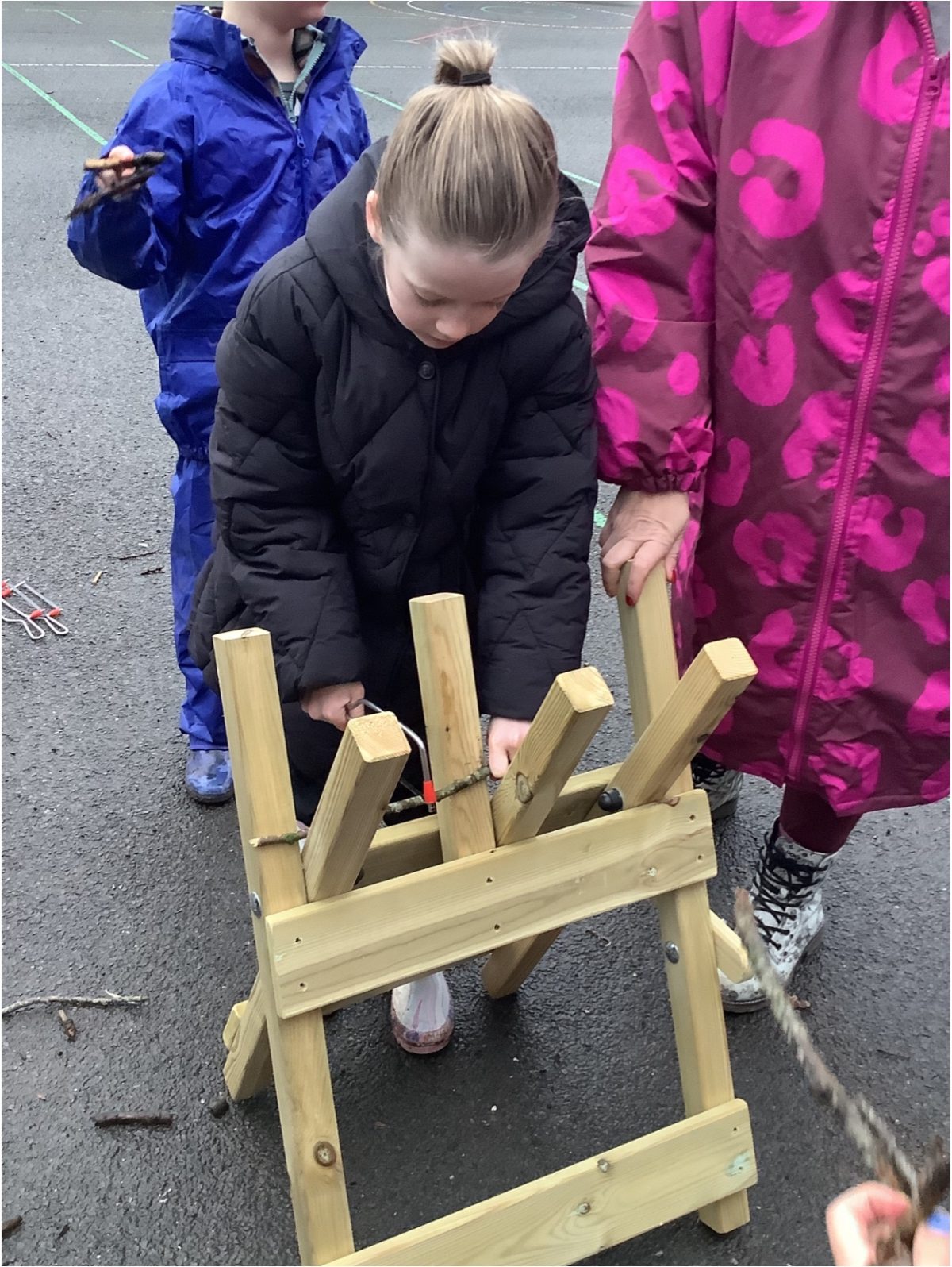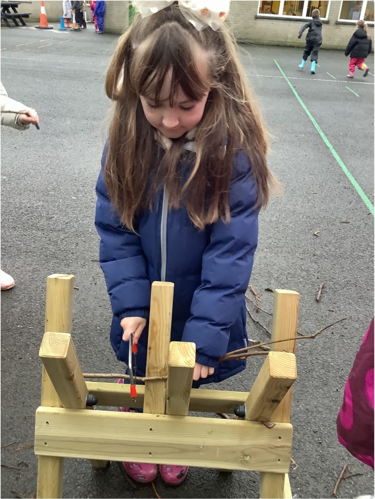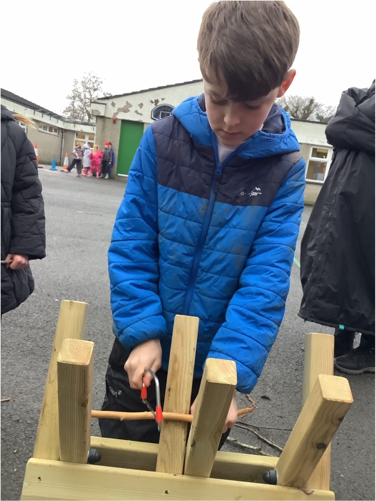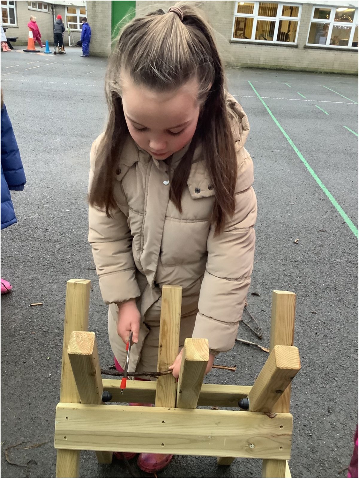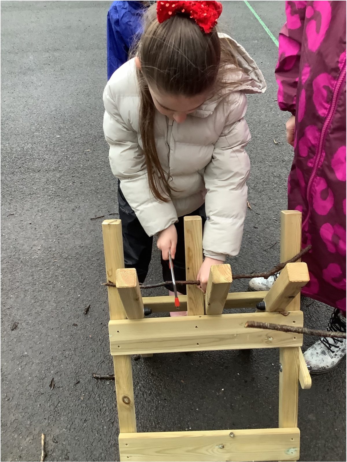 In class we were learning how to measure. We linked this to our outdoor learning by measuring and marking a twig and then sawing it to the correct length. We then used these twigs to make Christmas decorations.