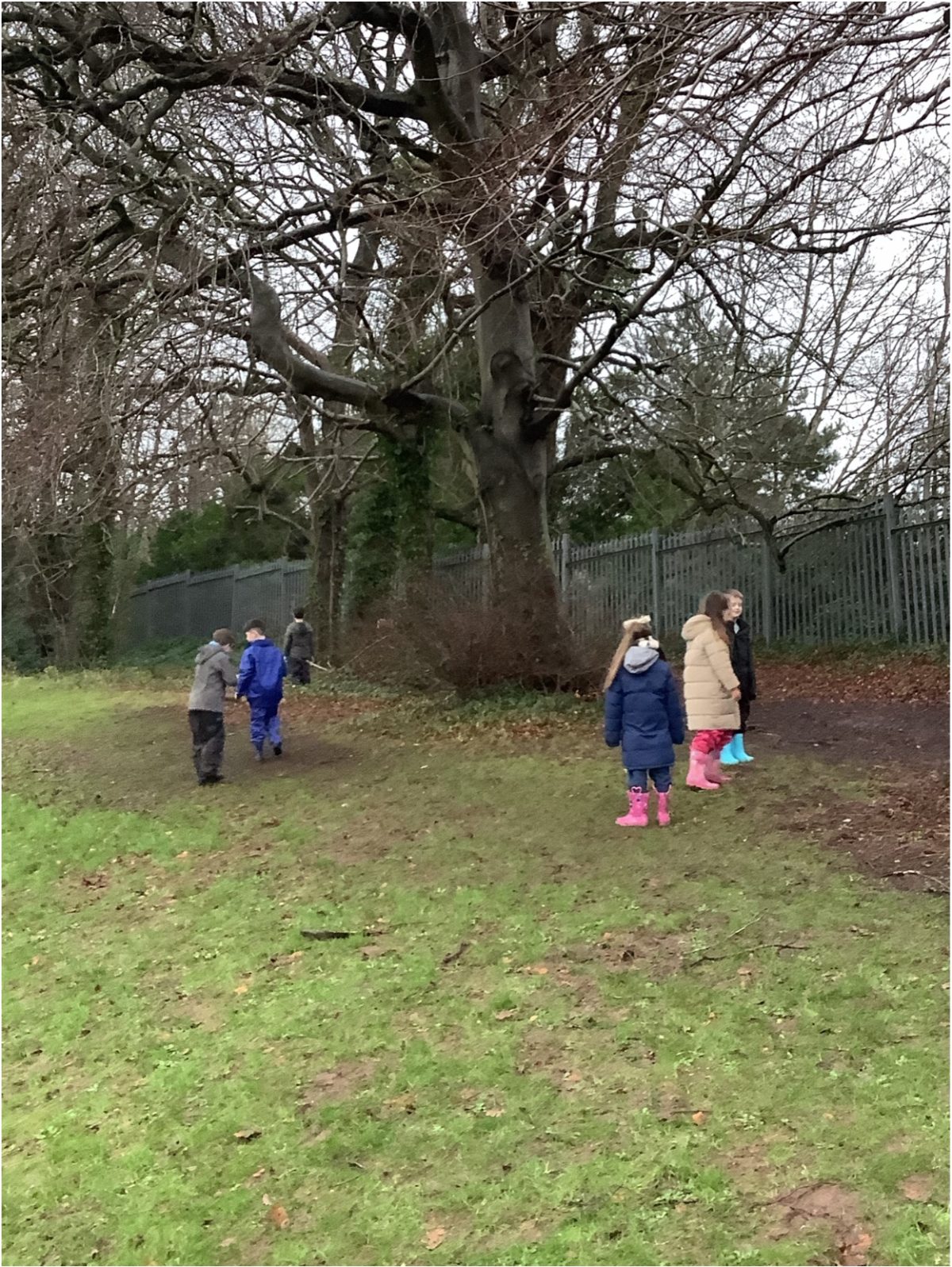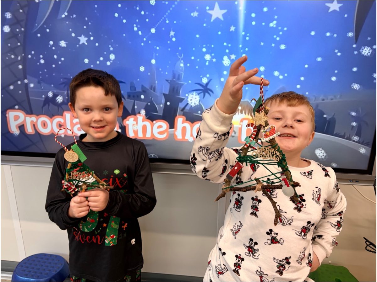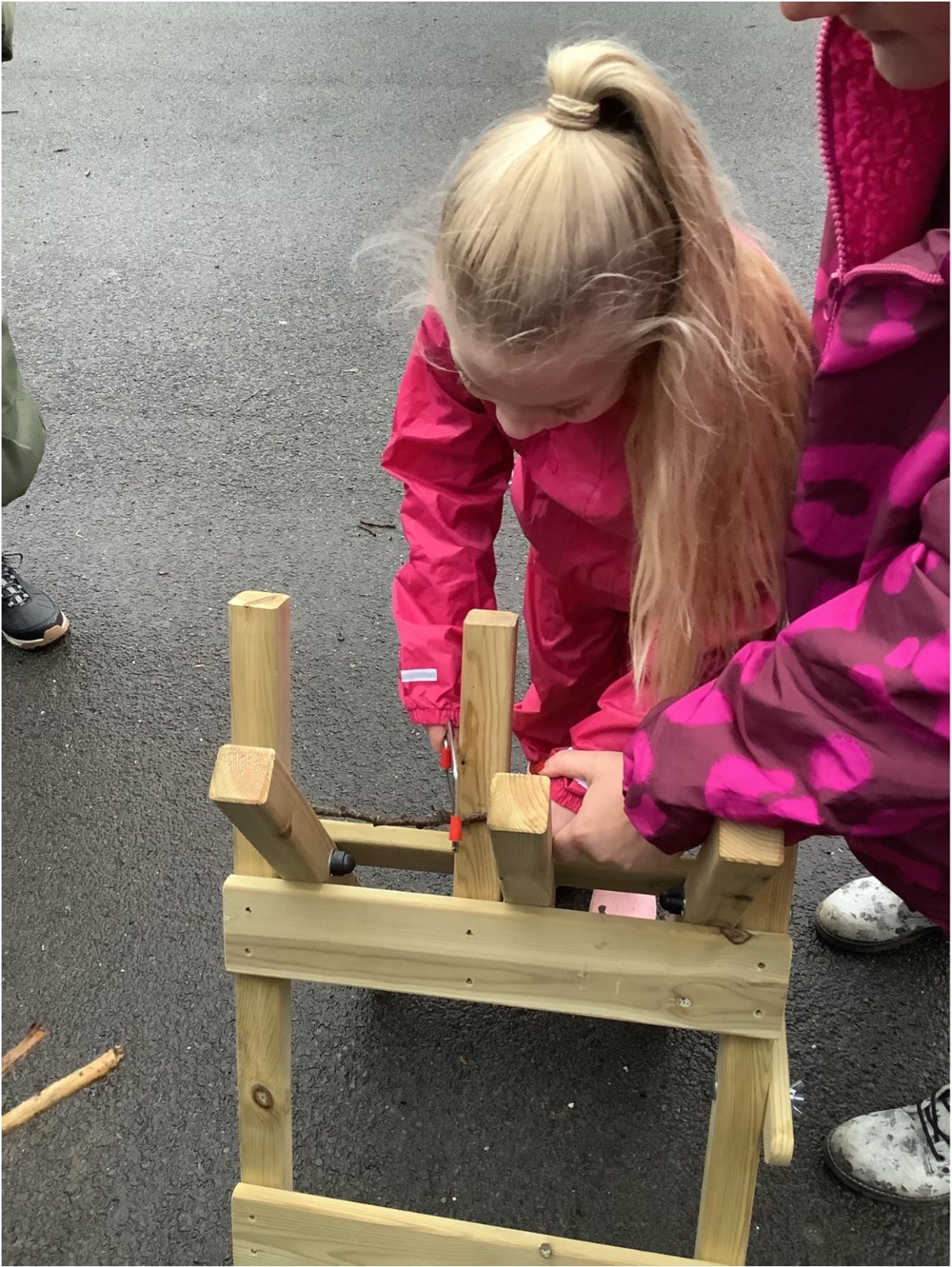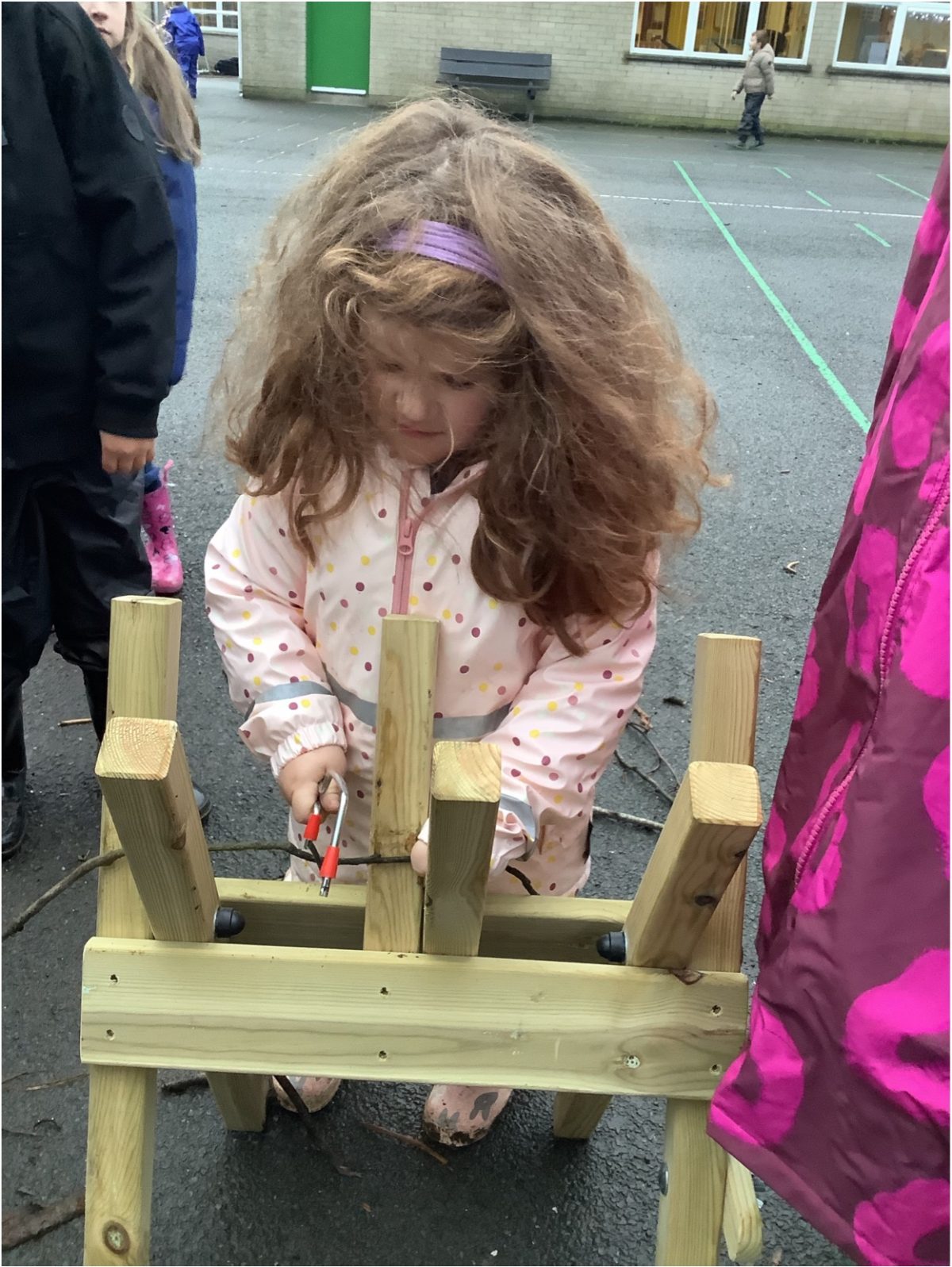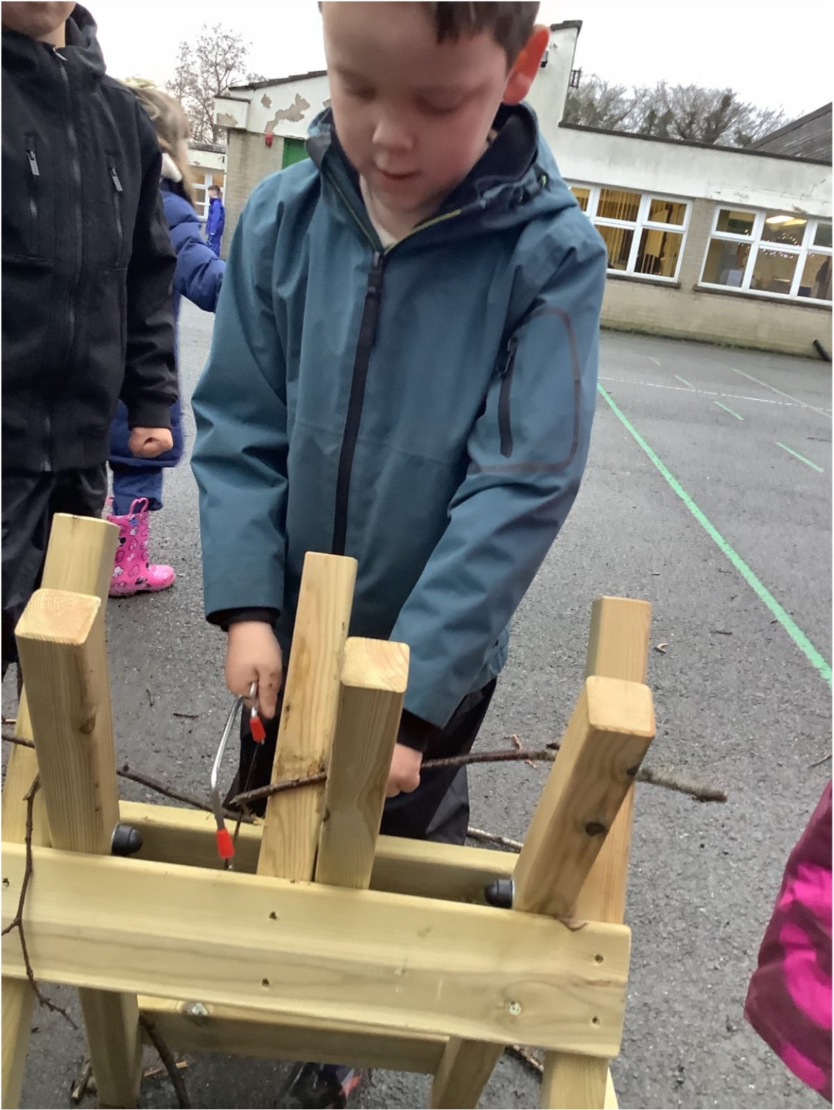 In class we were learning how to measure. We linked this to our outdoor learning by measuring and marking a twig and then sawing it to the correct length. We then used these twigs to make Christmas decorations.