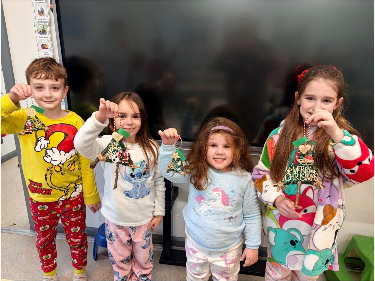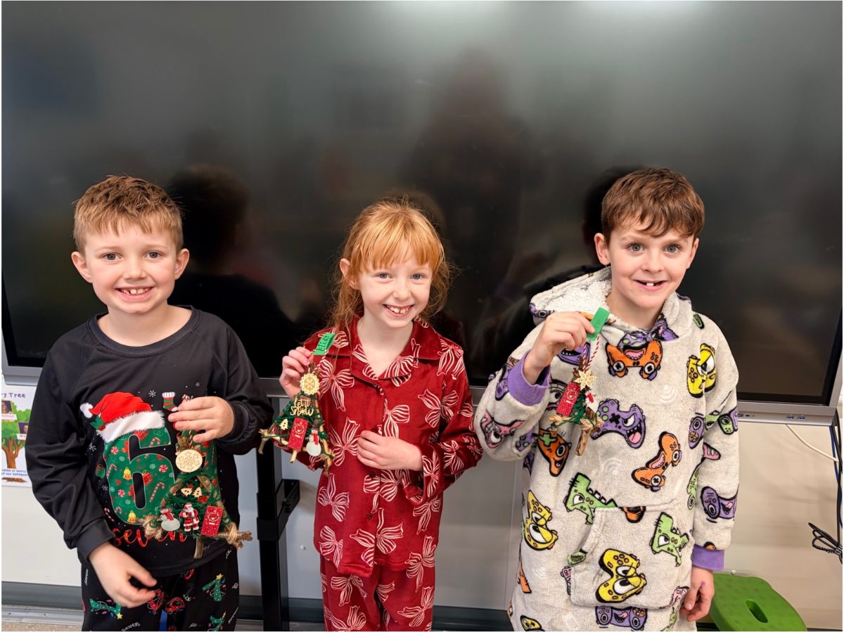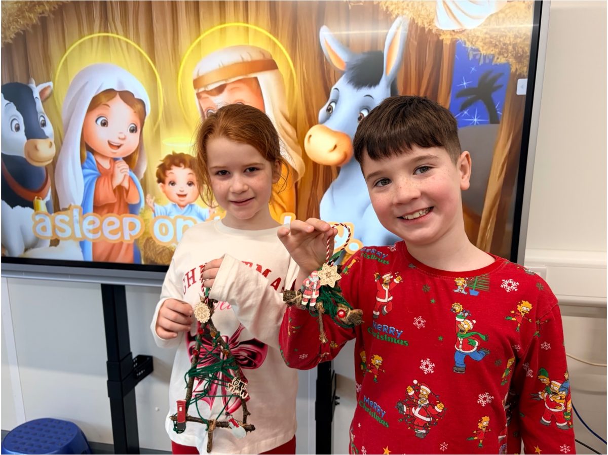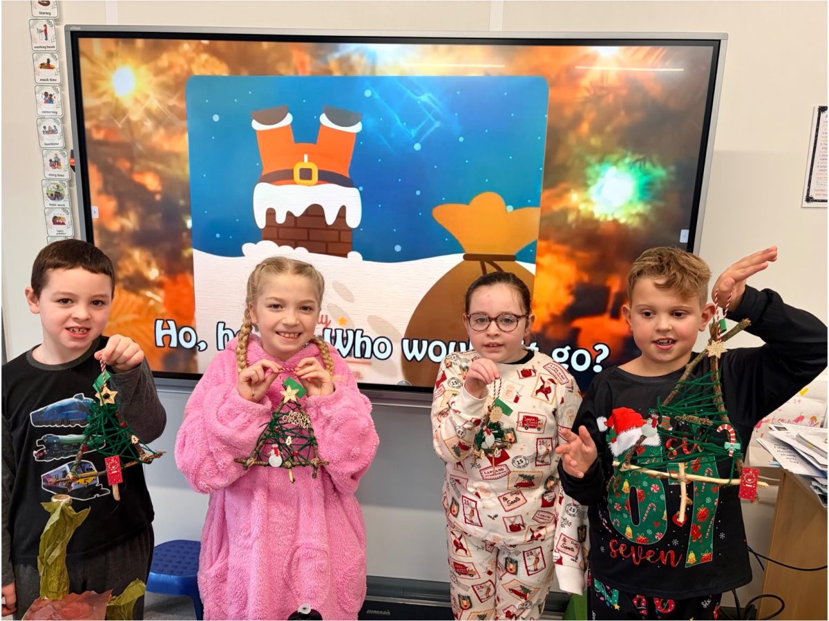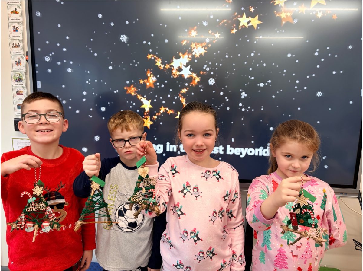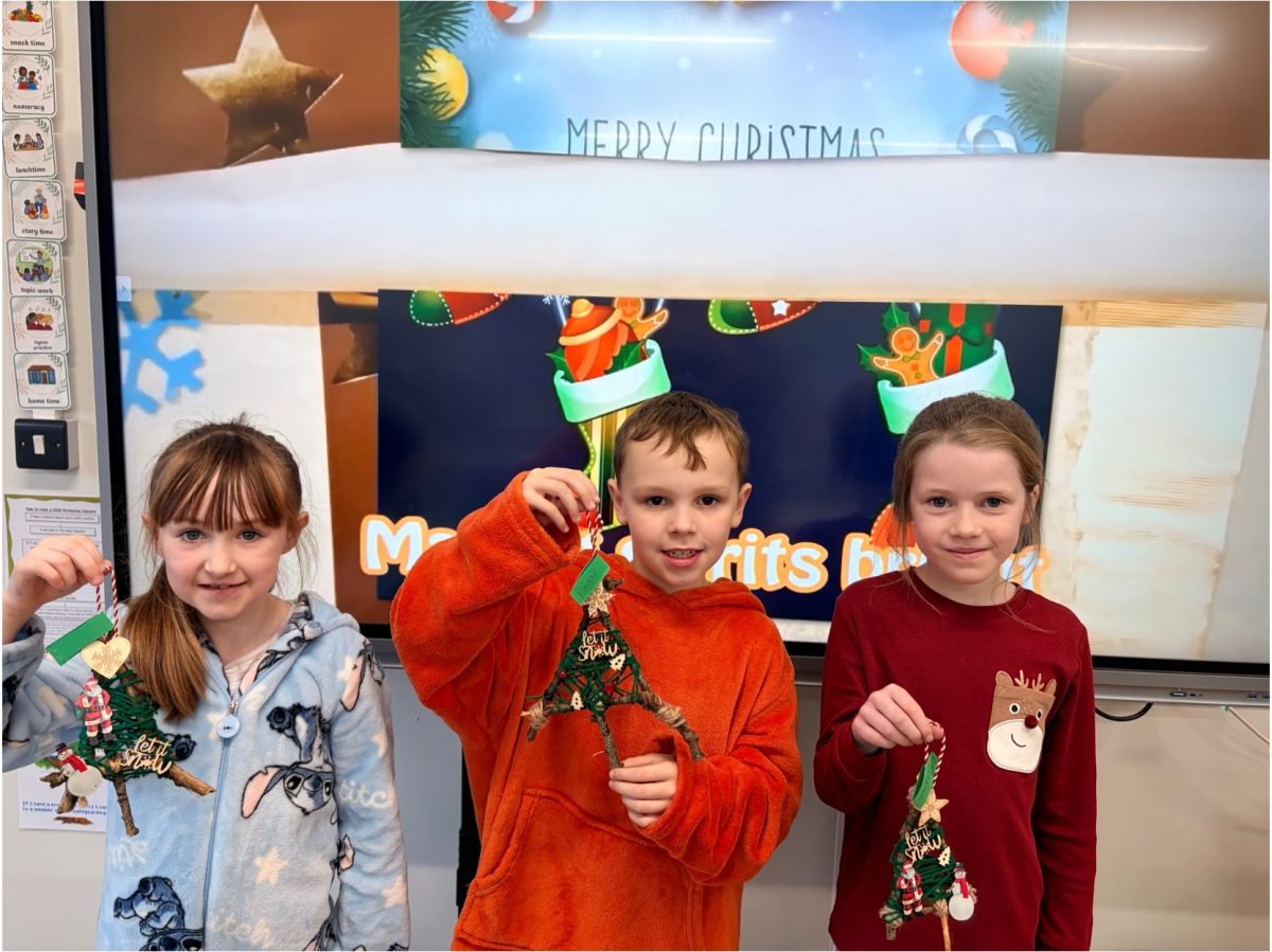 In class we were learning how to measure. We linked this to our outdoor learning by measuring and marking a twig and then sawing it to the correct length. We then used these twigs to make Christmas decorations.