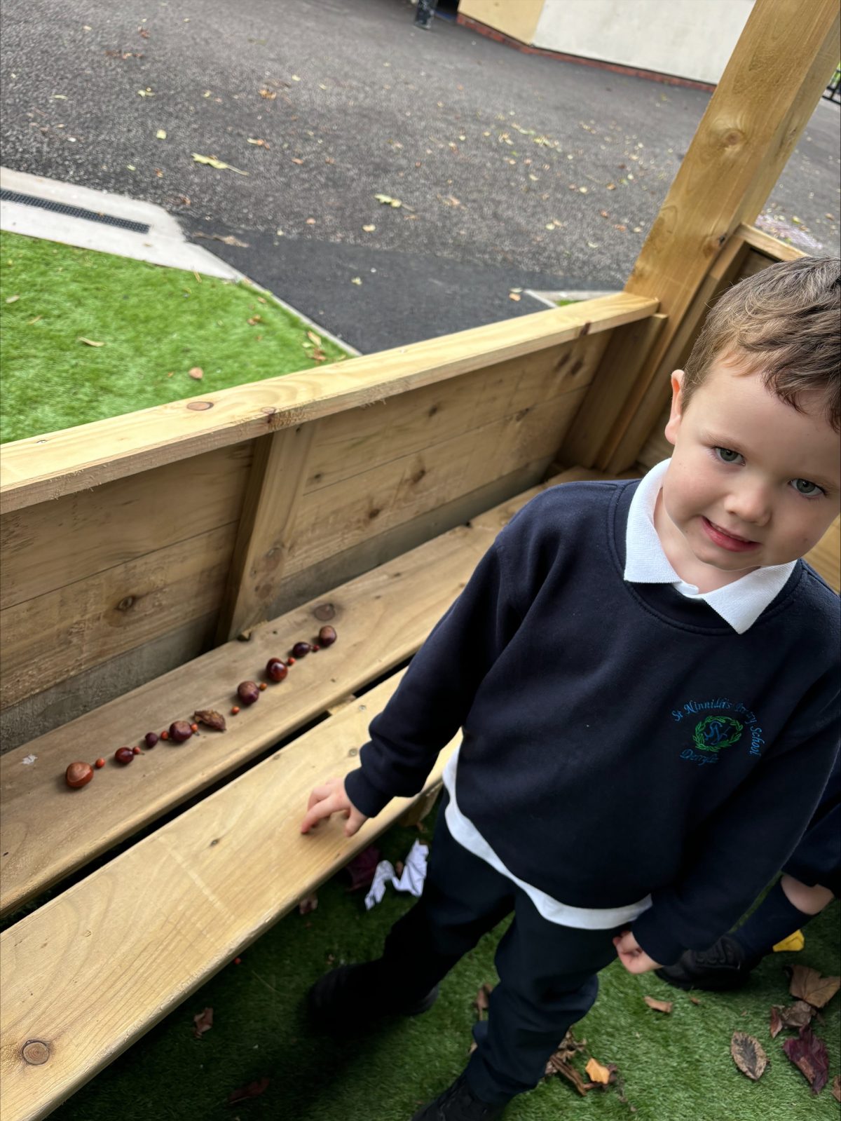 Sorting materials gathered on our Autumn Walk for colour and into groups. Then we made two part nature patterns
