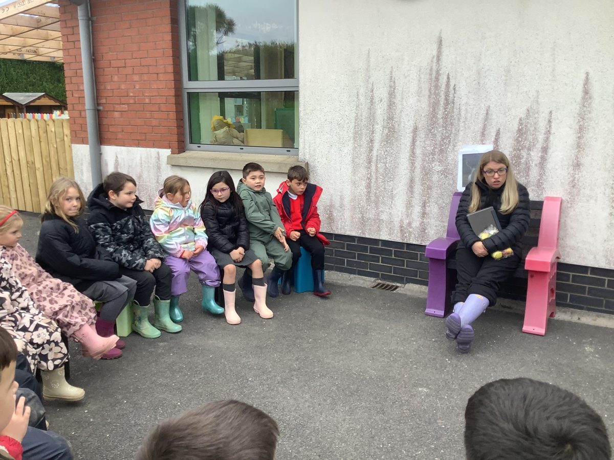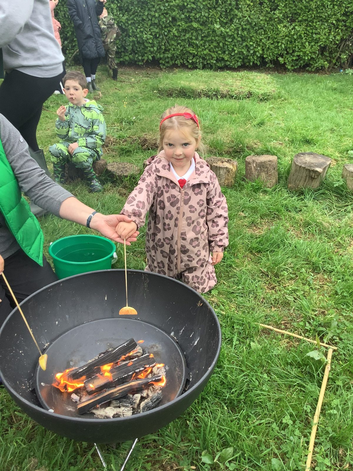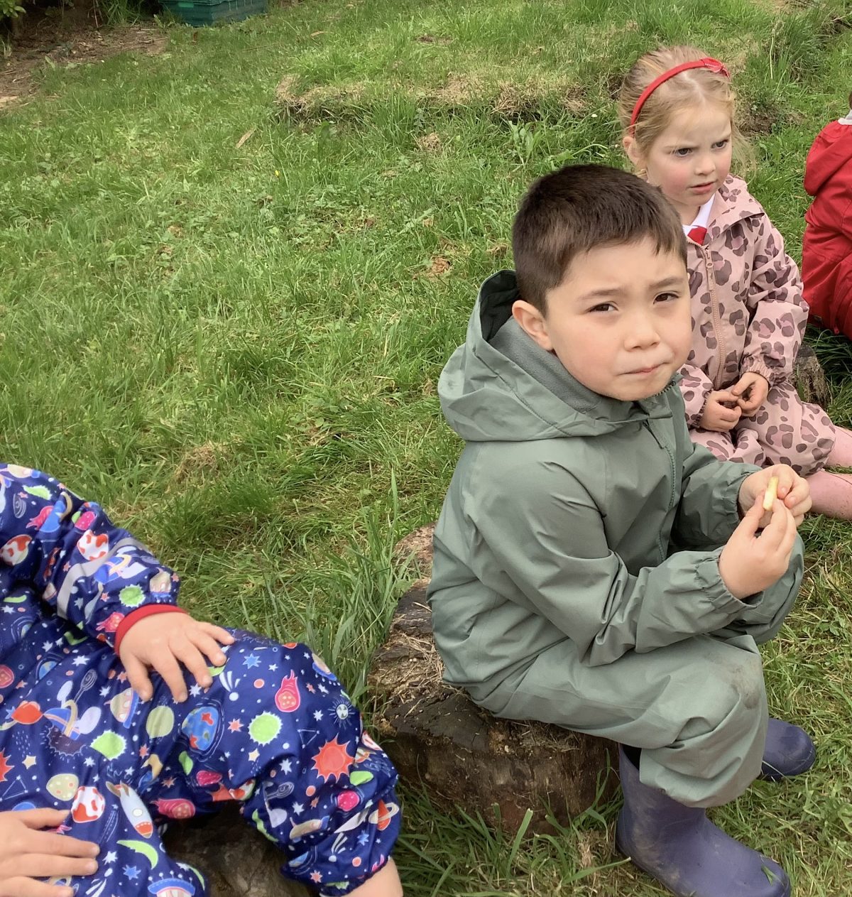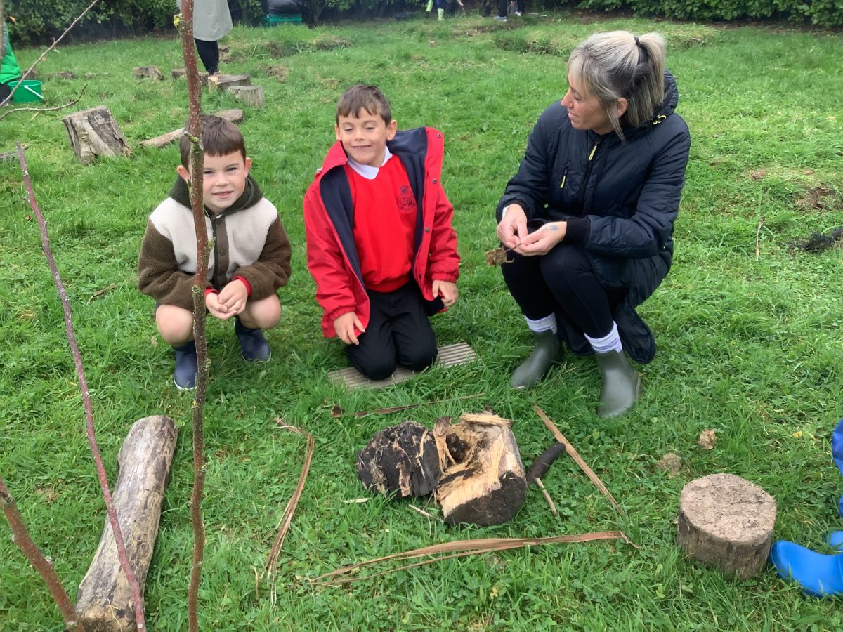 The boys and girls were very excited to invite P3/4 to join us for Forest School today. We began by gathering together outside and our regular boys and girls enjoyed explaining boundary flags and whistle blows to P3/4. They taught their friends our Forest School song and then we all walked to our site. Mrs McClure had set up a fire today, and we sat on our log circle to sing some campfire songs and listened carefully to the ‘dragon’ safety rules for fires.
