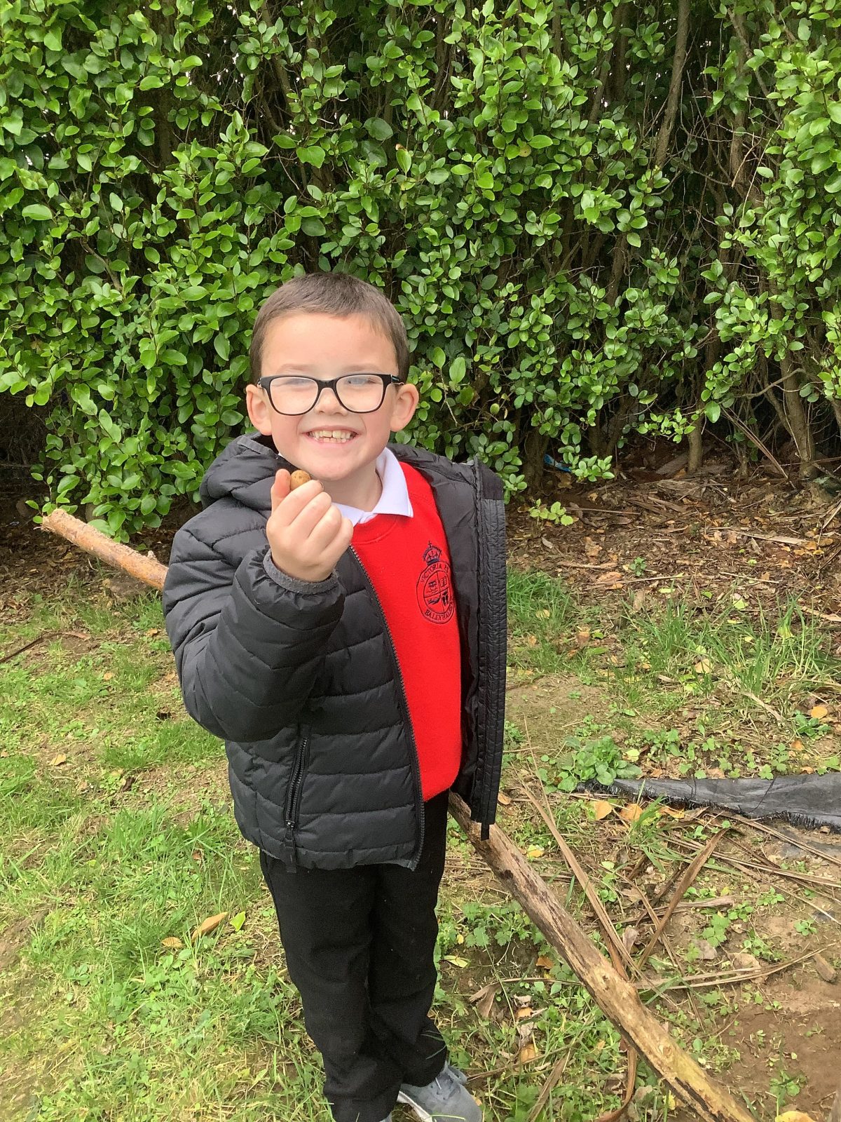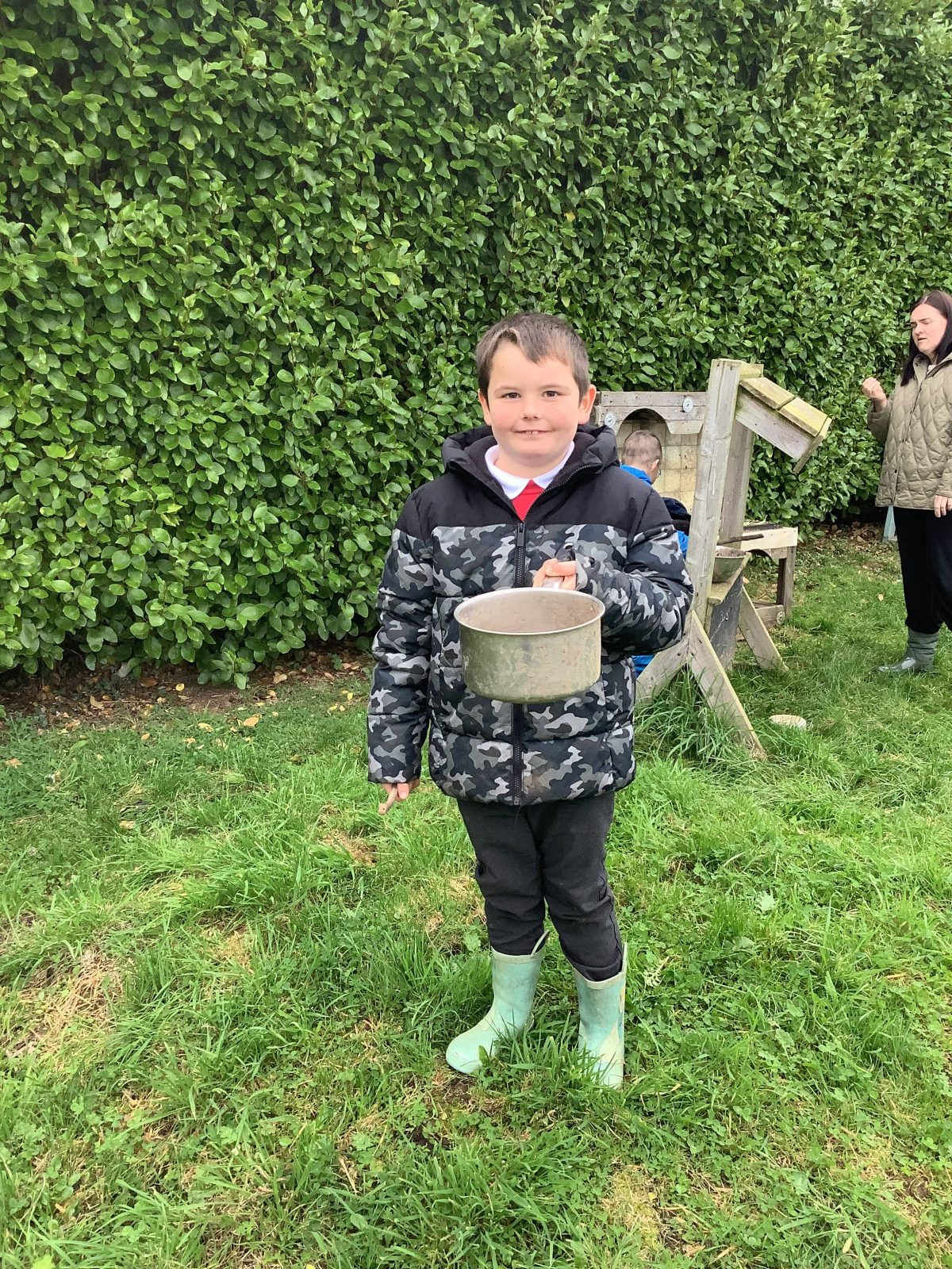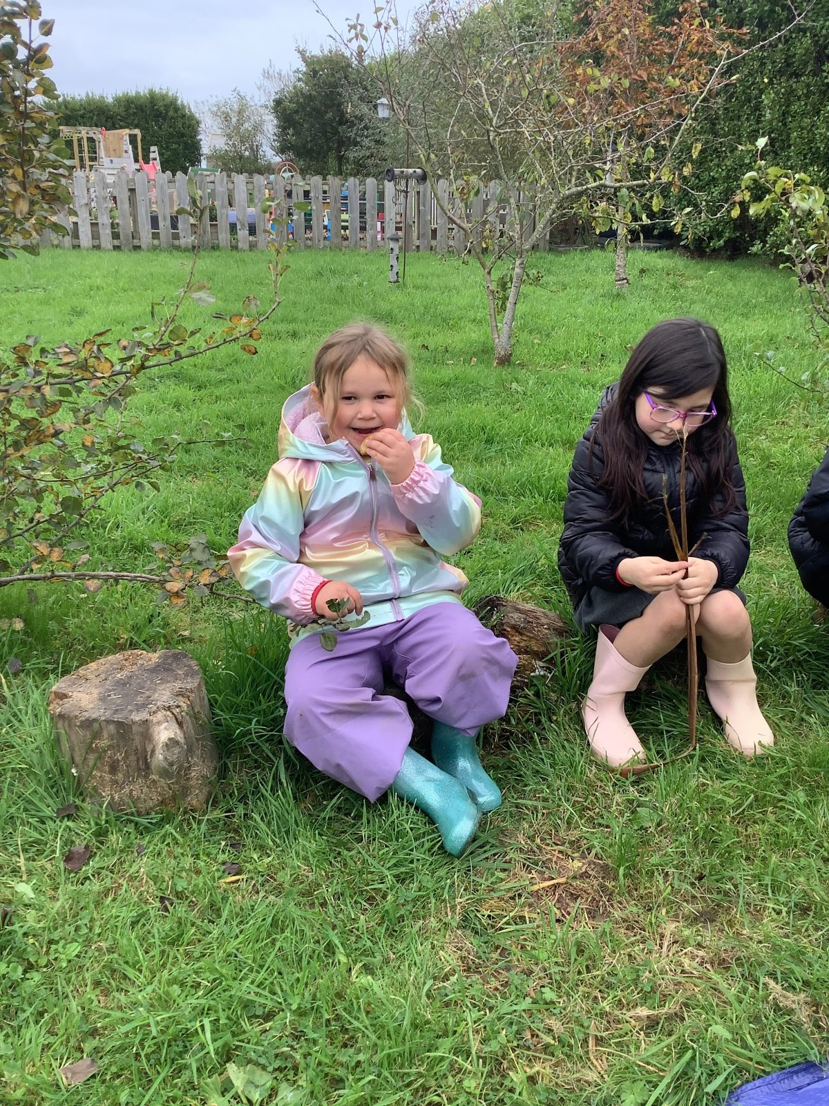 The boys and girls were very excited to invite P3/4 to join us for Forest School today. We began by gathering together outside and our regular boys and girls enjoyed explaining boundary flags and whistle blows to P3/4. They taught their friends our Forest School song and then we all walked to our site. Mrs McClure had set up a fire today, and we sat on our log circle to sing some campfire songs and listened carefully to the ‘dragon’ safety rules for fires.