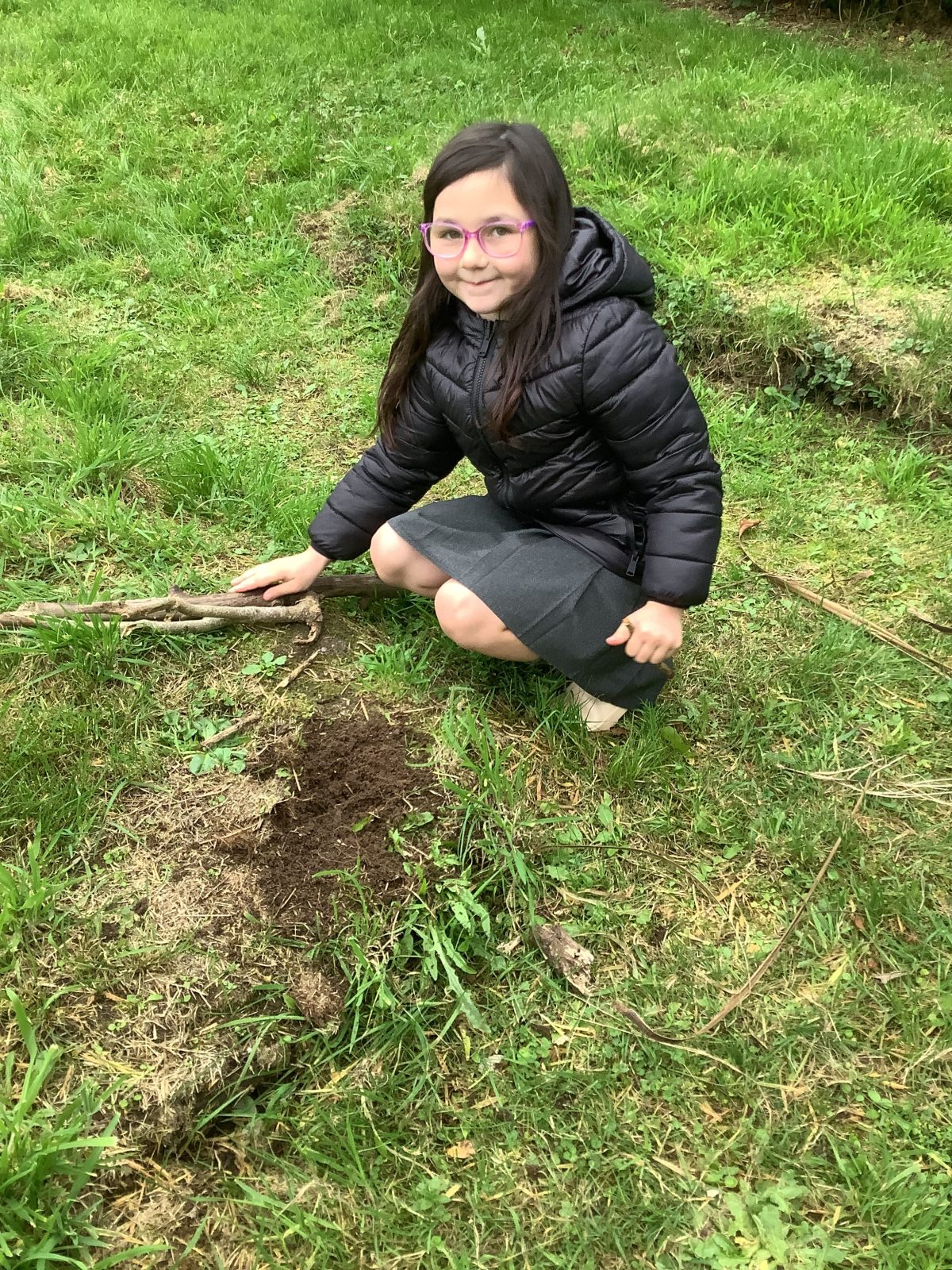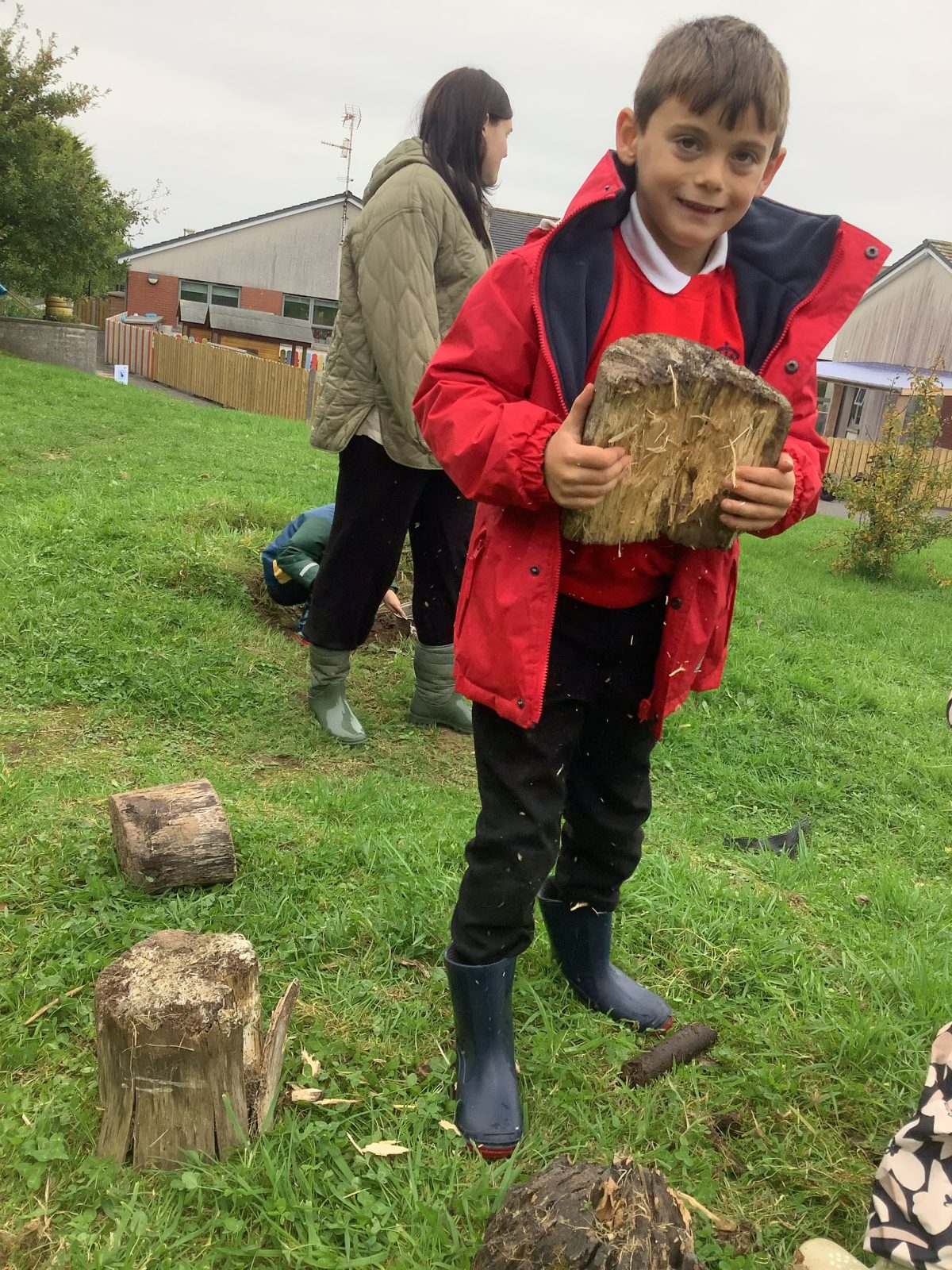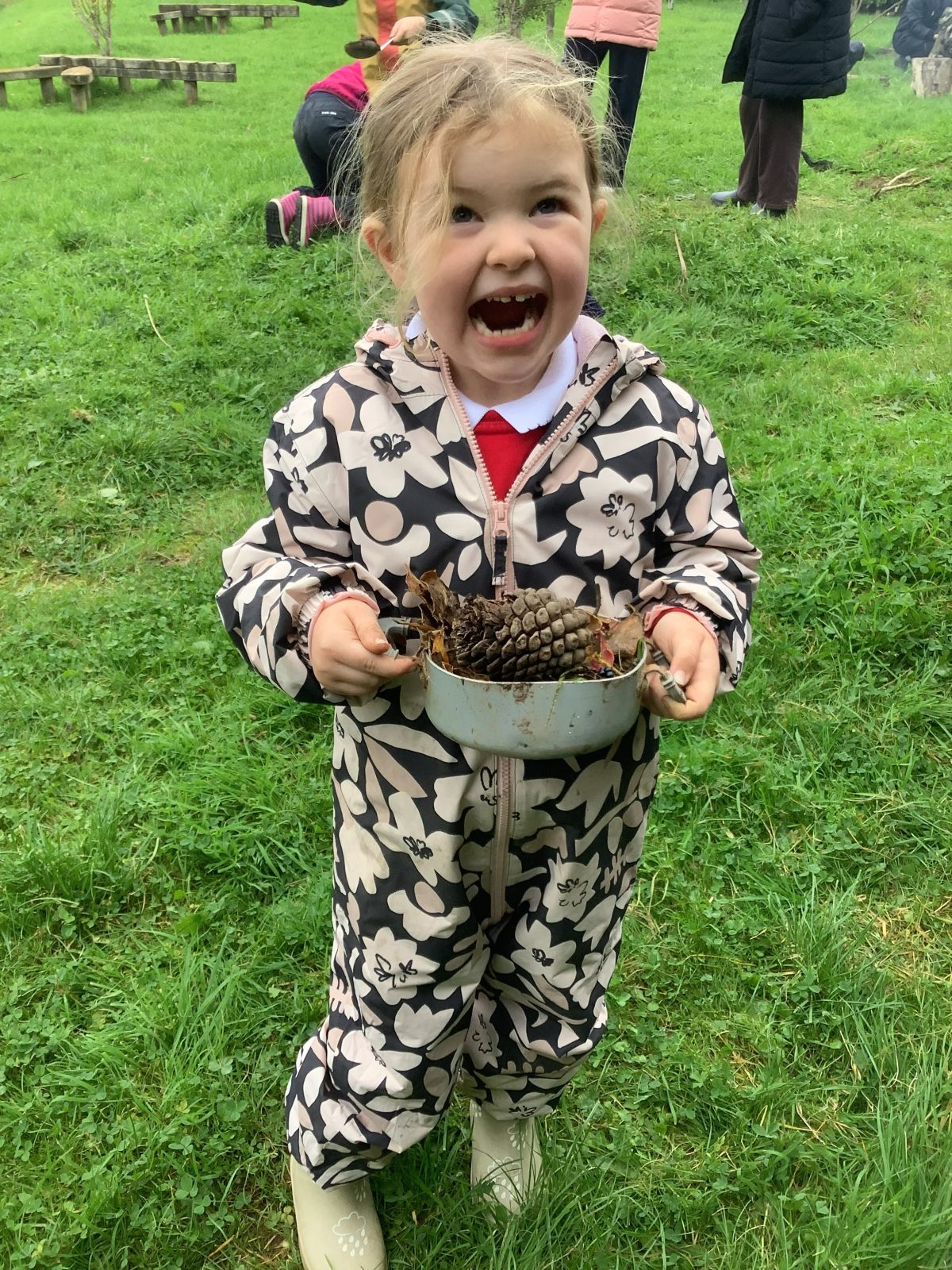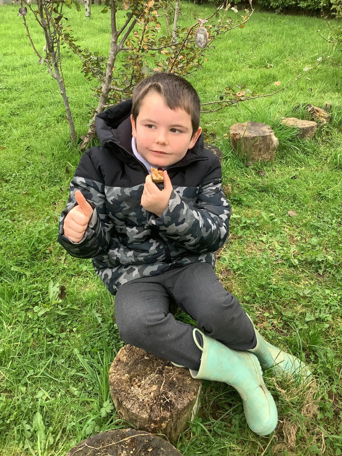 The boys and girls were very excited to invite P3/4 to join us for Forest School today. We began by gathering together outside and our regular boys and girls enjoyed explaining boundary flags and whistle blows to P3/4. They taught their friends our Forest School song and then we all walked to our site. Mrs McClure had set up a fire today, and we sat on our log circle to sing some campfire songs and listened carefully to the ‘dragon’ safety rules for fires.