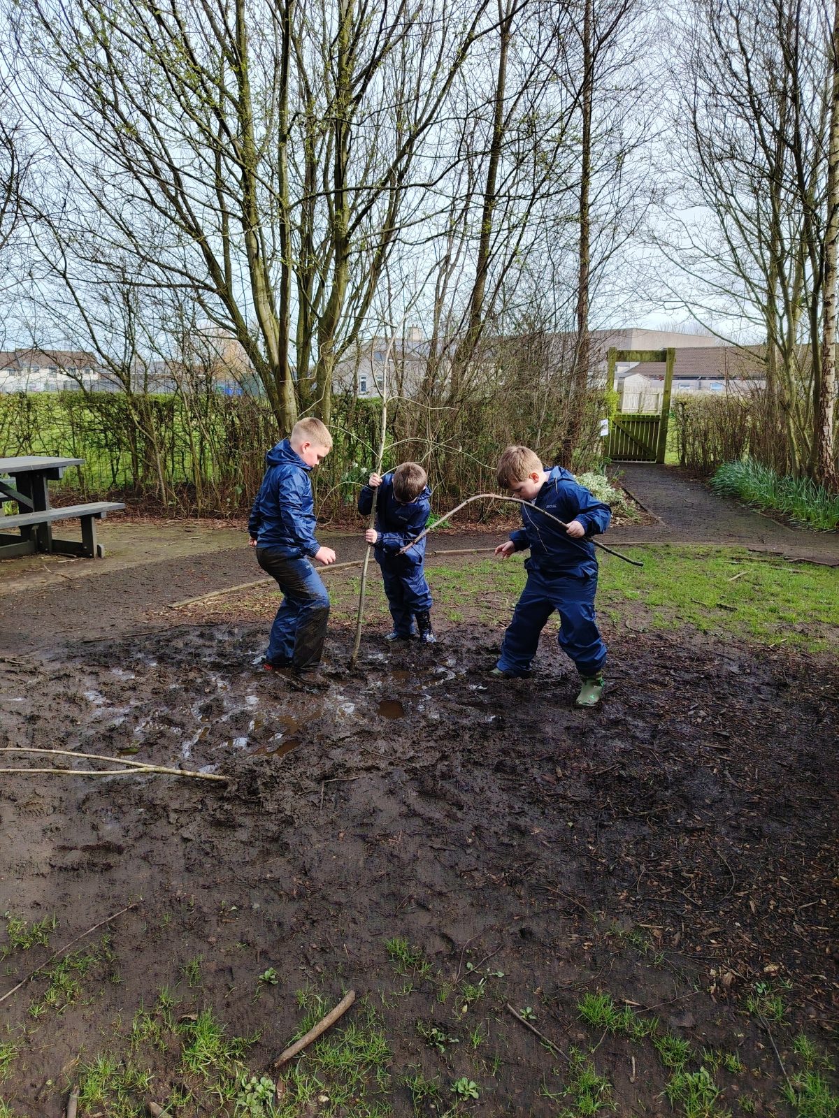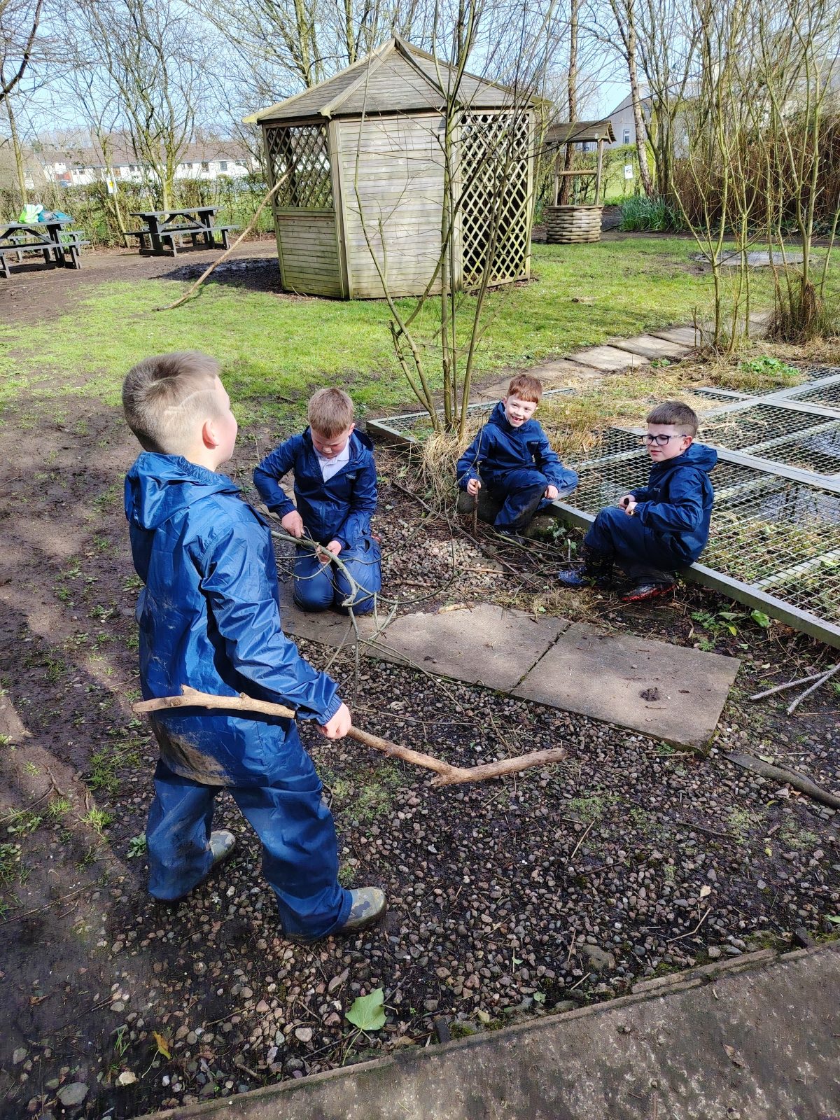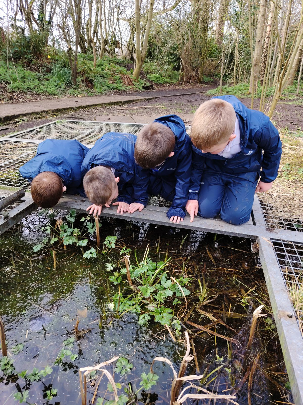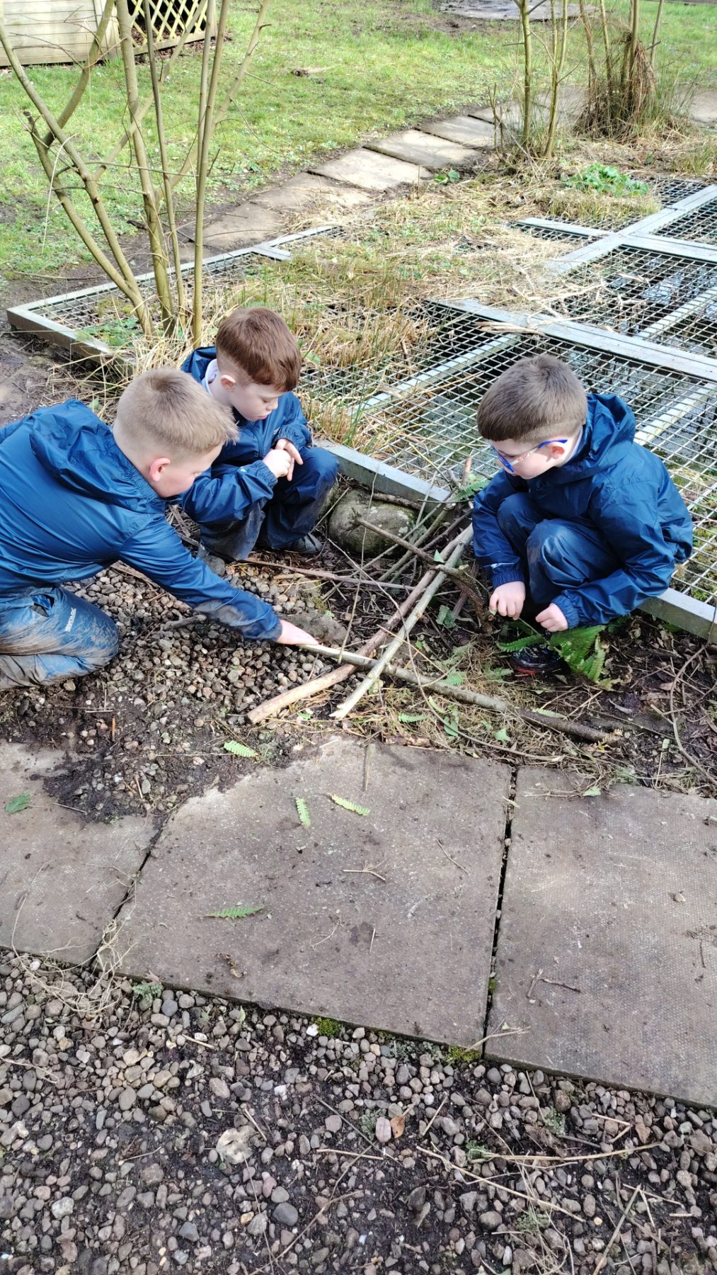 This week we were learning about the life cycle of a frog as we had lots of frog spawn in the wildlife pond and the children were showing lots of interest in this previously. We started of the session with doing a frog jump challenge. Where the children found a stick and had to jump like a frog to see how far they could jump then put their stick down where they landed. Then they had to do it again to see if they could beat their first jump. The children really enjoyed this. Then we talked about what they knew about frogs. They were able to tell me that they eat bugs and had long tongues. After this the children were able to look in the pond and scoop some frogs spawn out to have a closer look at it. They said it was gooey, they also noticed which was new frog spawn and which was older by how big the tadpoles were getting. Then the children were asked if they could make a home for the frogs, so they set to work gathering what they needed. They talked about how the frogs were going to get in. Some of the other children went off to build with the big sticks and also trying to balance sticks in the really muddy areas of the wildlife garden.