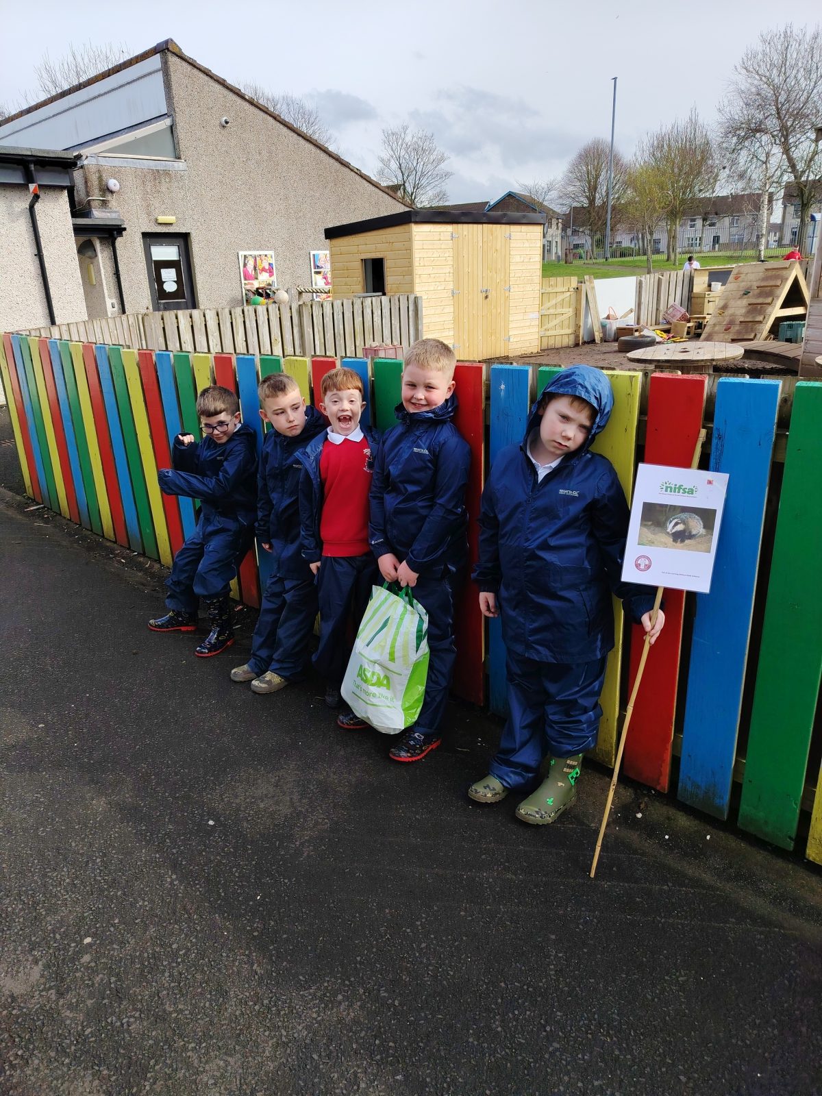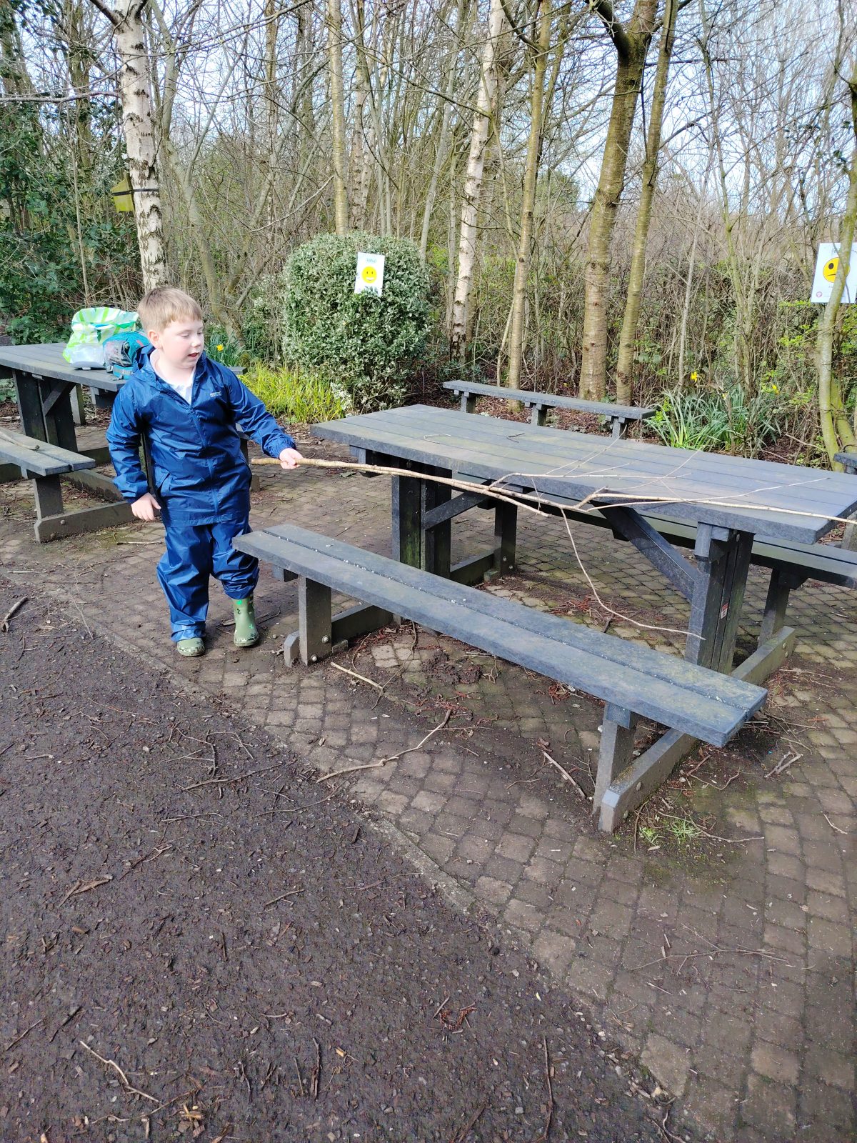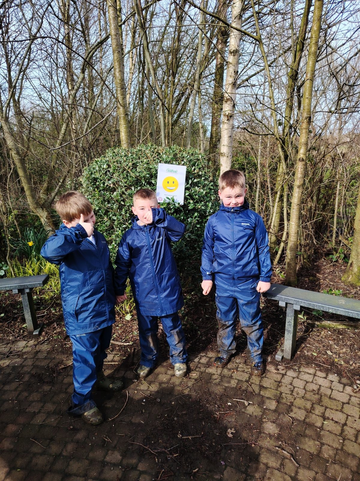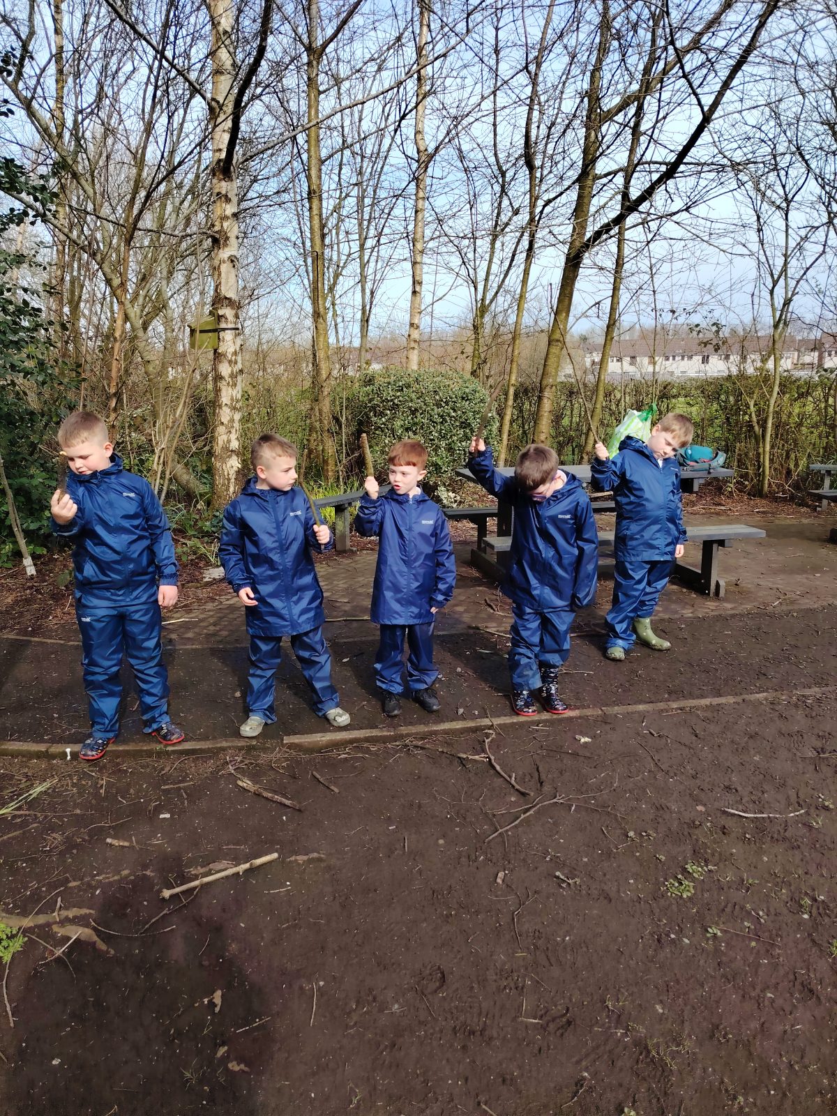 This week we were learning about the life cycle of a frog as we had lots of frog spawn in the wildlife pond and the children were showing lots of interest in this previously. We started of the session with doing a frog jump challenge. Where the children found a stick and had to jump like a frog to see how far they could jump then put their stick down where they landed. Then they had to do it again to see if they could beat their first jump. The children really enjoyed this. Then we talked about what they knew about frogs. They were able to tell me that they eat bugs and had long tongues. After this the children were able to look in the pond and scoop some frogs spawn out to have a closer look at it. They said it was gooey, they also noticed which was new frog spawn and which was older by how big the tadpoles were getting. Then the children were asked if they could make a home for the frogs, so they set to work gathering what they needed. They talked about how the frogs were going to get in. Some of the other children went off to build with the big sticks and also trying to balance sticks in the really muddy areas of the wildlife garden.