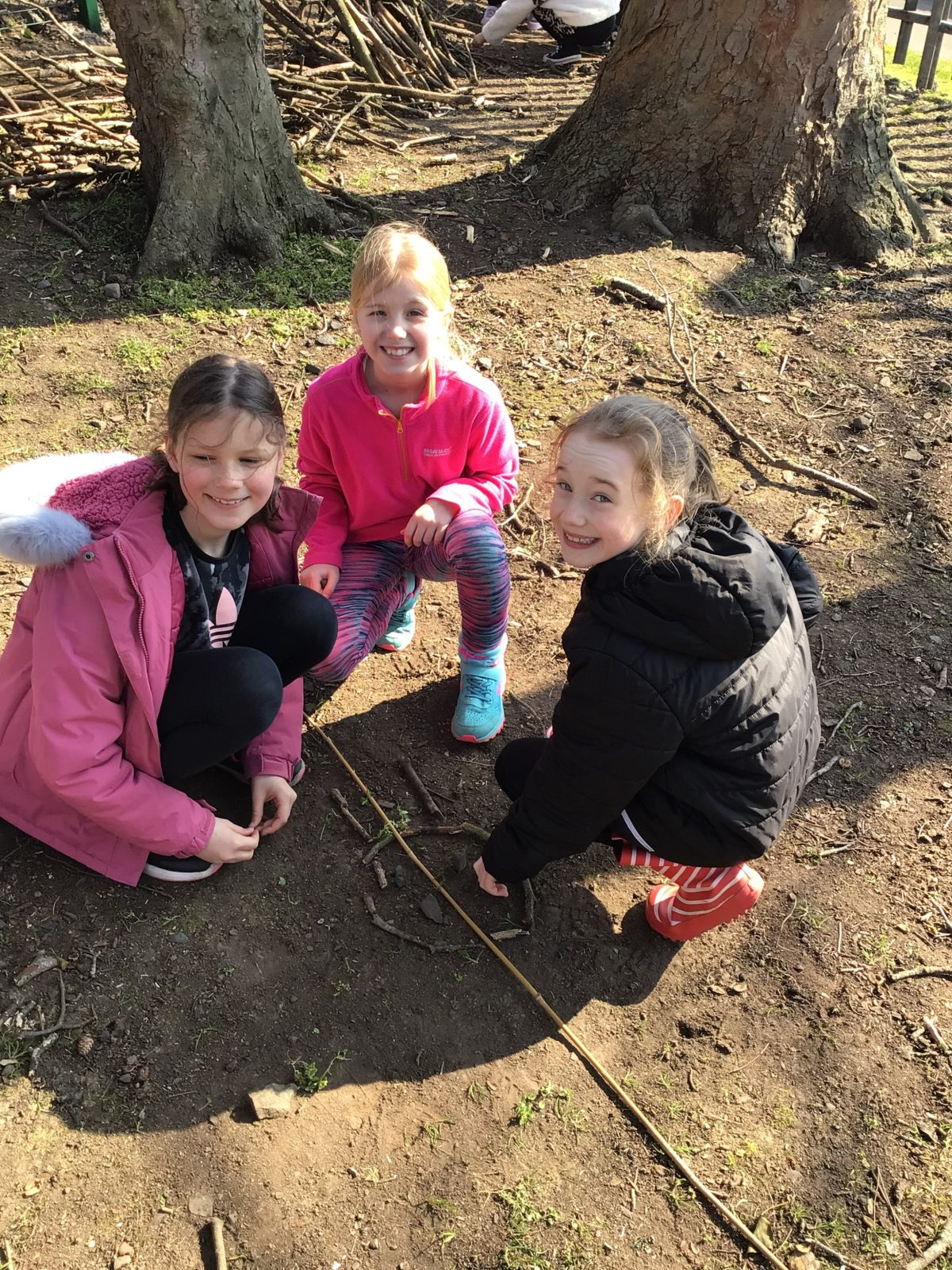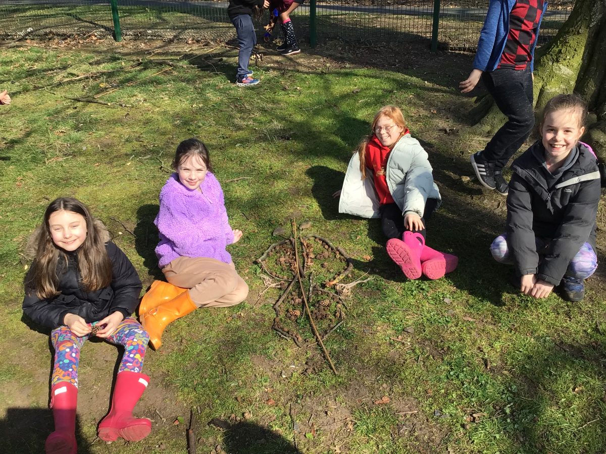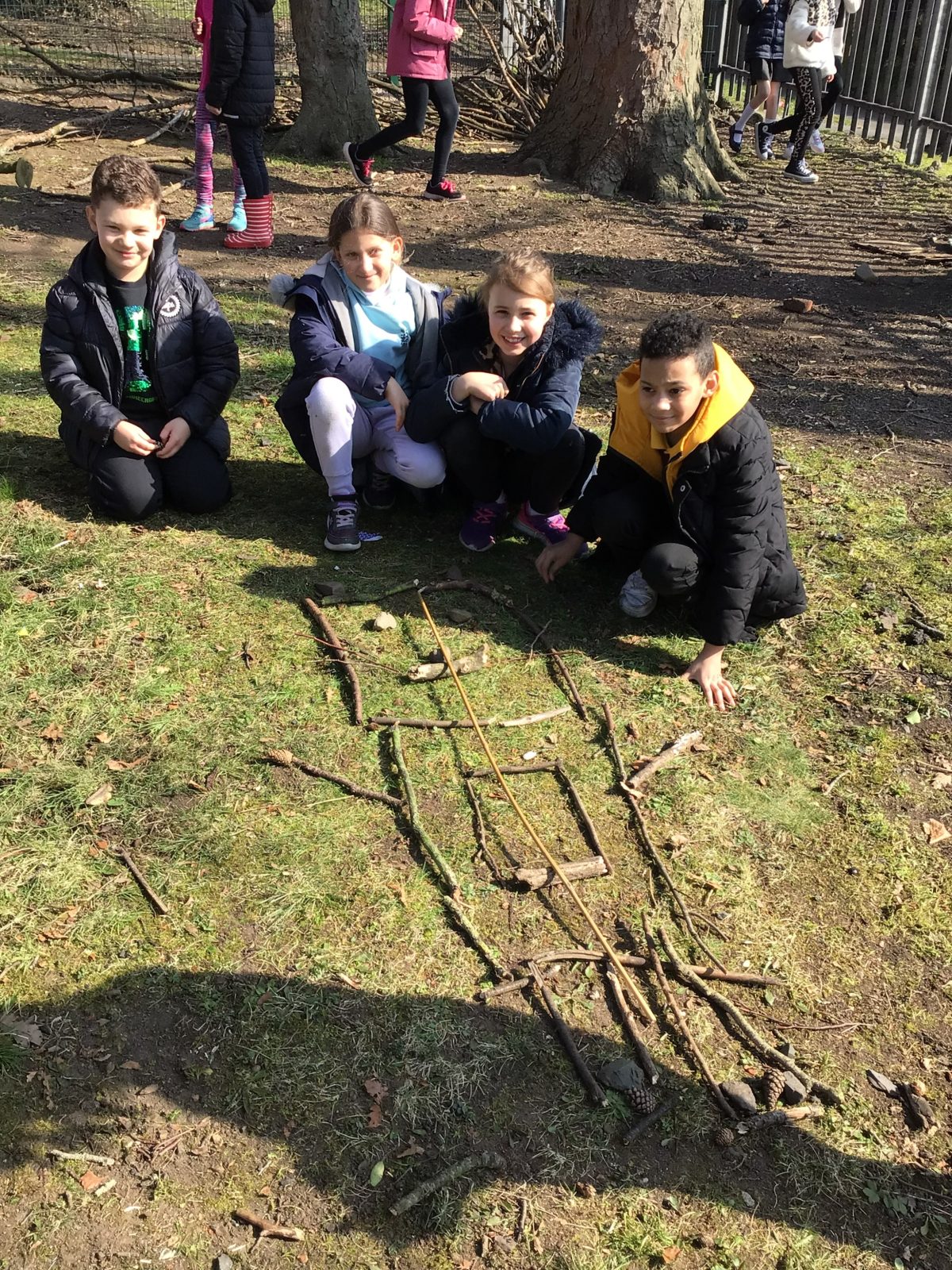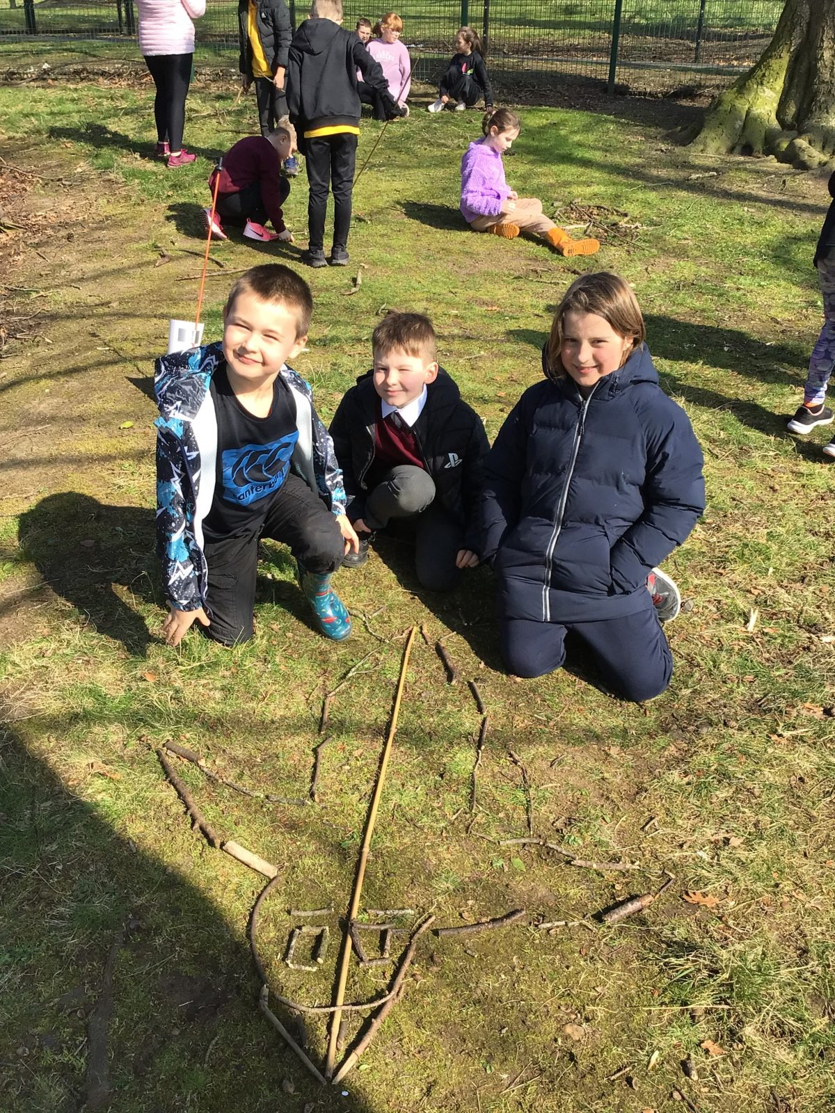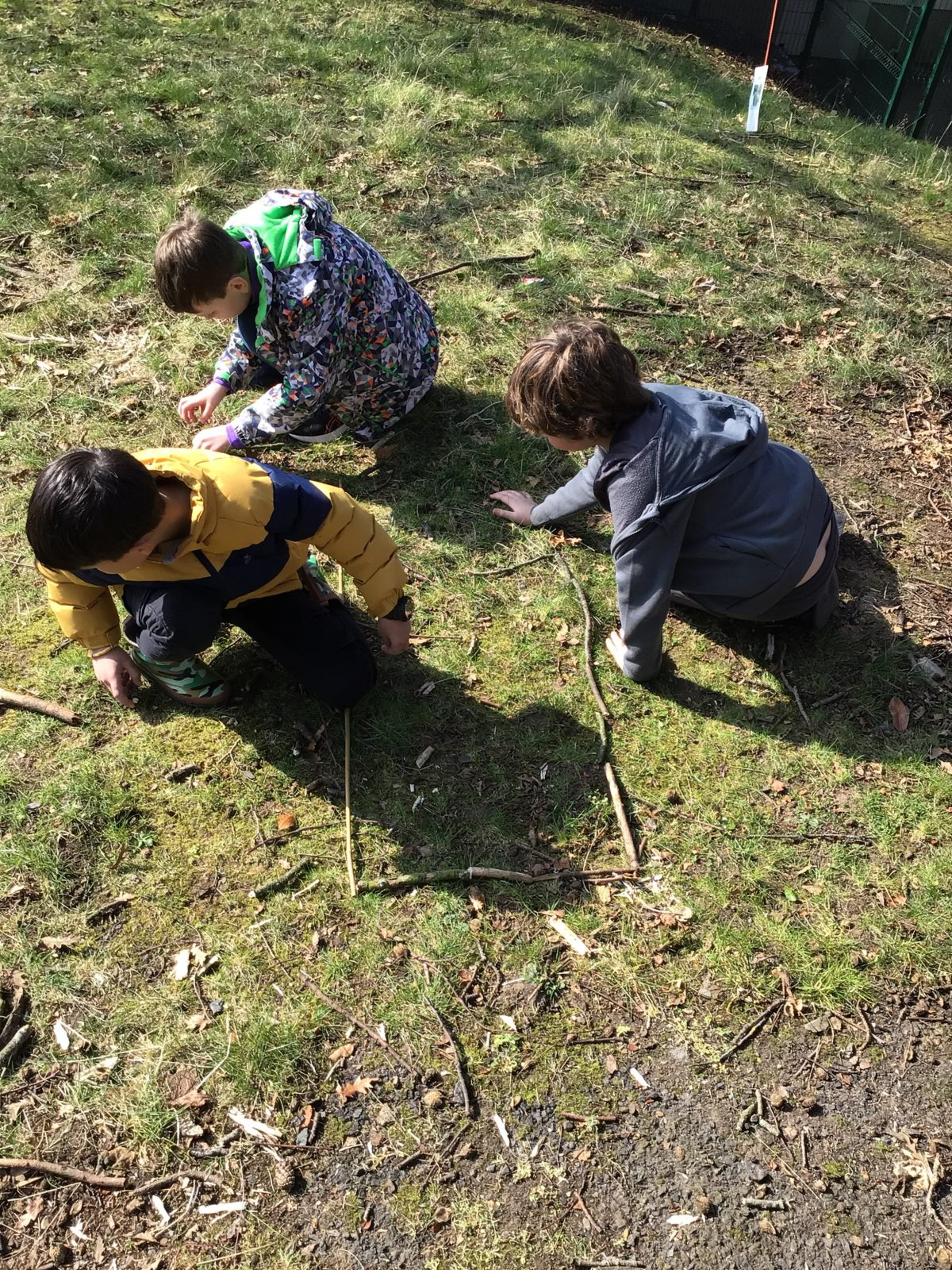 Primary 5 Lesson – Symmetry – I Spy Hunt in pairs -In groups, children made symmetrical pictures with 1 line of symmetry using the natural resources in the Forest School Area.