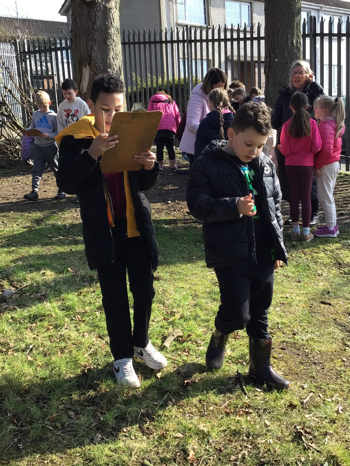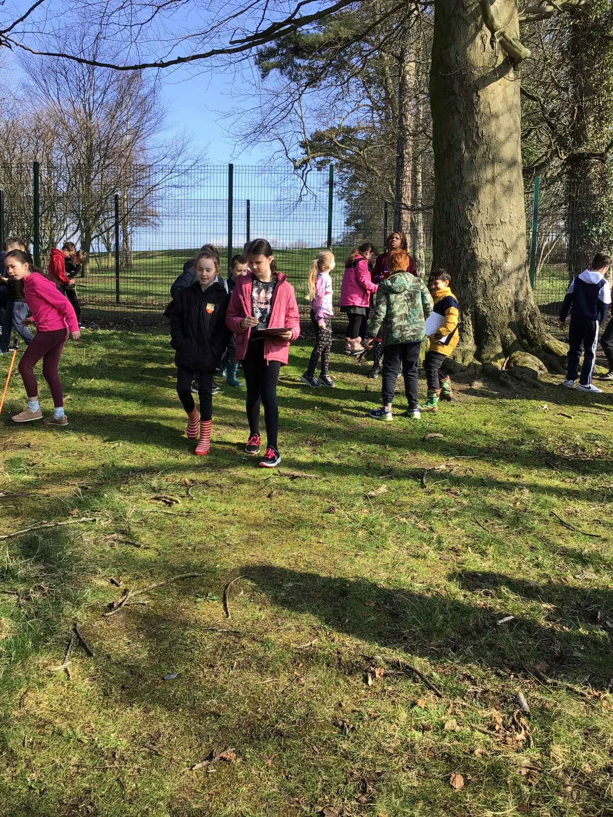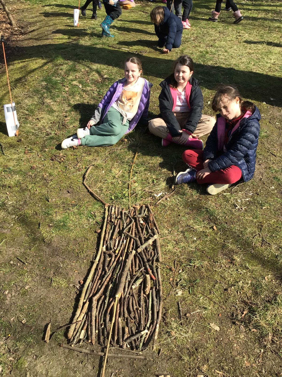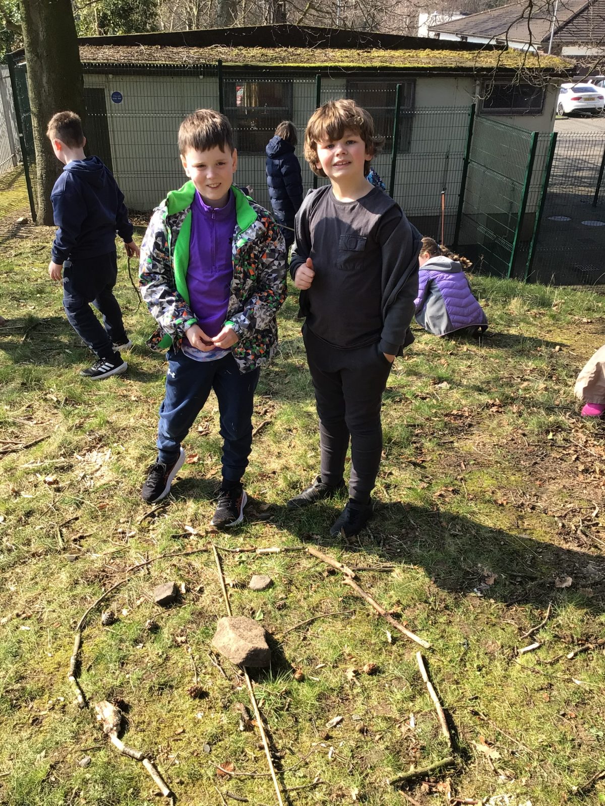 Primary 5 Lesson – Symmetry – I Spy Hunt in pairs -In groups, children made symmetrical pictures with 1 line of symmetry using the natural resources in the Forest School Area.