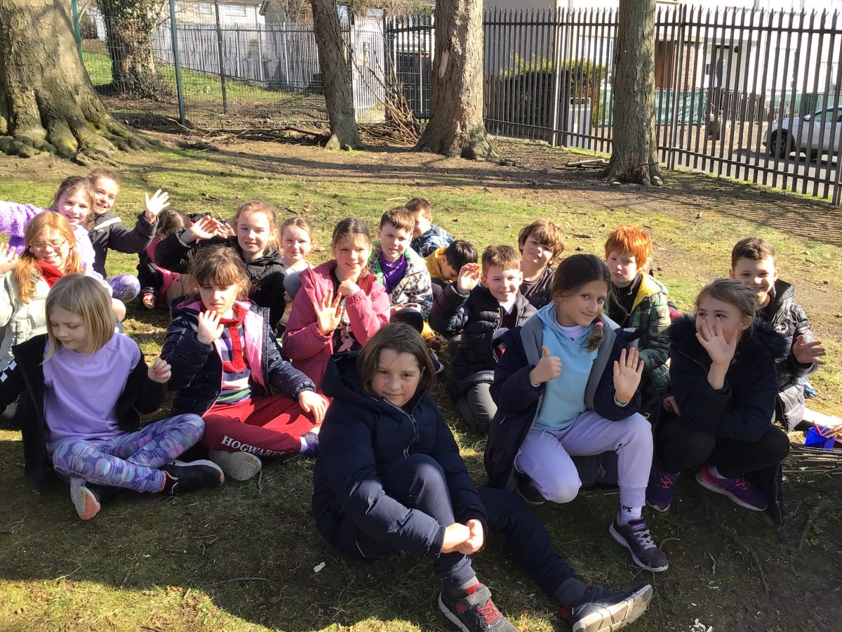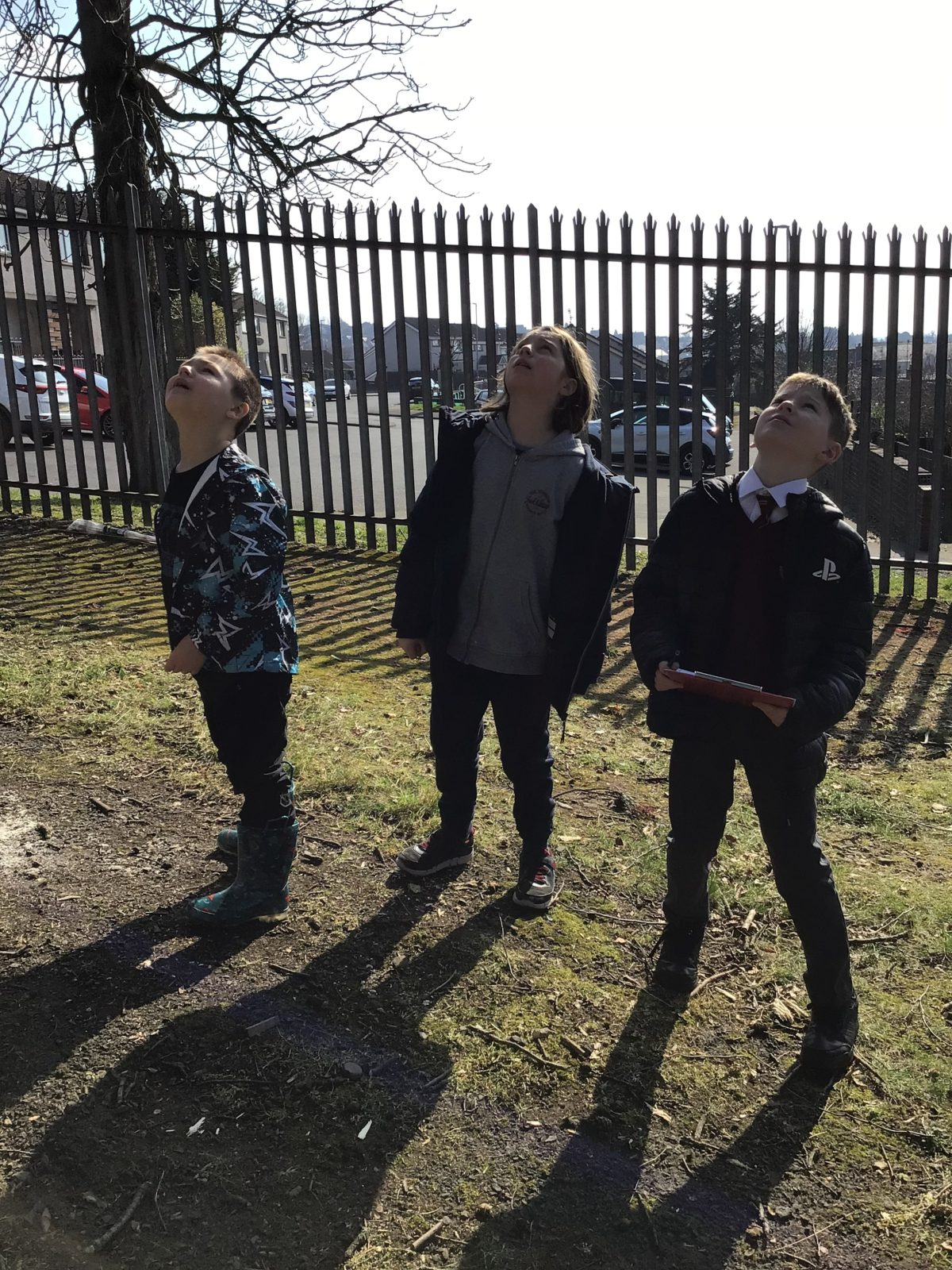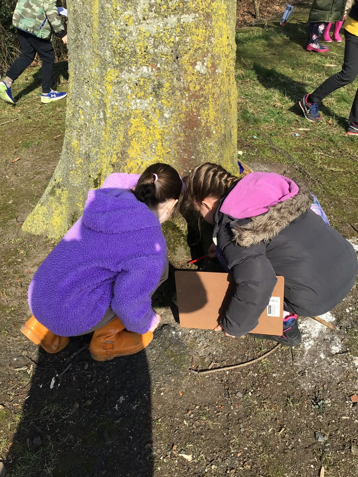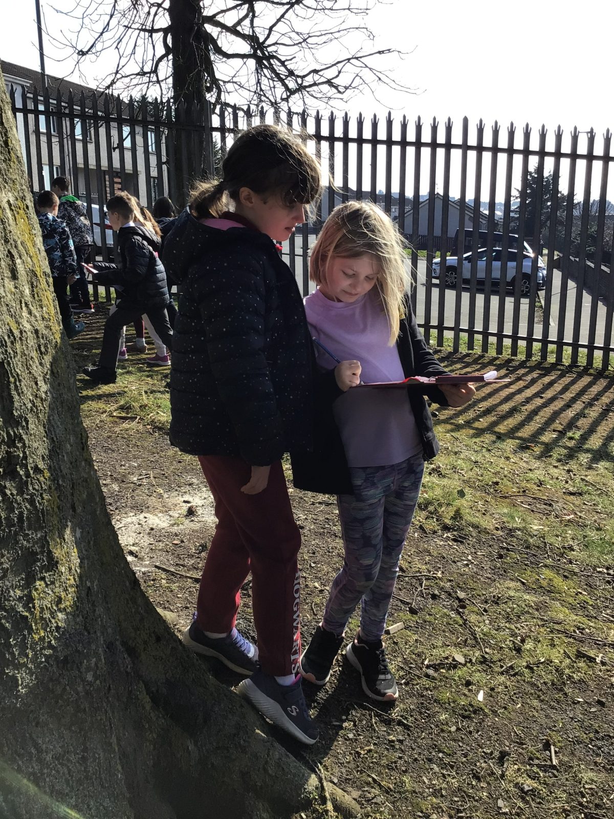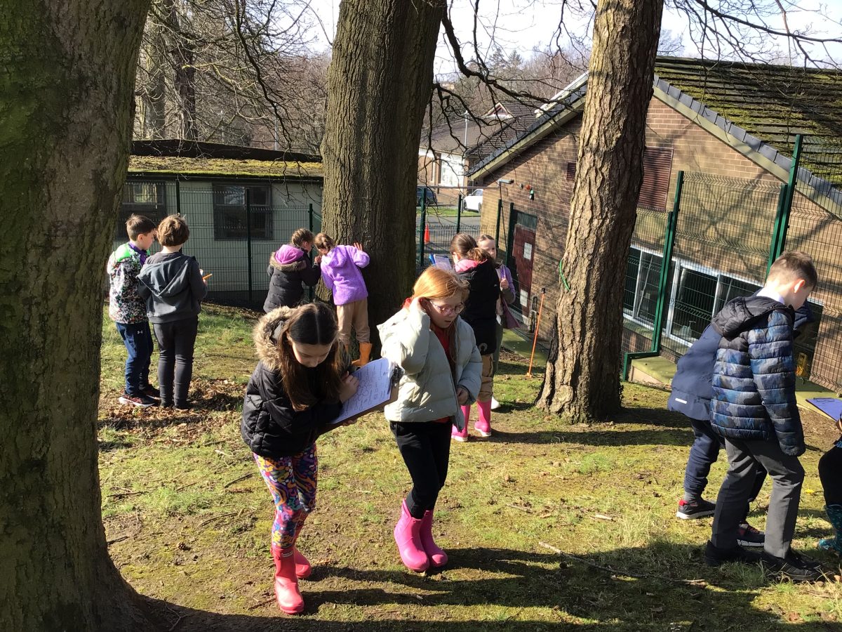 Primary 5 Lesson – Symmetry – I Spy Hunt in pairs -In groups, children made symmetrical pictures with 1 line of symmetry using the natural resources in the Forest School Area.