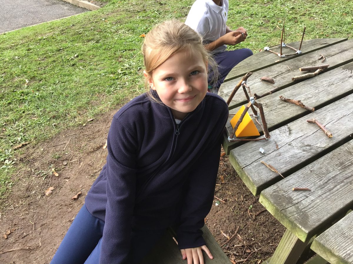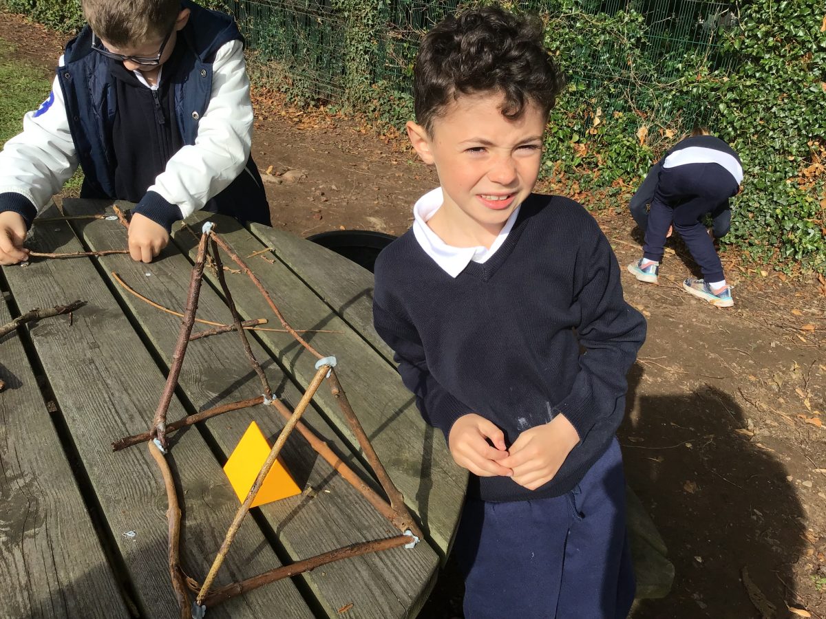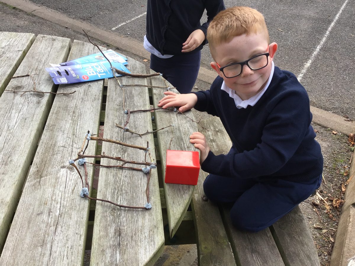 Children gathering twigs and using them to create 3D shapes. Using playdough to told twigs together. Using this as an outdoor Numeracy lesson.