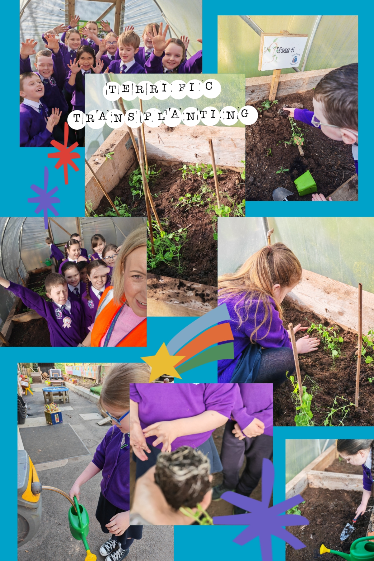 Today we transplanted peas/beans we planted in the classroom. We discussed the importance of taking care of the roots, adding suppoort for the stem and placing them carefully into the poly tunnel. We have made 2 children Garden guardians who will water and check out newly planted peas/beans each day,
