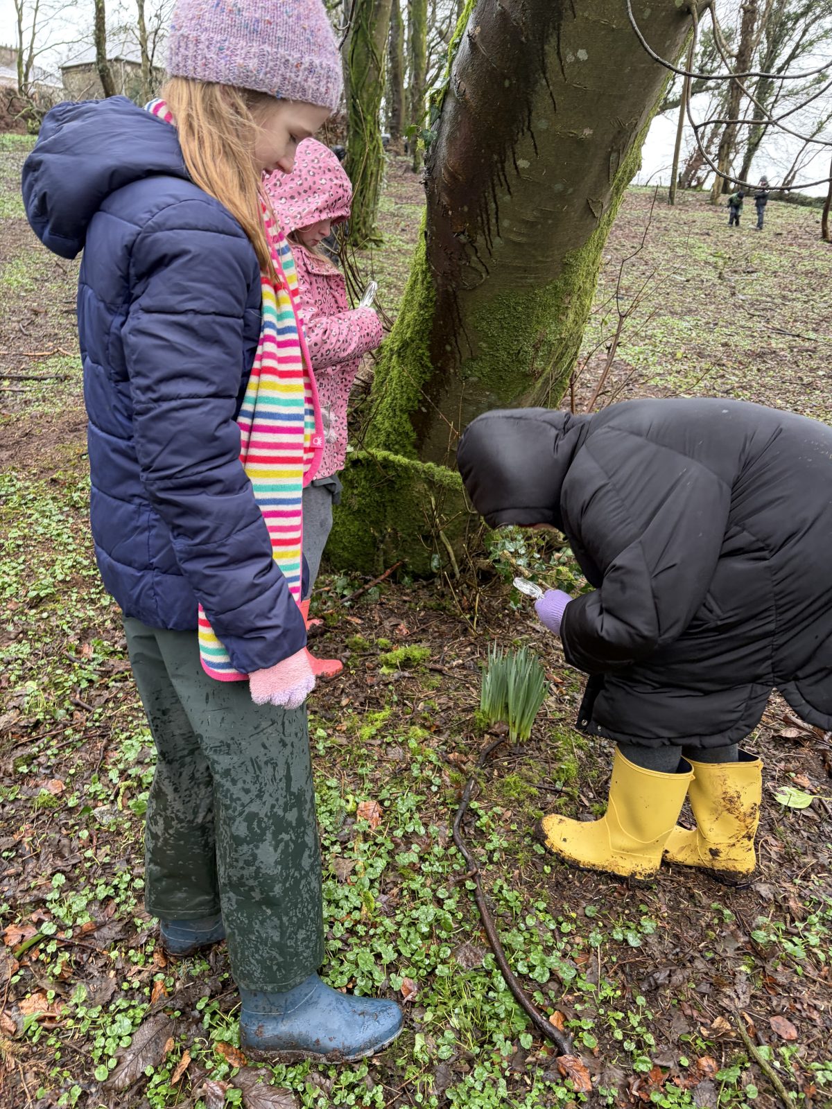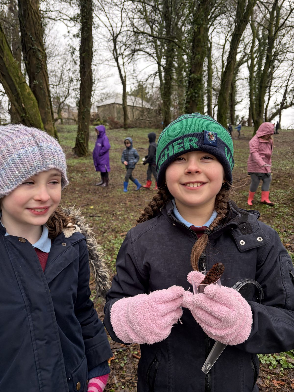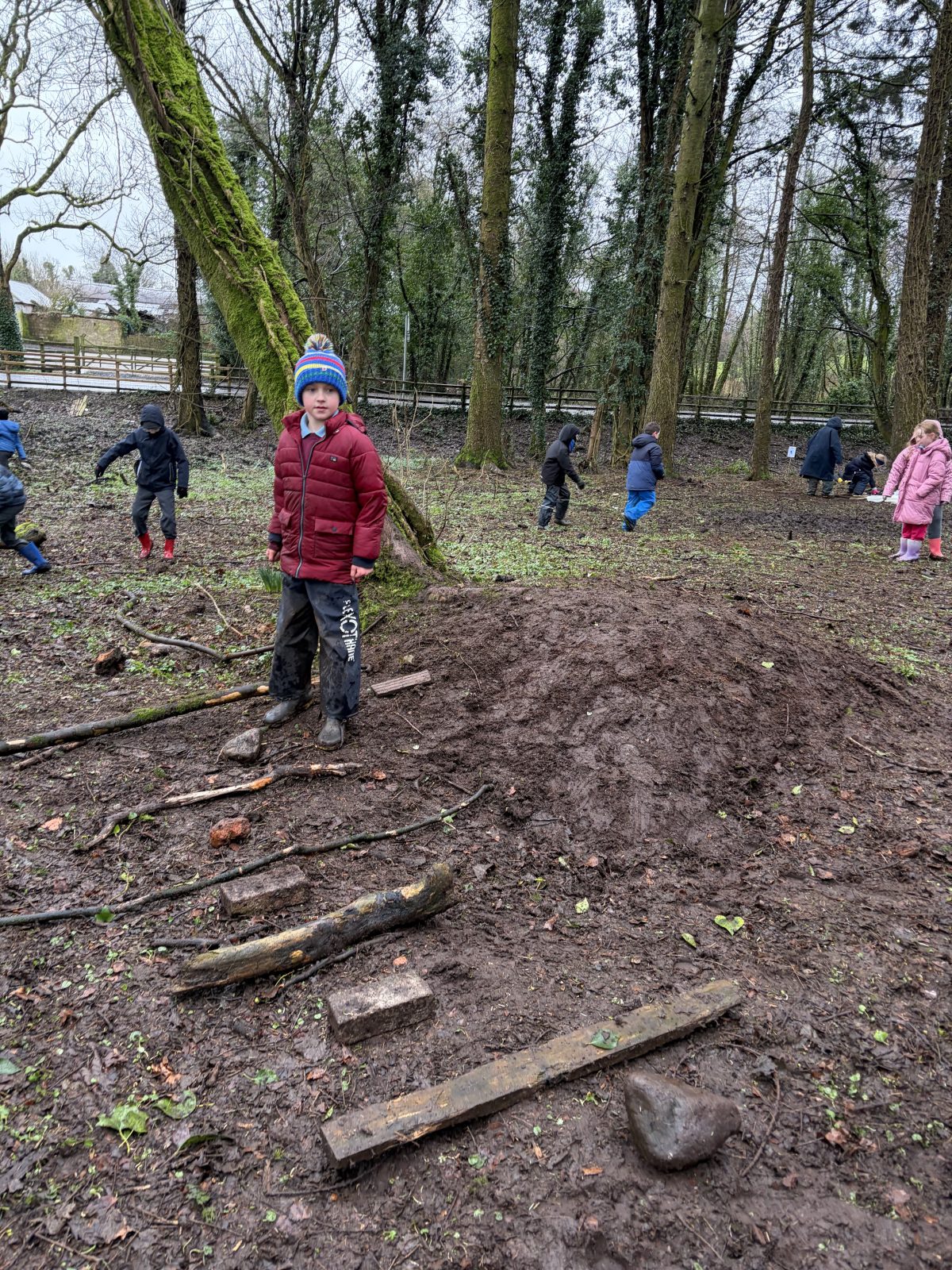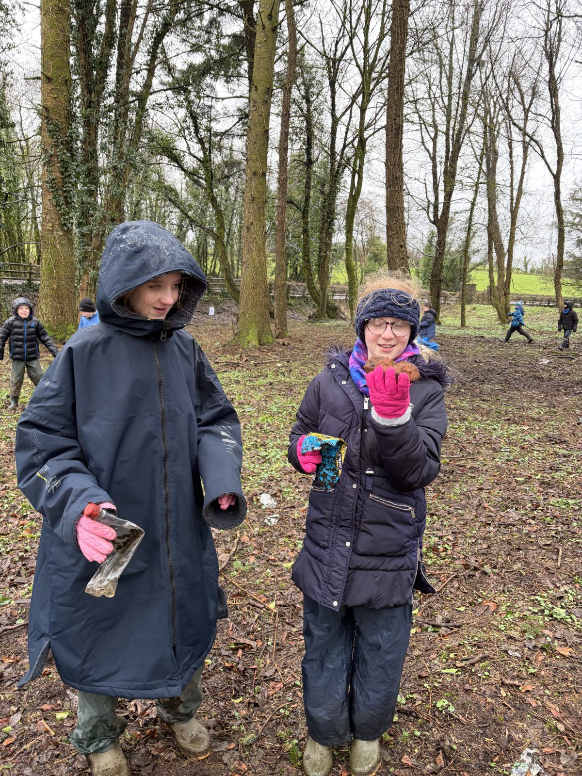 As part of Children’s Mental Health Week we took time to the forest to focus on the step to wellbeing of ‘noticing’. Our current focus in Numeracy is exploring patterns and relationships. I then combined these two main aspects to plan for children to notice natural patterns in the forest area. Children were given magnifying glasses to really emphasise the point of noticing and to develop observation skills. Children then progressed to creating their own repeating patterns. One pair included themselves in the pattern, repeating leaf, leaf, twig, person, person and so on, while another pair created a symmetrical repeating pattern. Most children enjoyed this activity and completed with eagerness. Children not at the happy face gave reasons such as being cold or not having more free time in the mud.