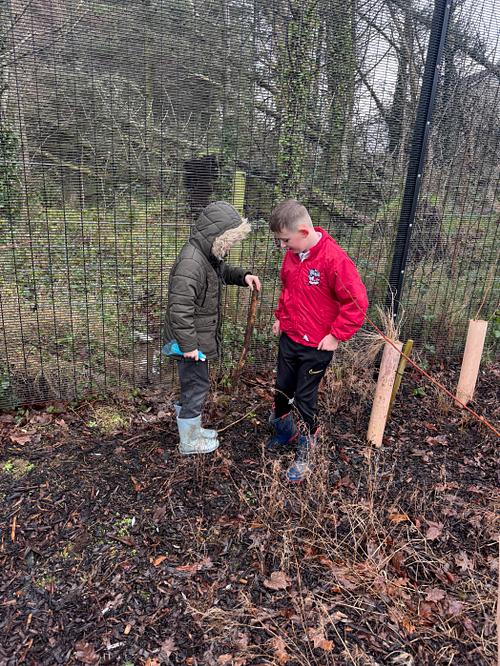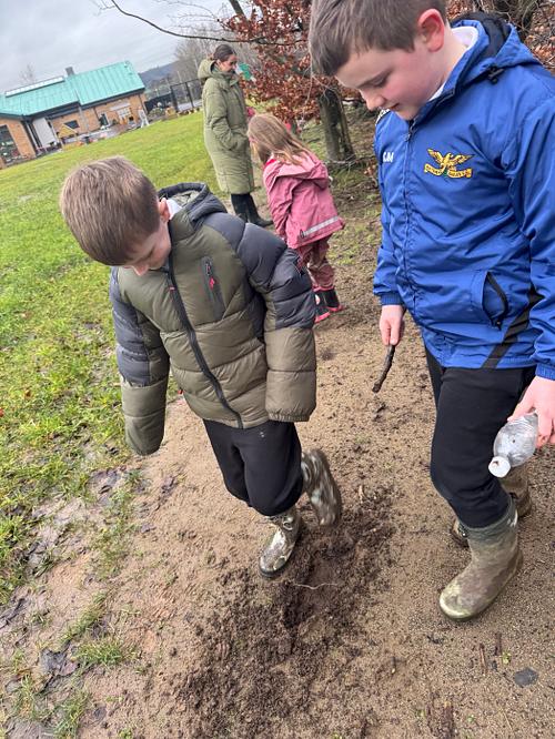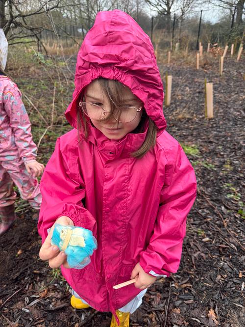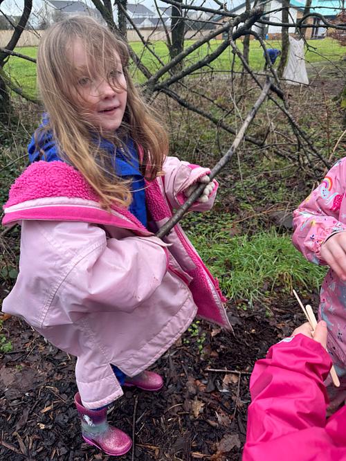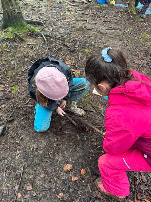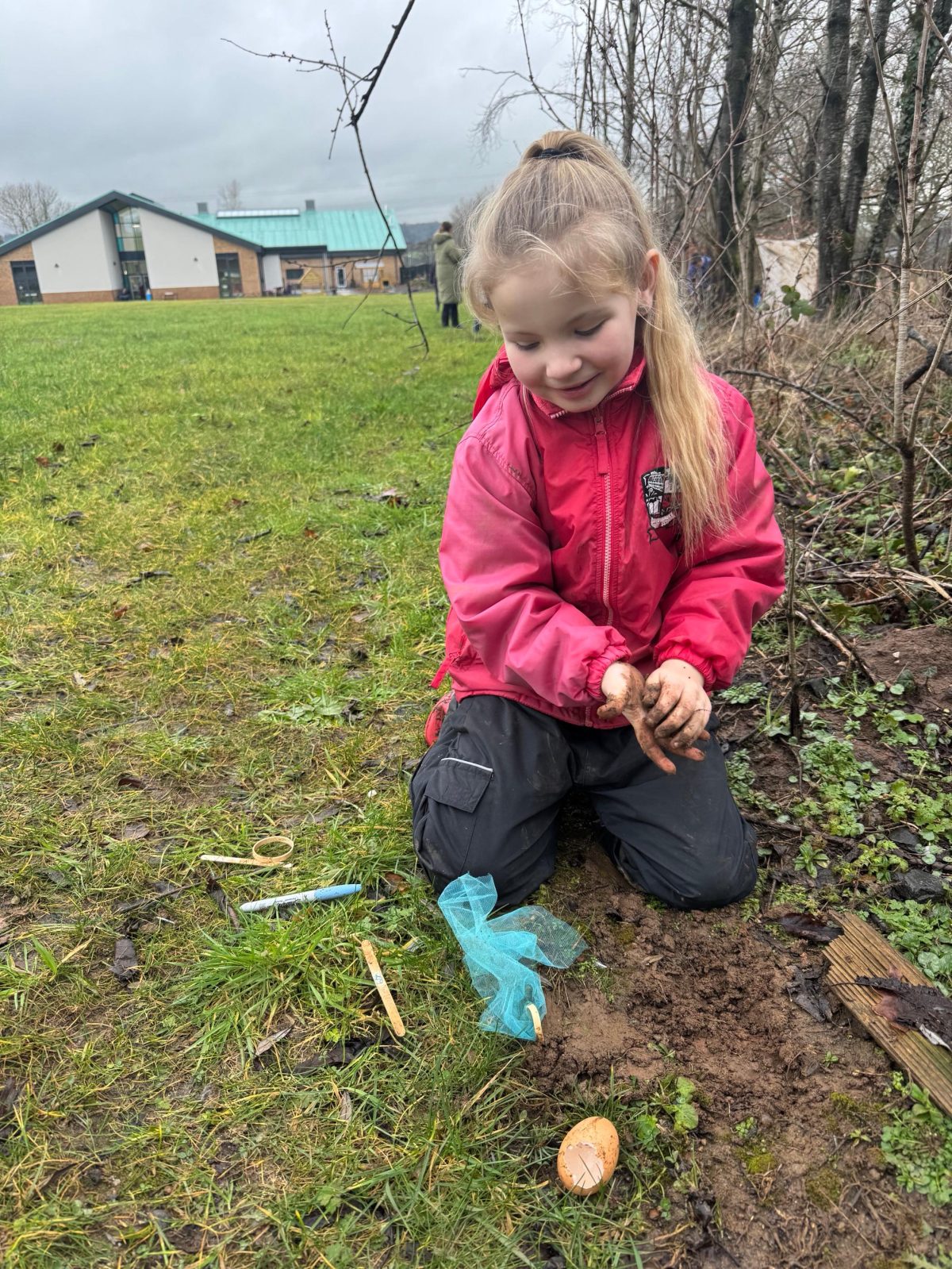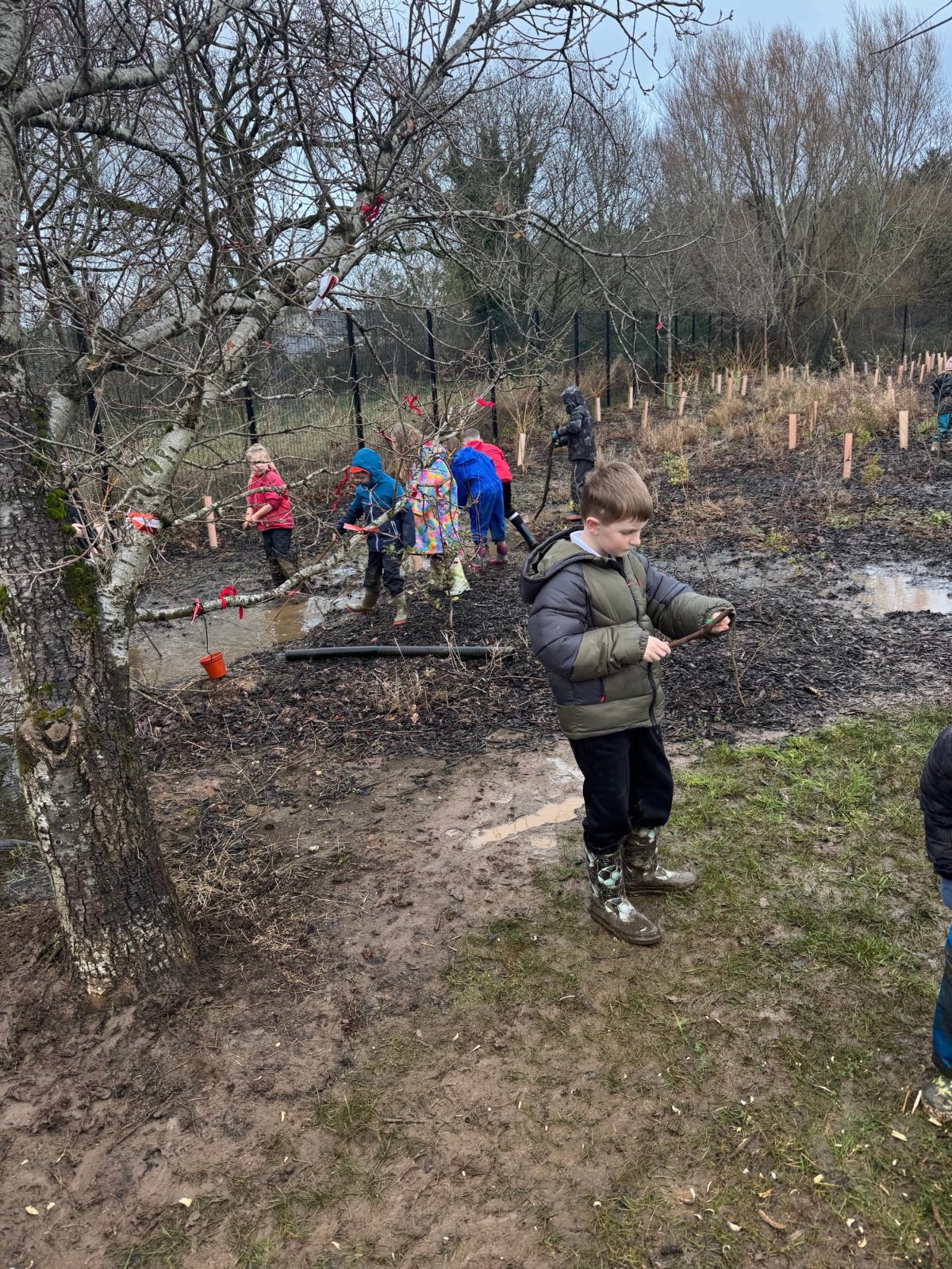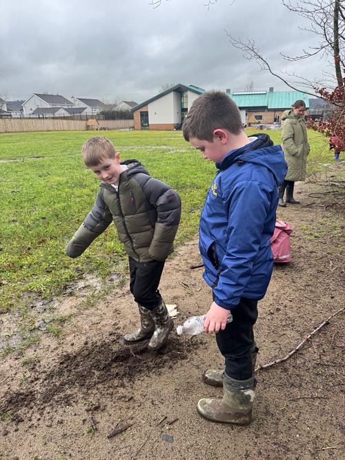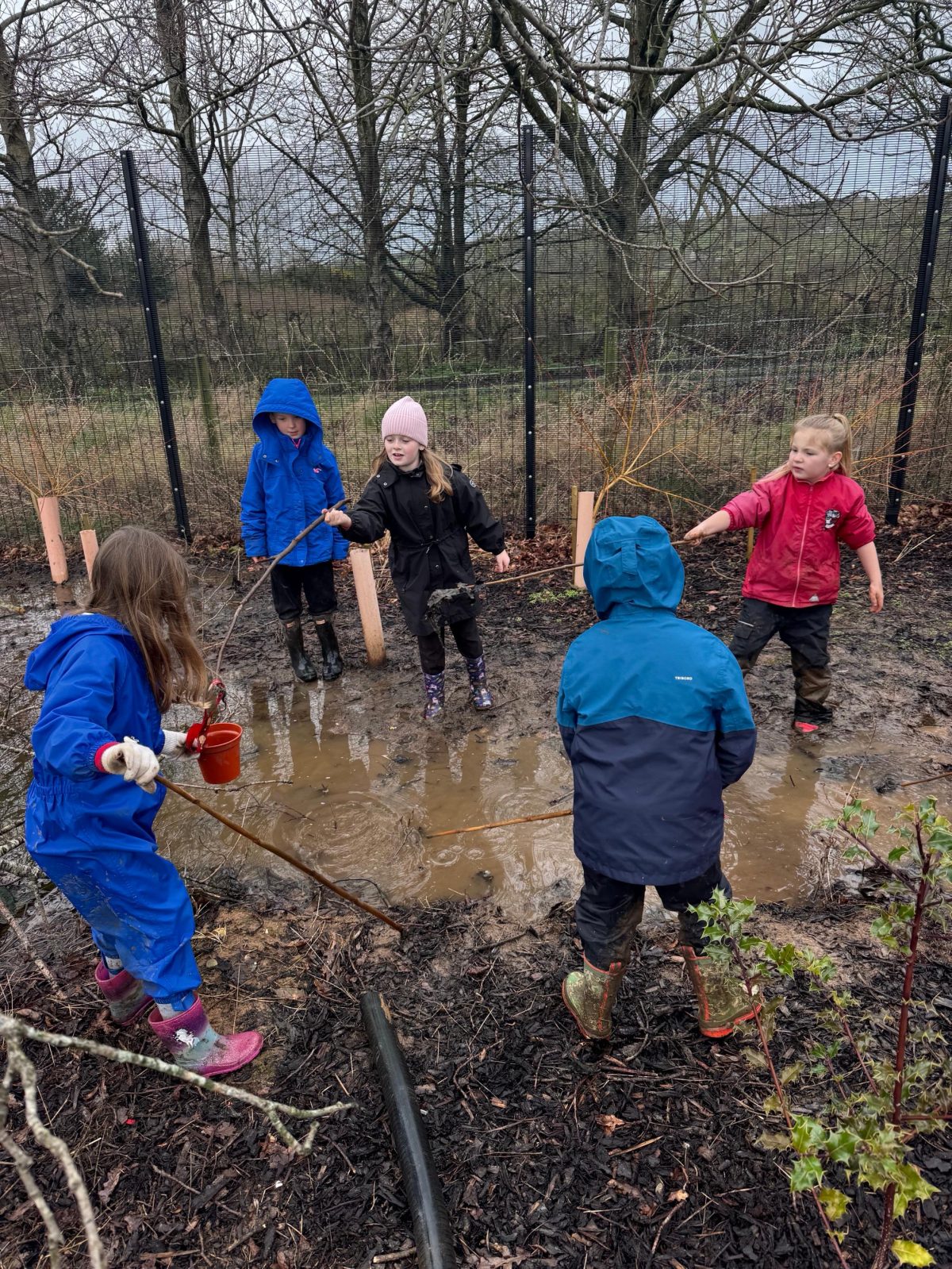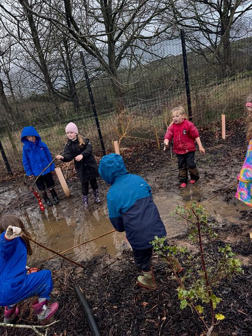 The site quickly became muddy and water‑filled due to recent weather, creating additional opportunities for sensory exploration and spontaneous learning. Many pupils used the conditions to investigate water movement, sinking and floating, and even enjoyed some imaginative “fishing” during free play. These moments of child‑led discovery supported problem‑solving, creativity, and physical development.