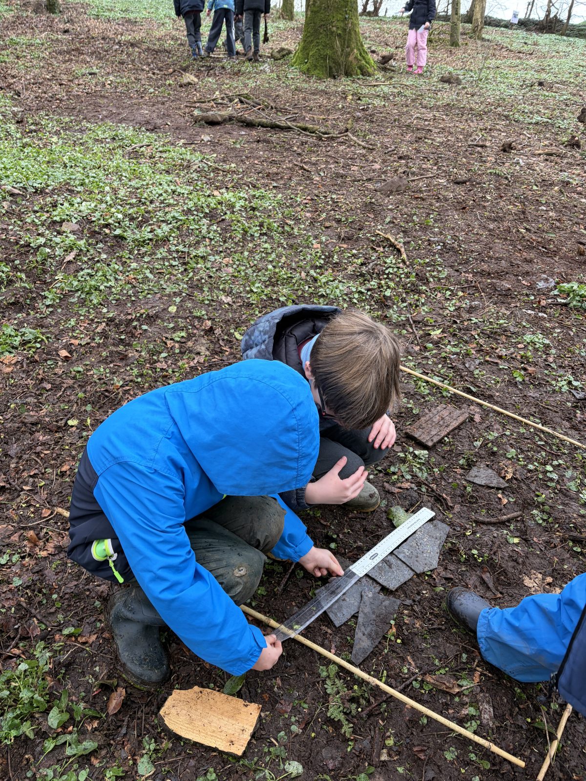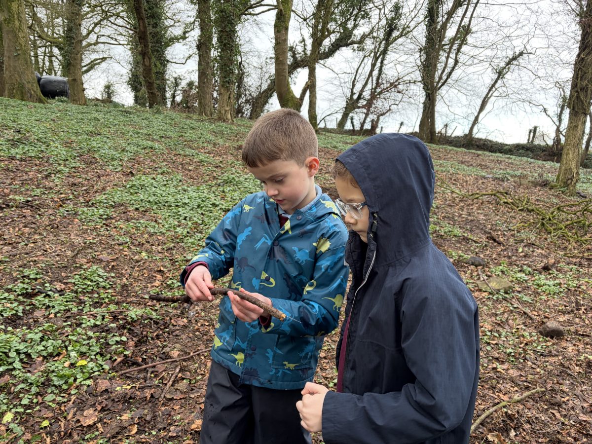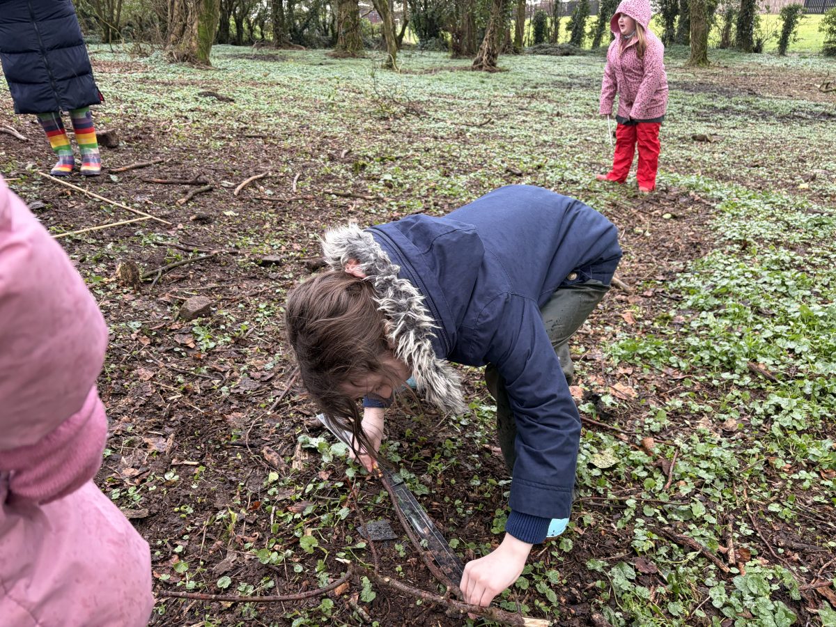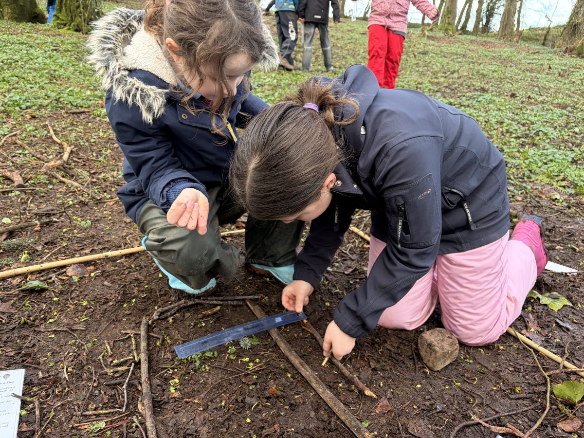 Activity with P5 to show P5 staff how a Forest School session would run. Following discussion with P5 teacher, it was decided that the lesson would incorporate measuring length as this was their current focus in Numeracy. I then decided to give children the challenge of using natural materials to design a ship which met specific requirements, also coinciding with their World Around Us topic of Titanic. It was great to see the children work together as a team and to see problem-solving skills, such as breaking sticks to fit the specifications given, being used. Creativity was also witnessed as children decided which objects would best represent lifeboats or funnels, for example.