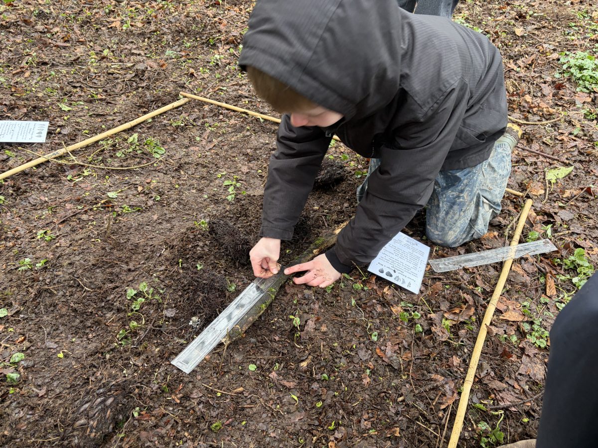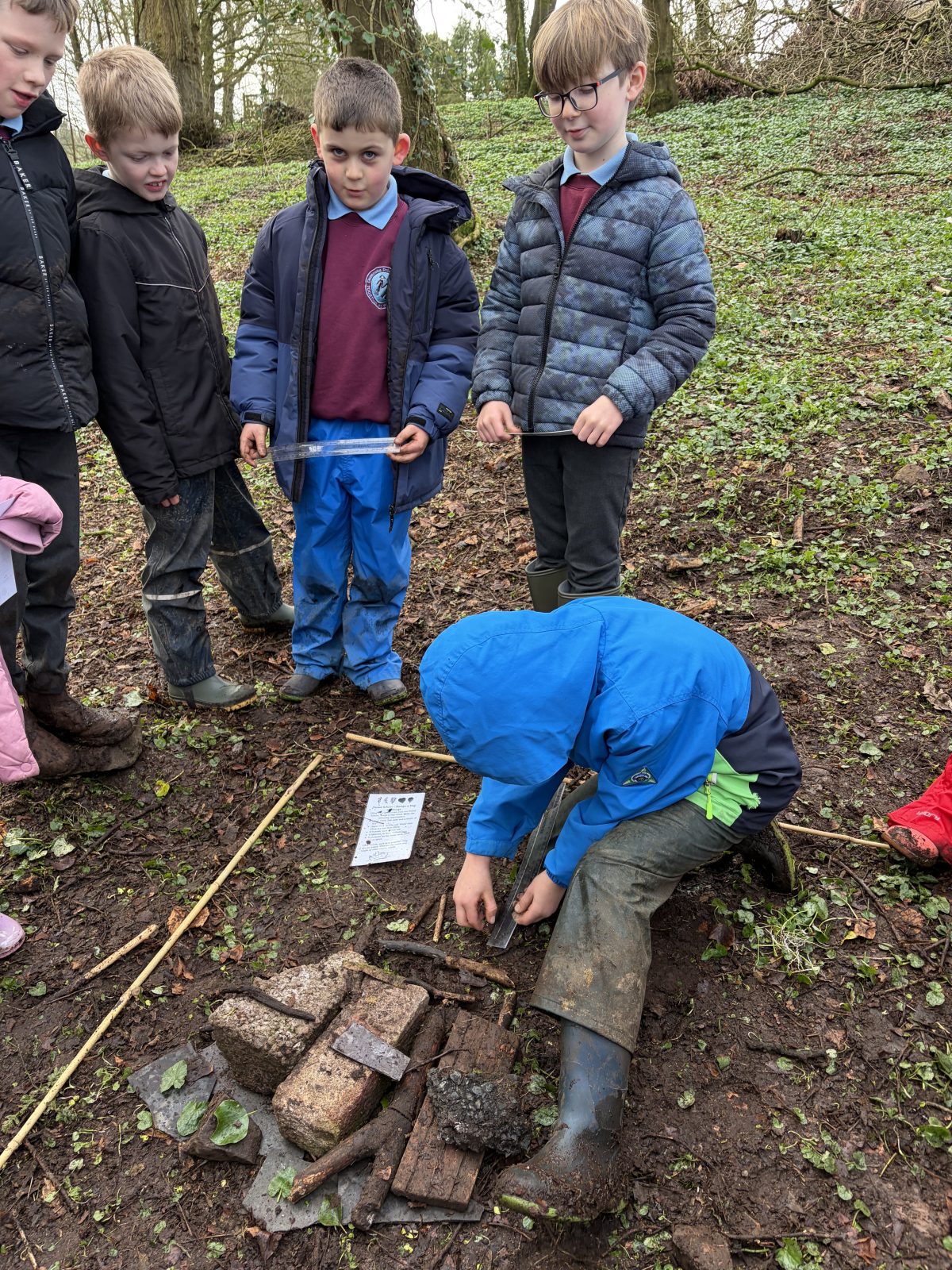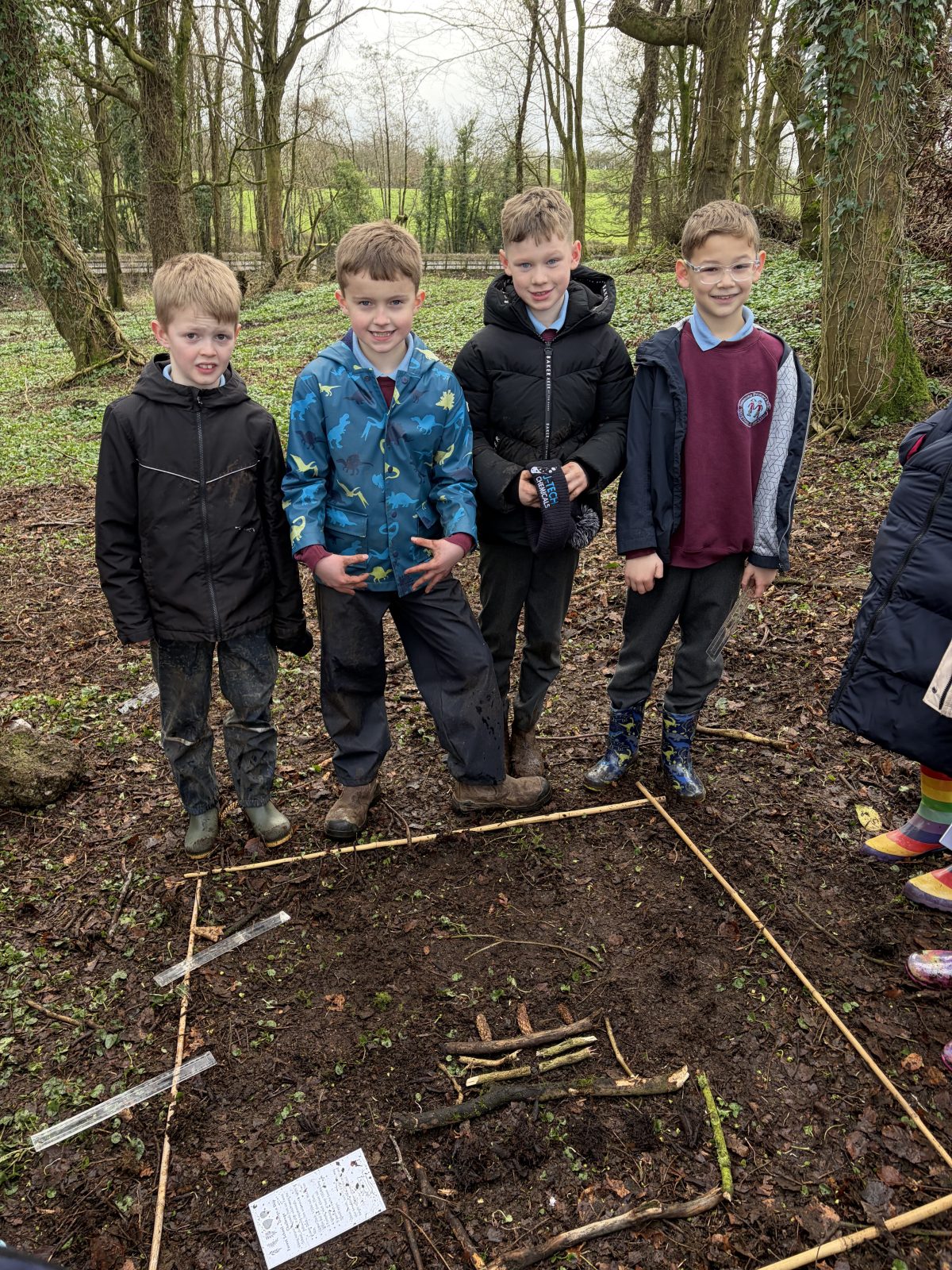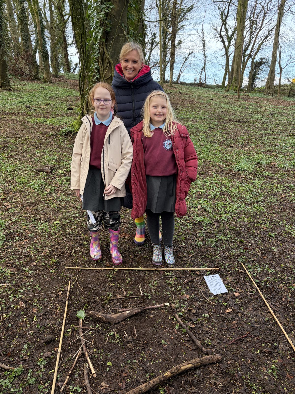 Activity with P5 to show P5 staff how a Forest School session would run. Following discussion with P5 teacher, it was decided that the lesson would incorporate measuring length as this was their current focus in Numeracy. I then decided to give children the challenge of using natural materials to design a ship which met specific requirements, also coinciding with their World Around Us topic of Titanic. It was great to see the children work together as a team and to see problem-solving skills, such as breaking sticks to fit the specifications given, being used. Creativity was also witnessed as children decided which objects would best represent lifeboats or funnels, for example.