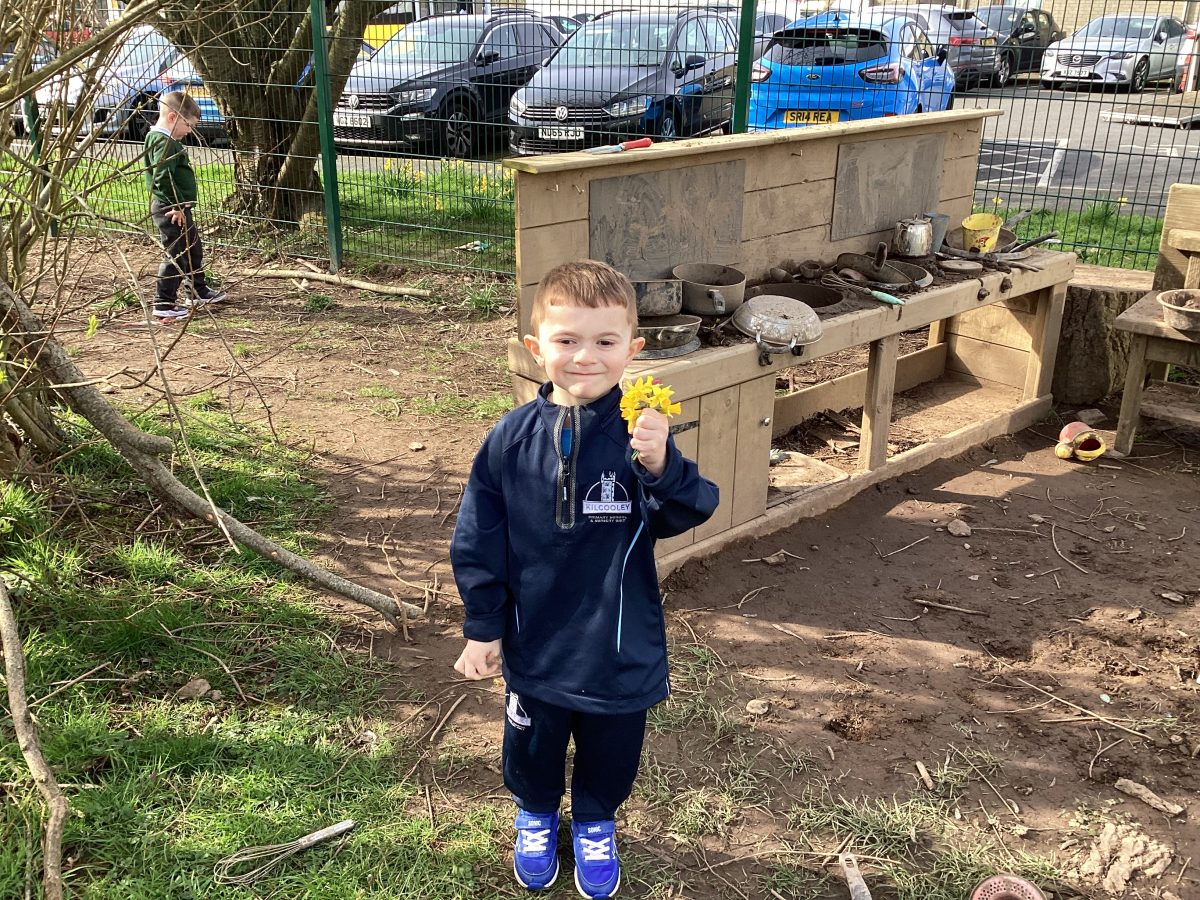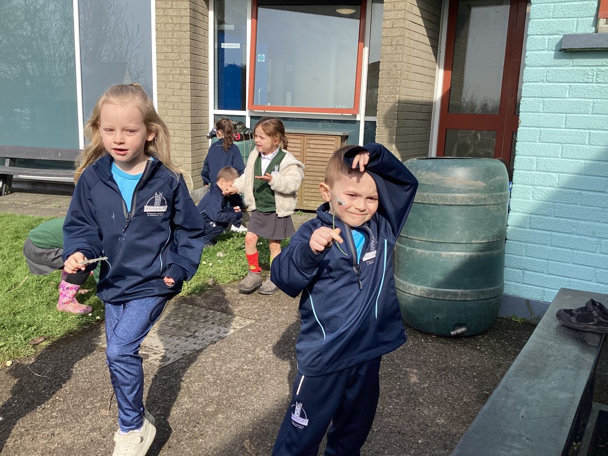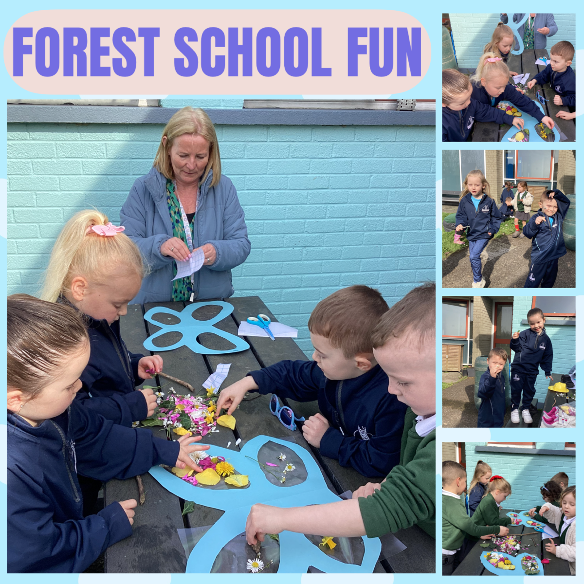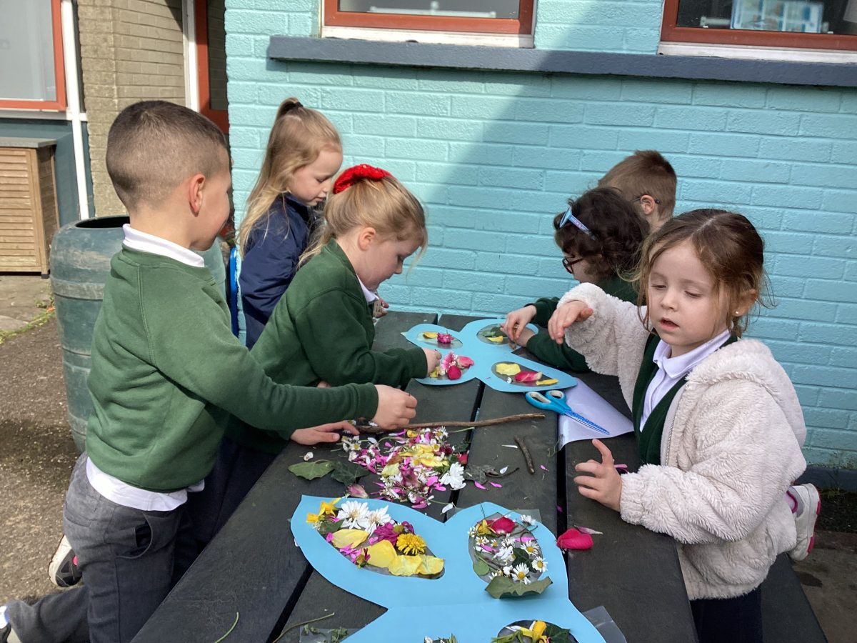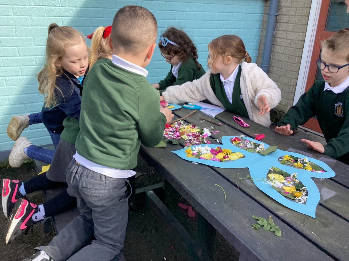 During carpet time we had a whole class discussion on the signs of Spring. The children then went outside and collected leaves and flowers etc from our garden. They then made 2 large butterfly sun catchers by sticking them onto the wings using sticky back plastic. We then displayed these on our classroom window.