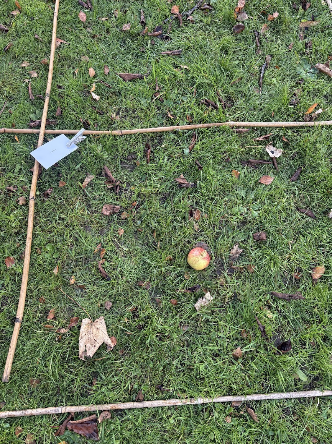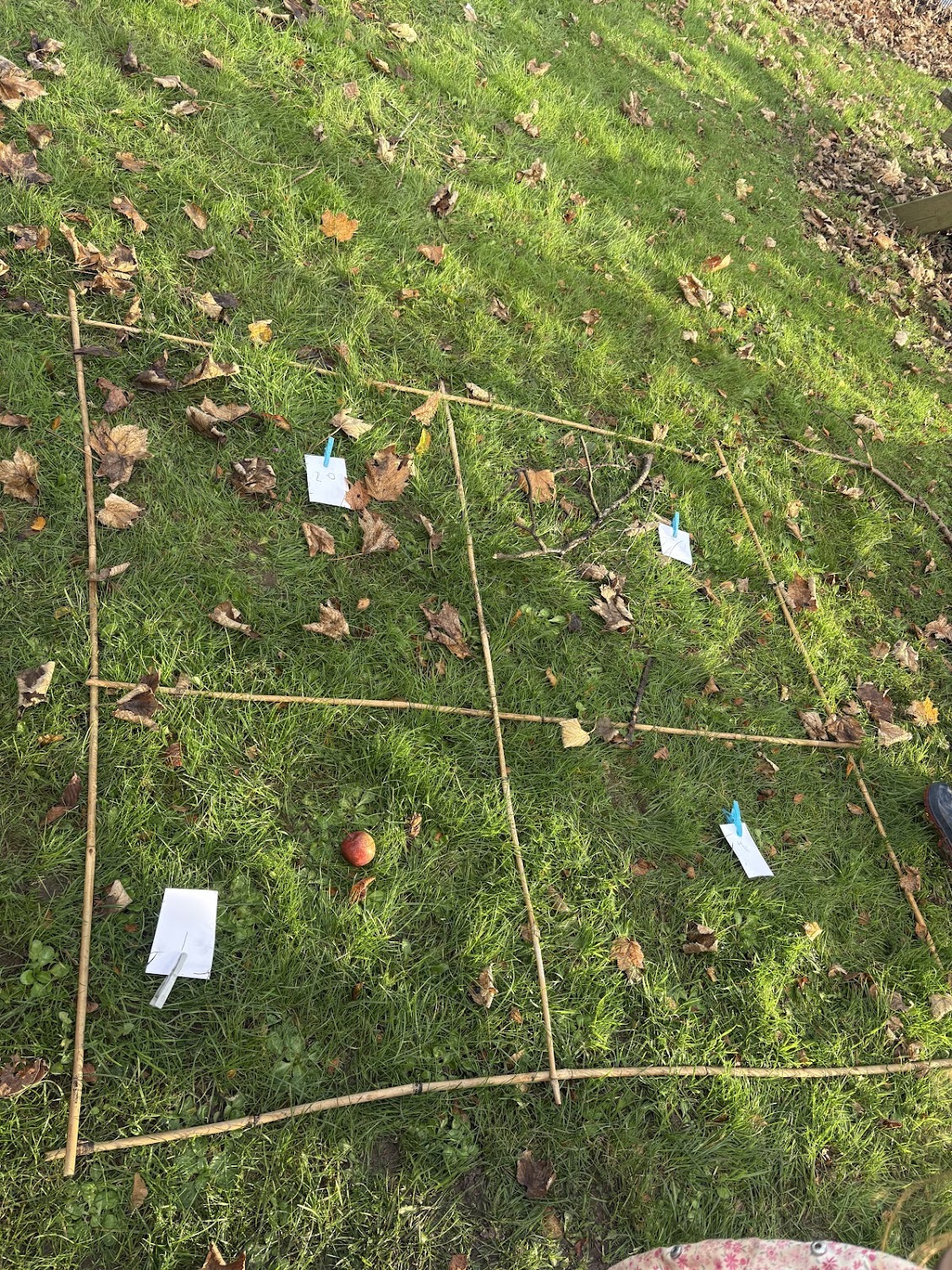 We used bamboo canes to build a grid, then picked a number for each section. We collected the correct number of natural materials, like pinecones, leaves, sticks and apples and put them in the box. Then, they practiced counting, adding, and problem-solving— totalling the numbers up at the end of each column and row!