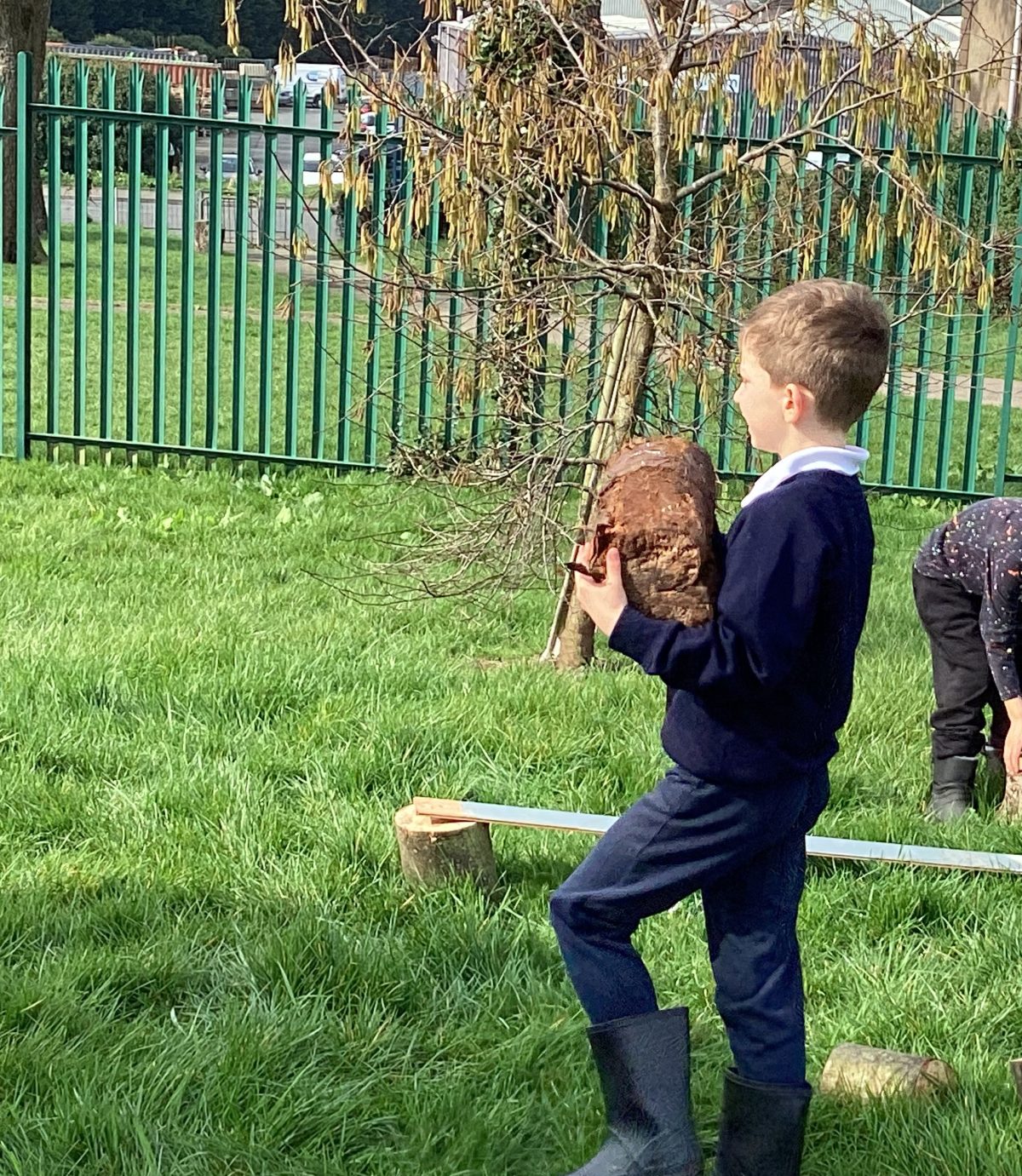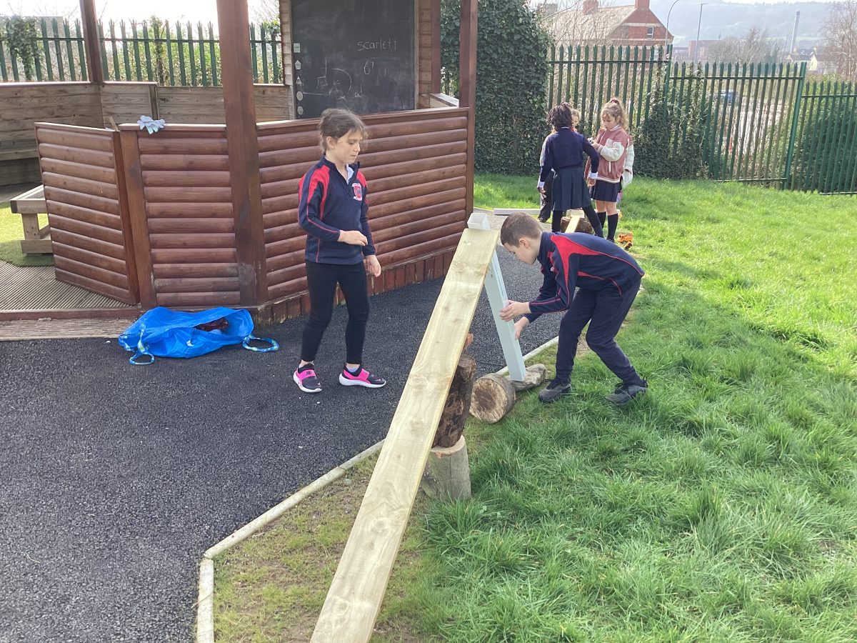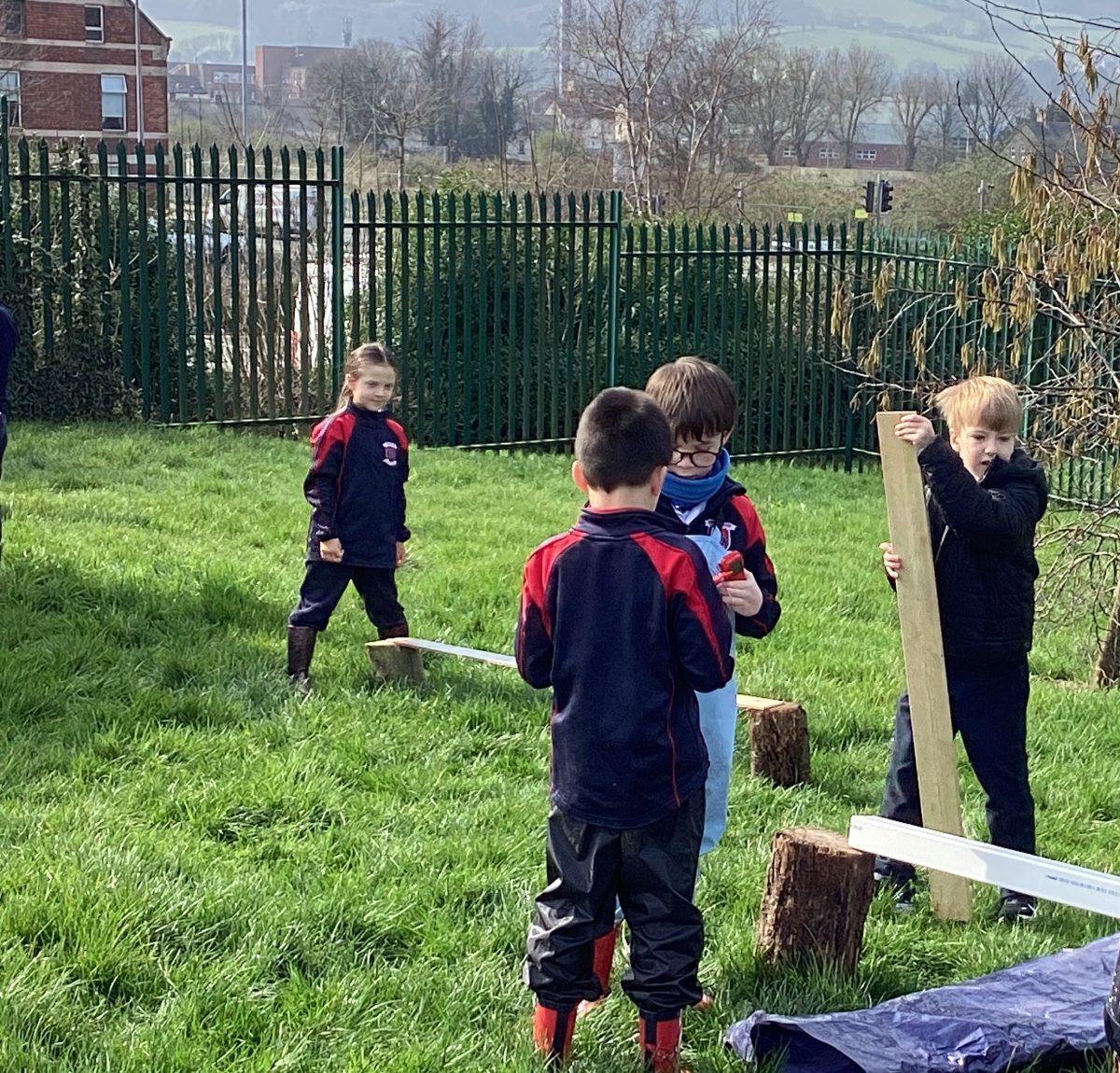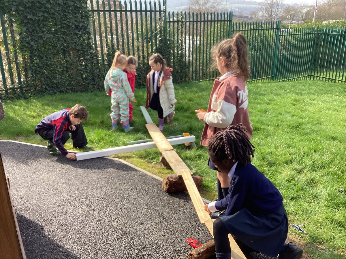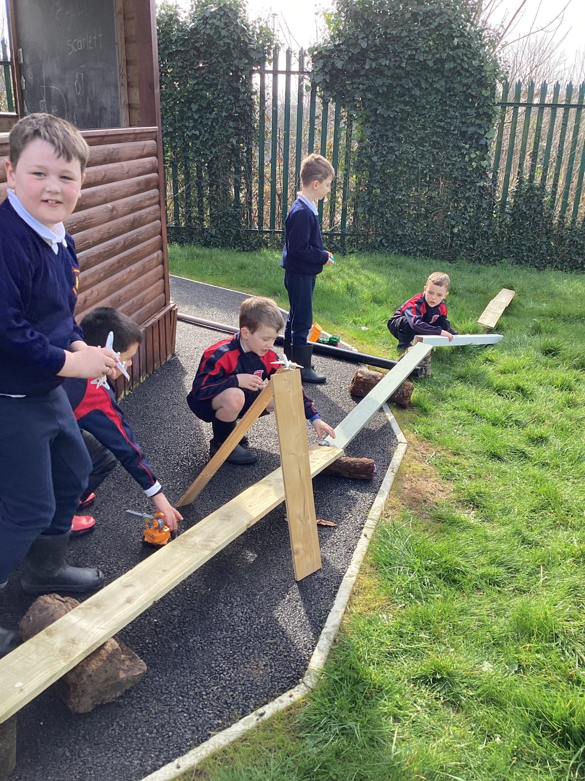 The children split into 2 groups. One group used the wheelbarrows to move logs over to the grassy section and used tree stumps, planks and pipes to make a transport system in smaller groups or pairs.