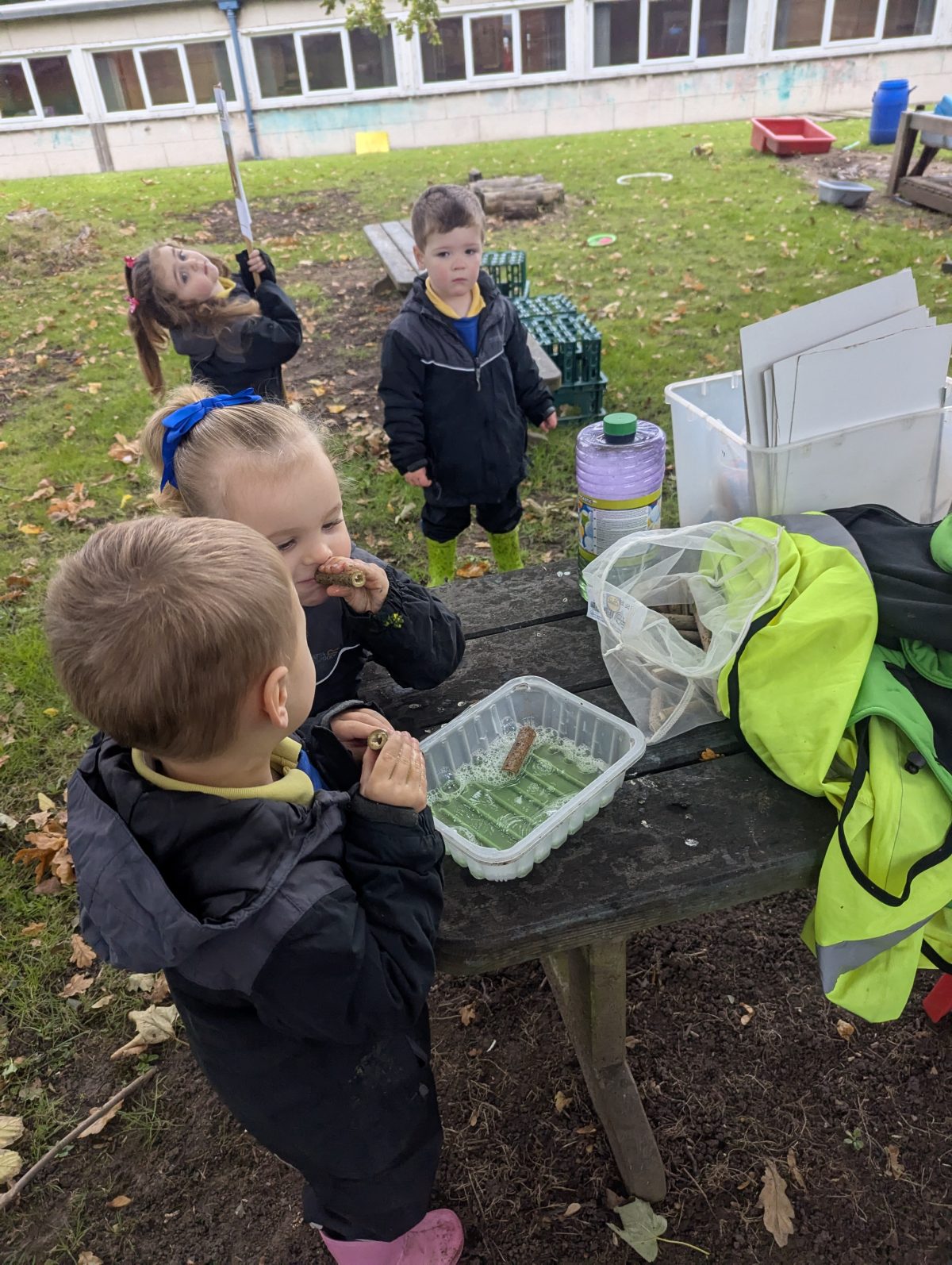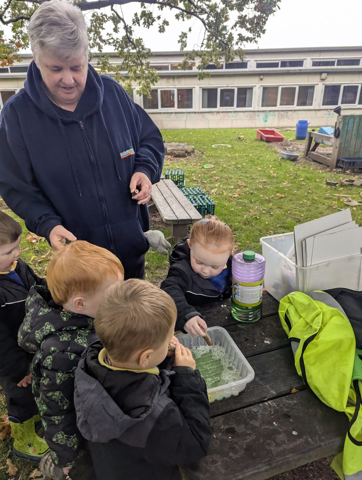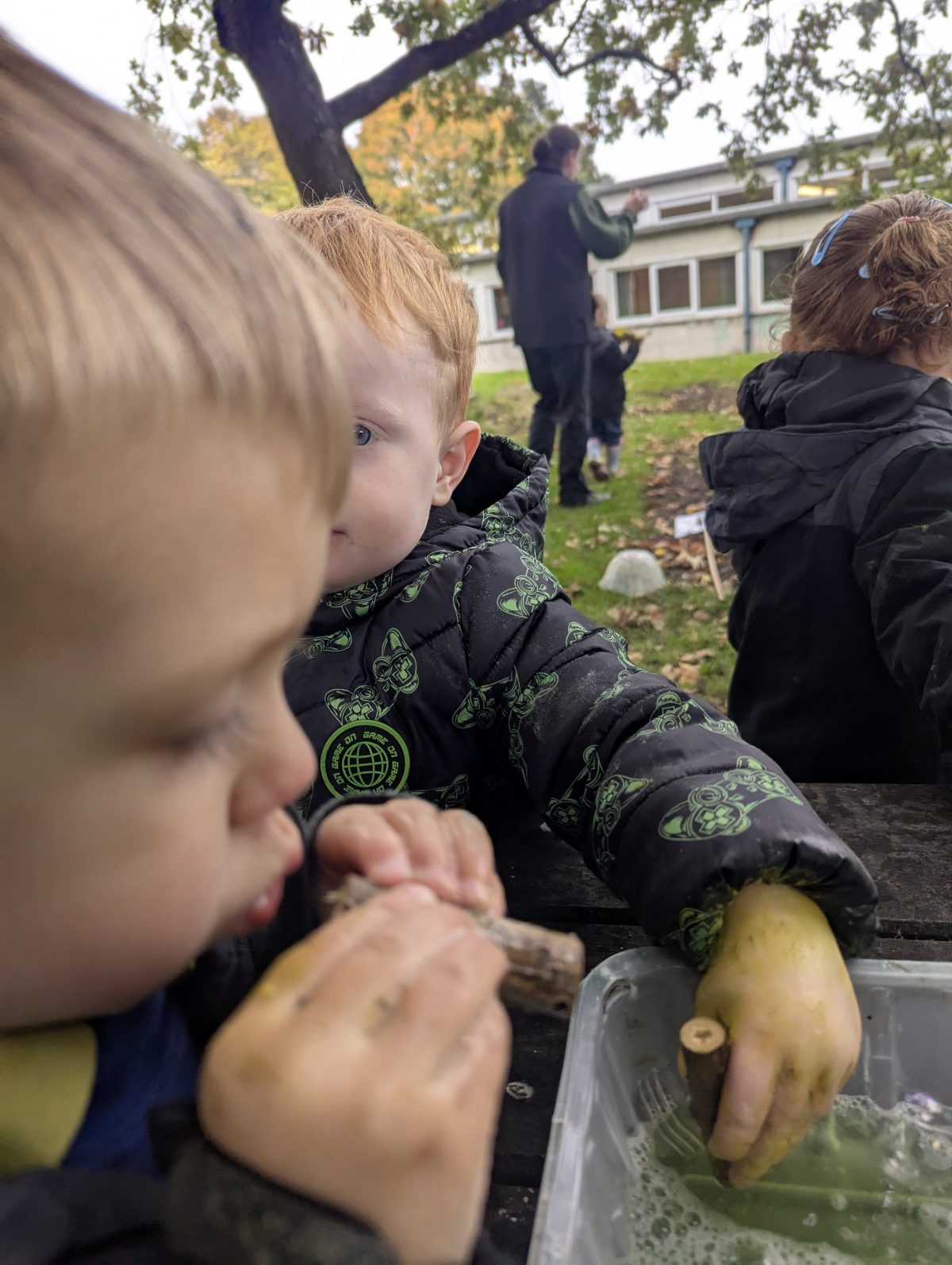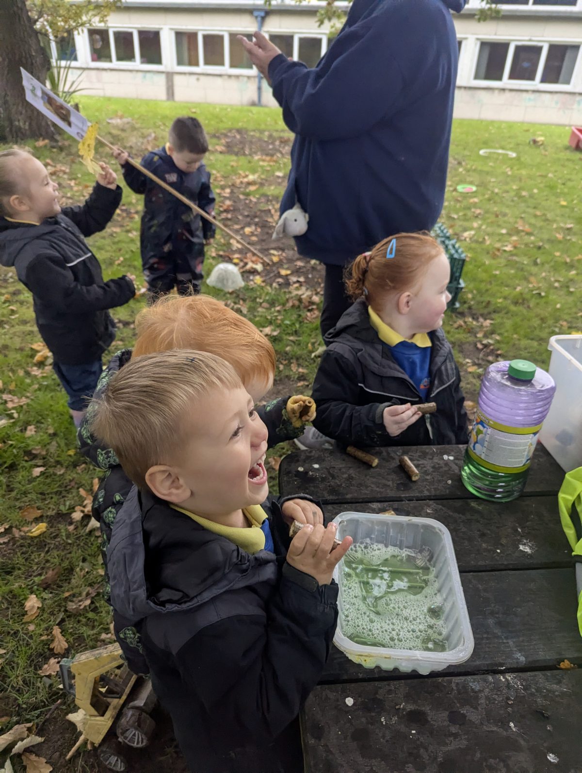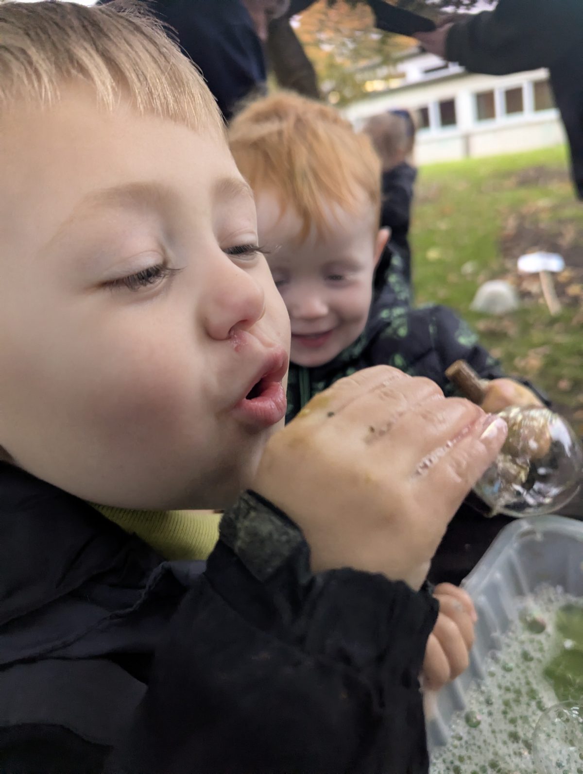 Exploring and thinking:- learning about force and how much liquid to use to make a successful bubble, testing each time.