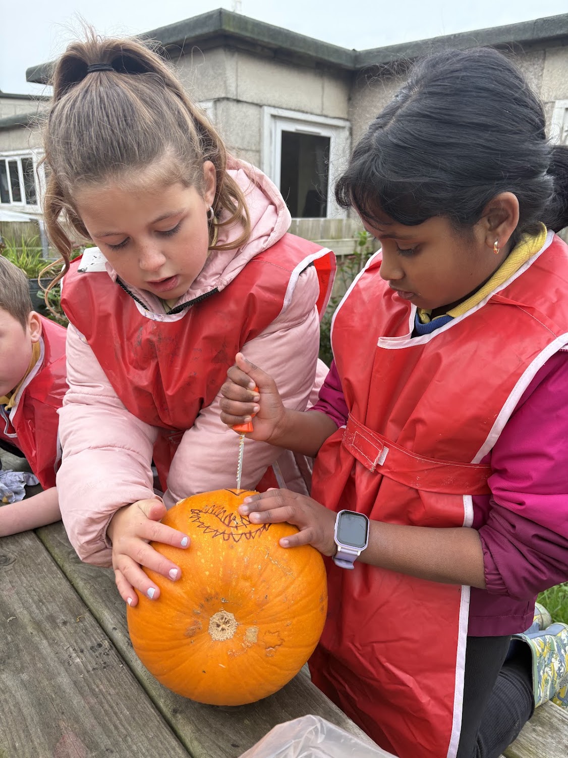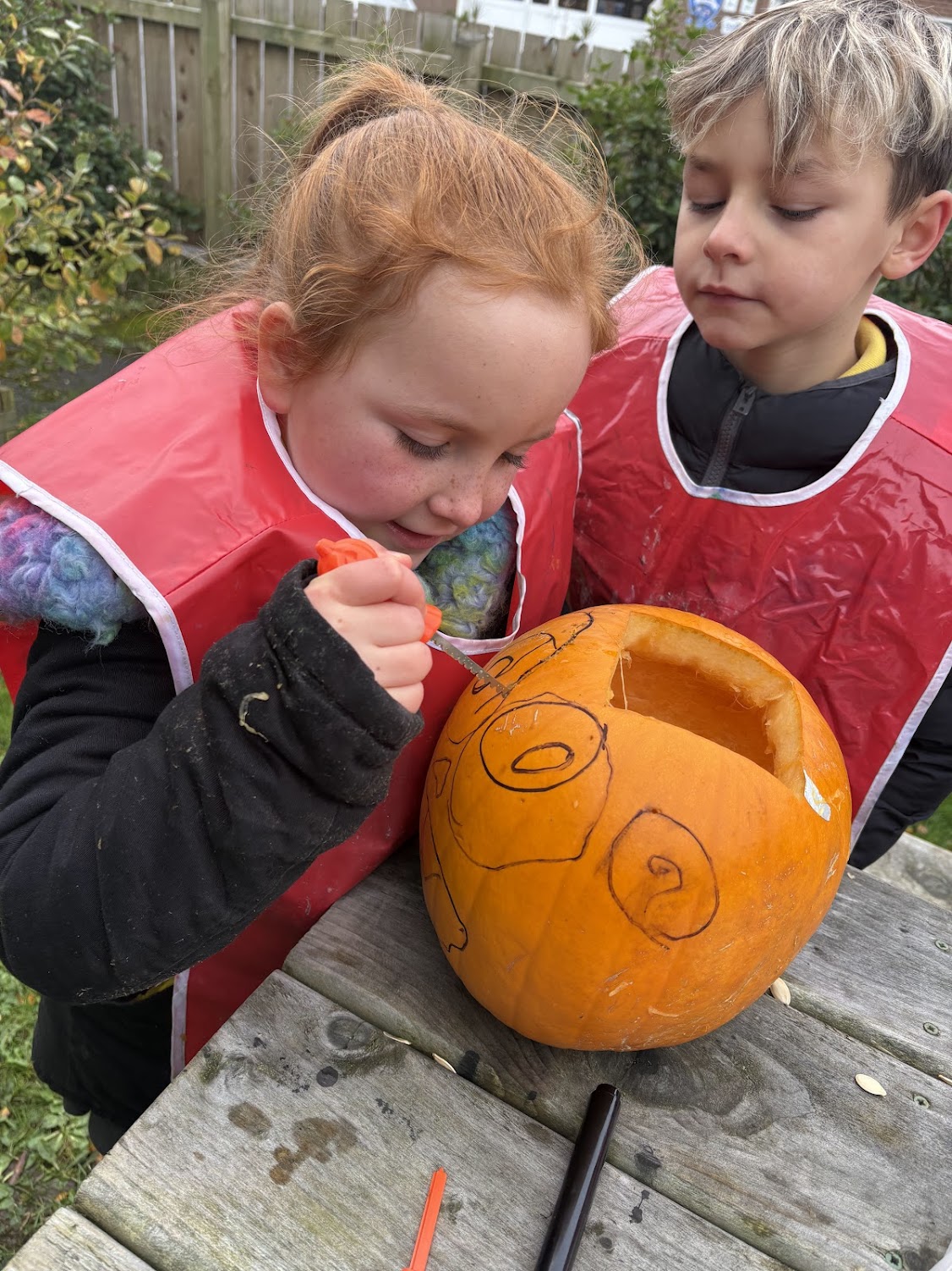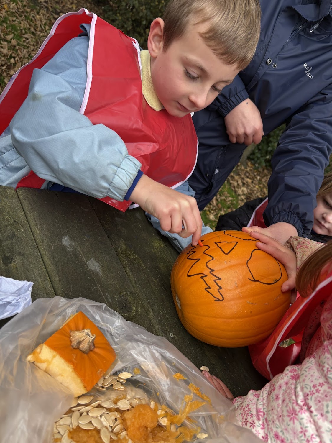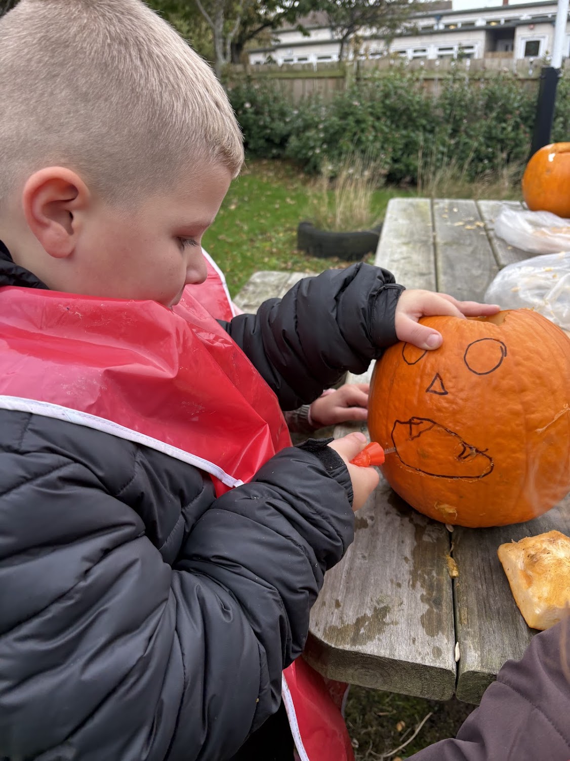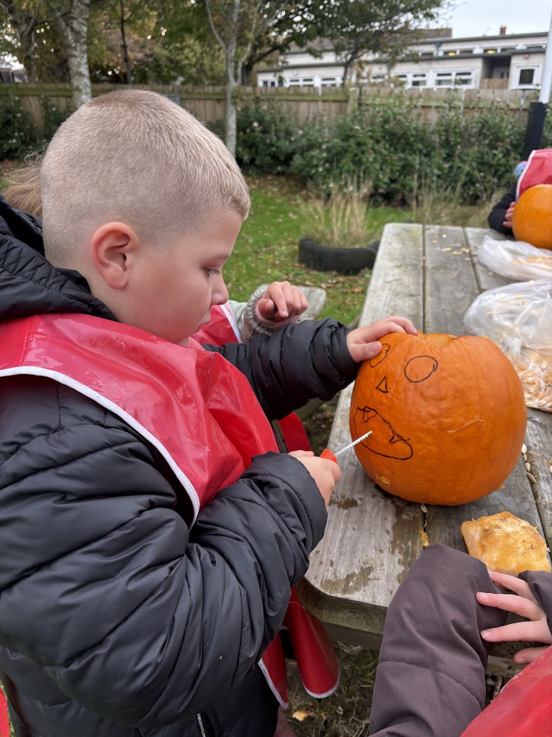 Then we drew our design onto the front of our pumpkin, before scooping out the pumpkin guts! 🥴 Finally, we very carefully used our pumpkin carving knife to cut out the shapes to create our faces! 🤩