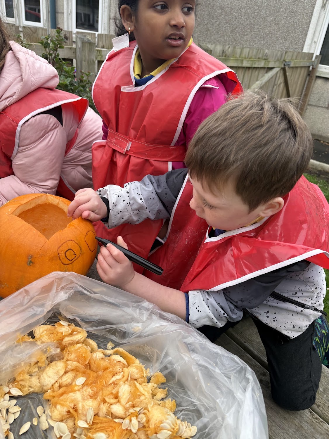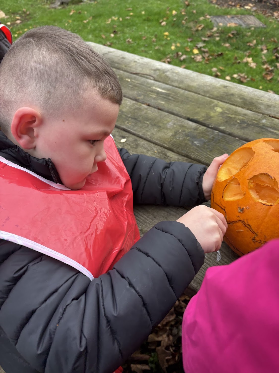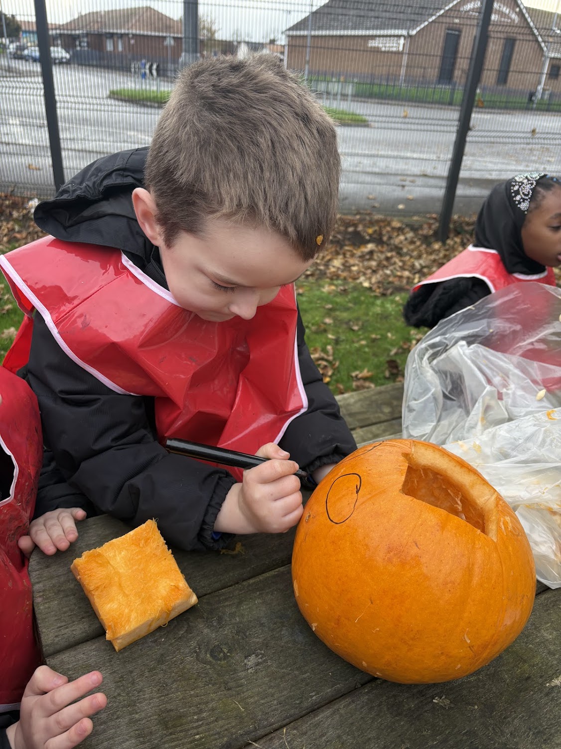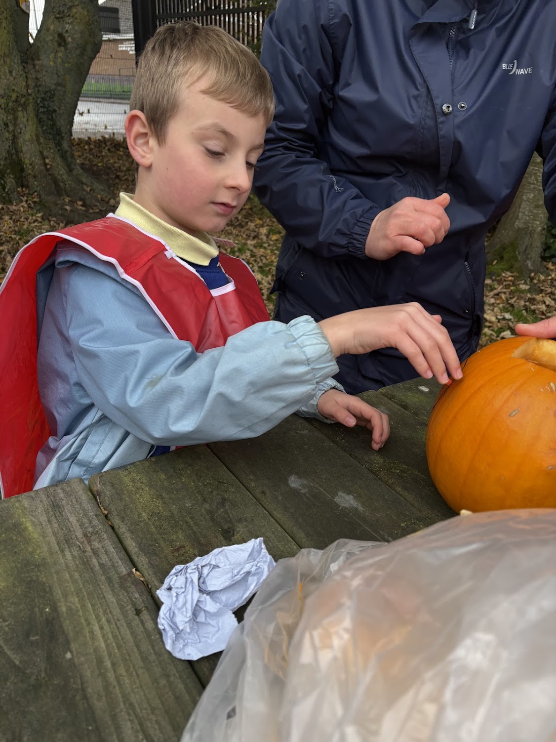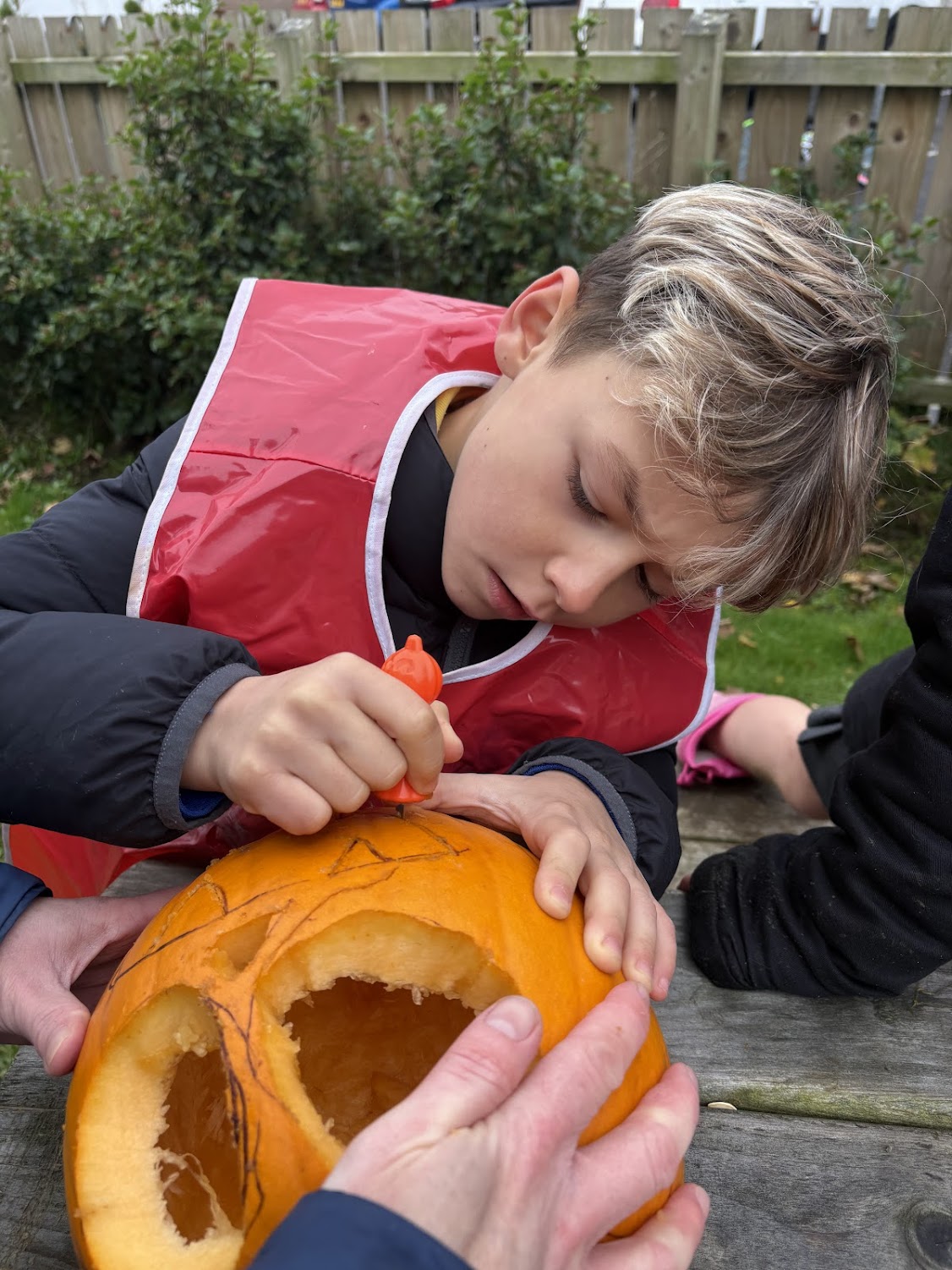 Then we drew our design onto the front of our pumpkin, before scooping out the pumpkin guts! 🥴 Finally, we very carefully used our pumpkin carving knife to cut out the shapes to create our faces! 🤩