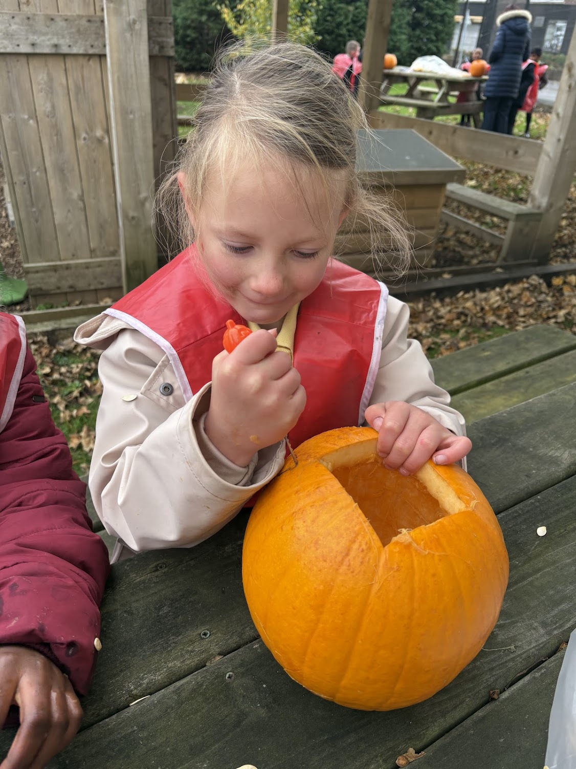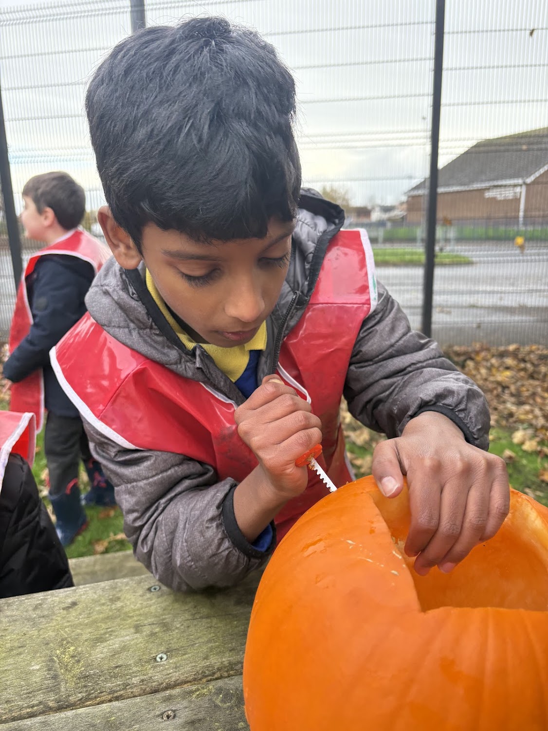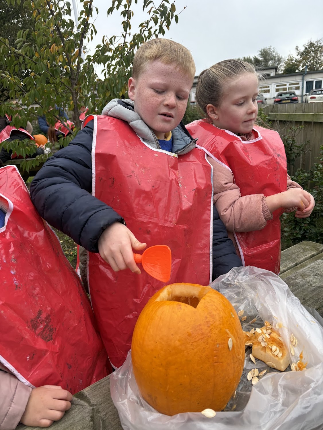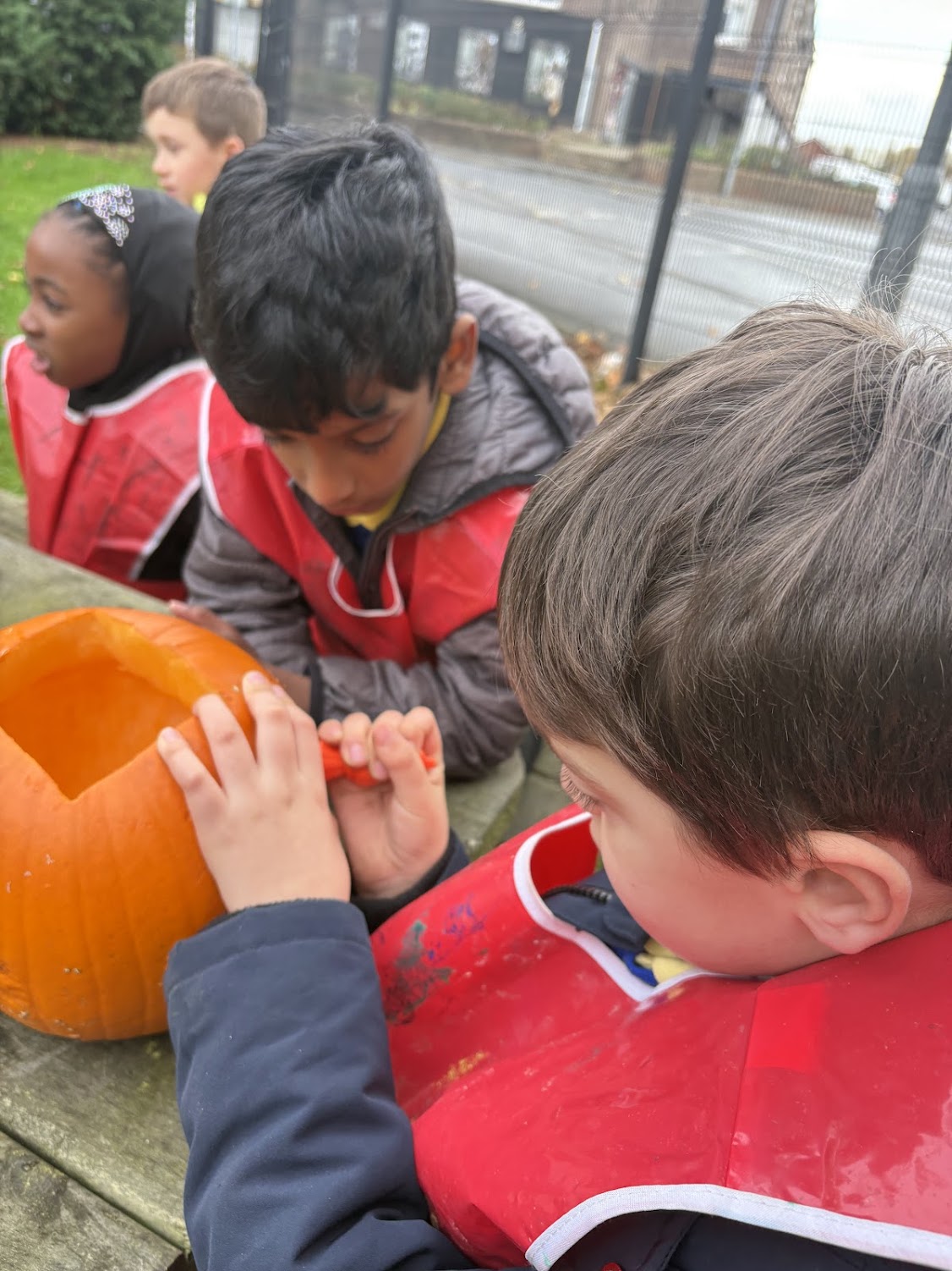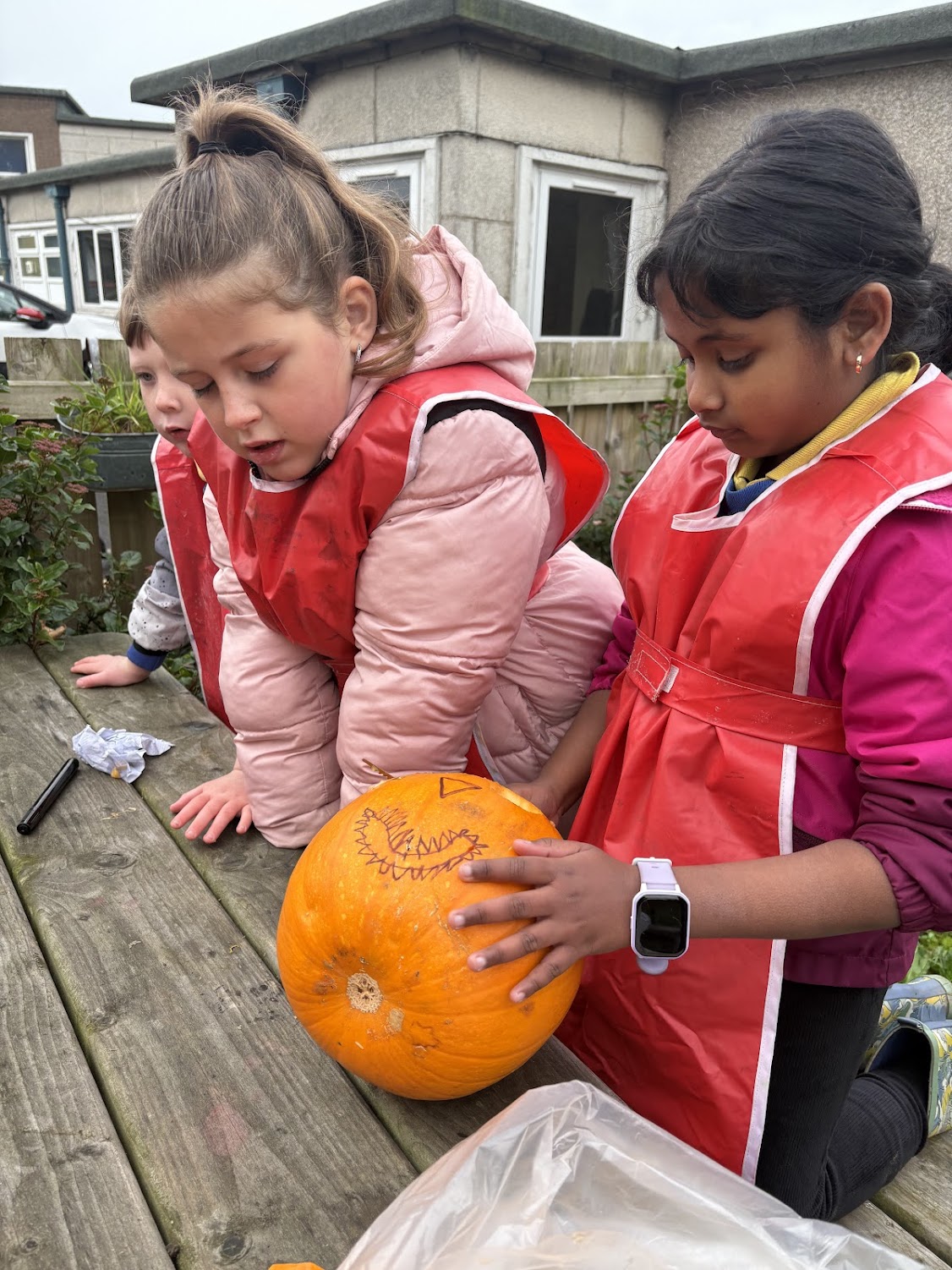 Then we drew our design onto the front of our pumpkin, before scooping out the pumpkin guts! 🥴 Finally, we very carefully used our pumpkin carving knife to cut out the shapes to create our faces! 🤩