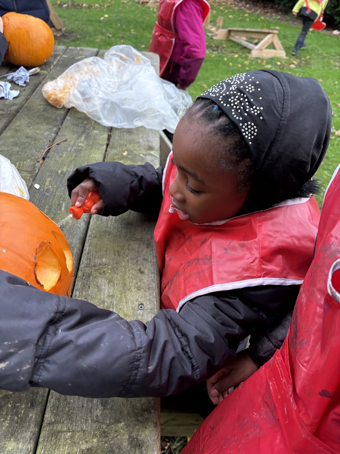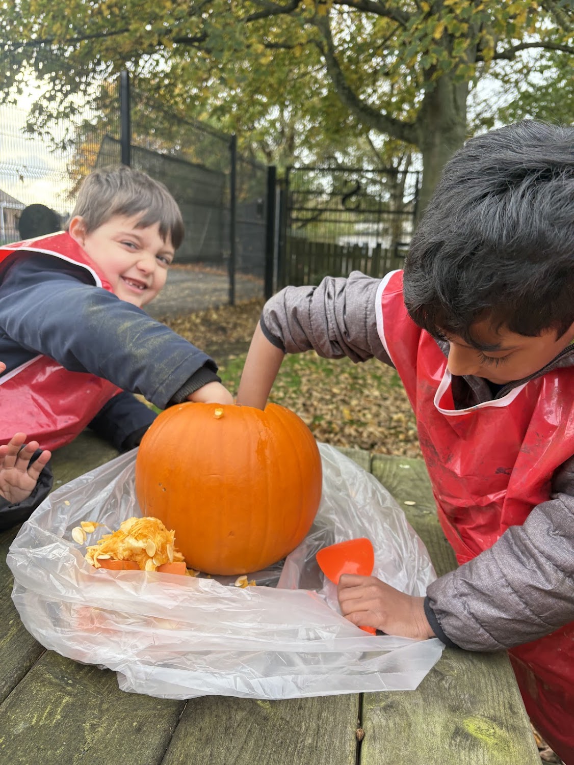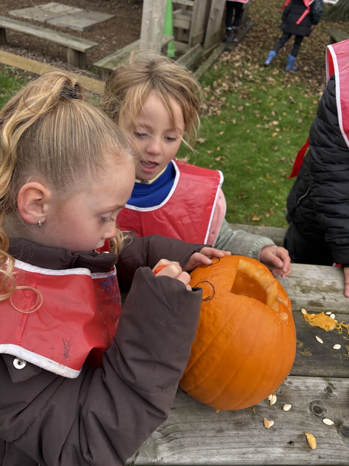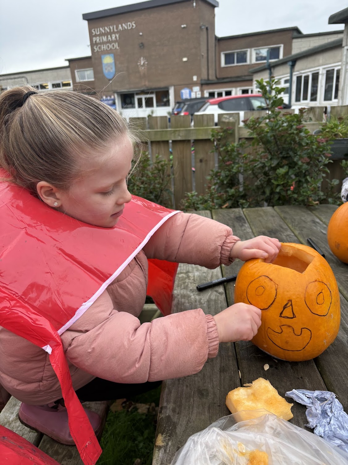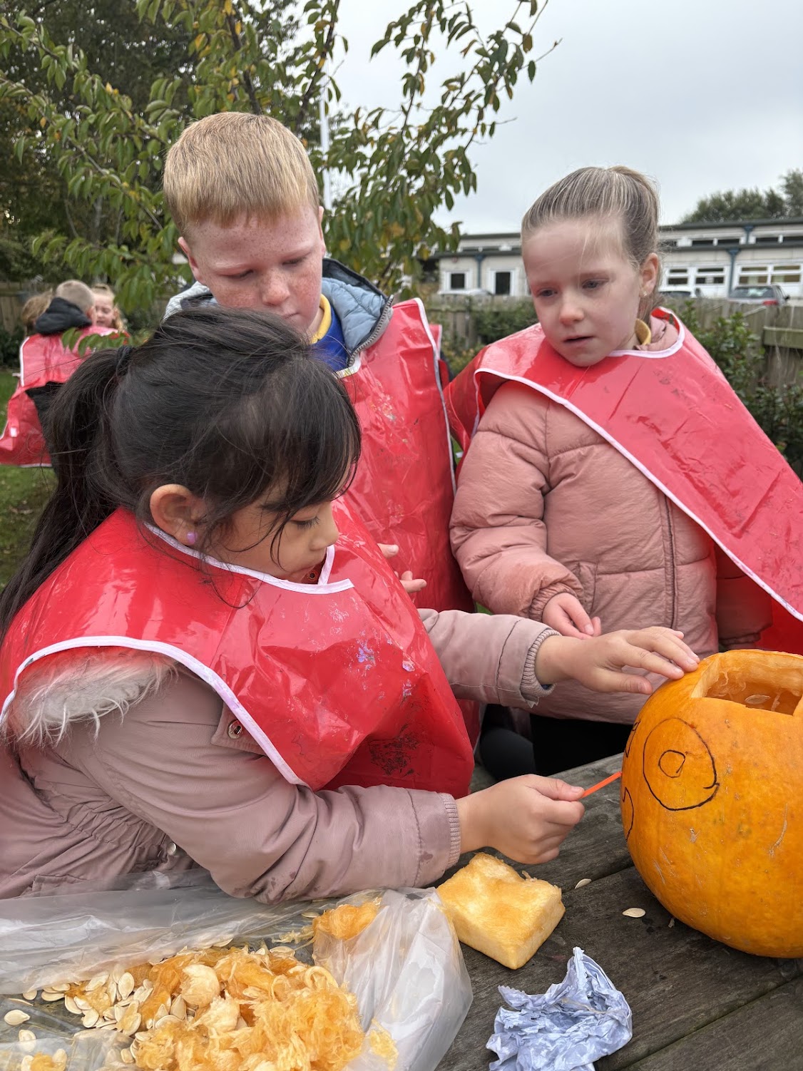 Then we drew our design onto the front of our pumpkin, before scooping out the pumpkin guts! 🥴 Finally, we very carefully used our pumpkin carving knife to cut out the shapes to create our faces! 🤩