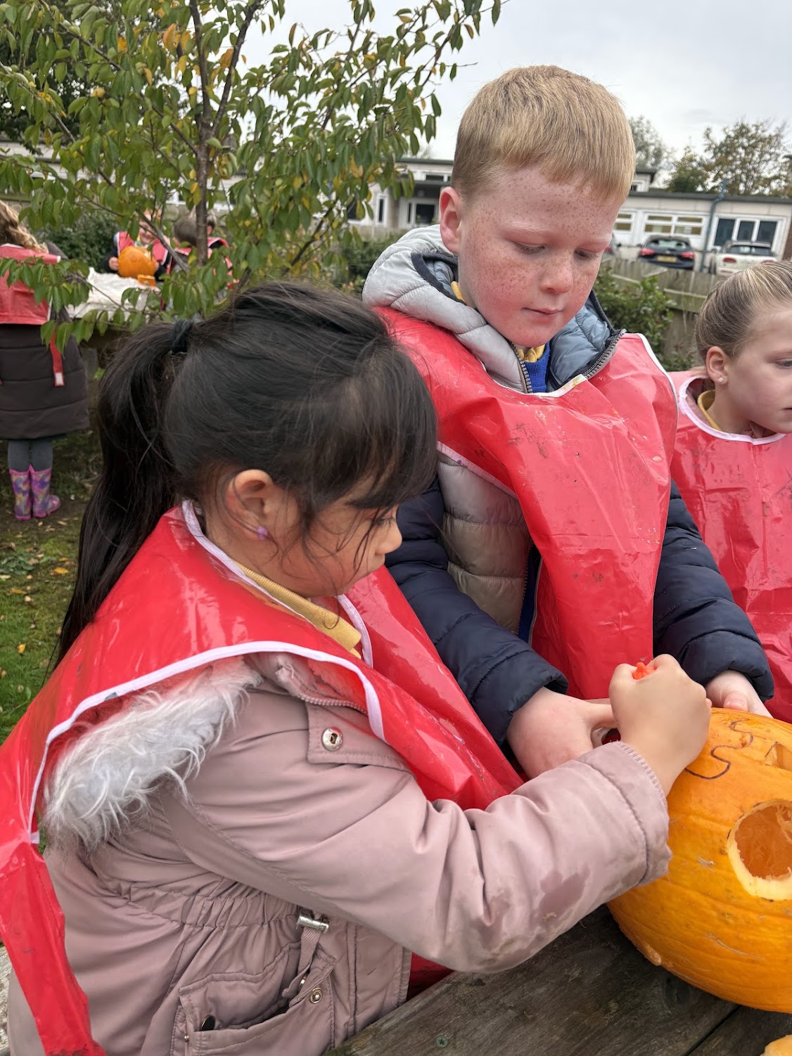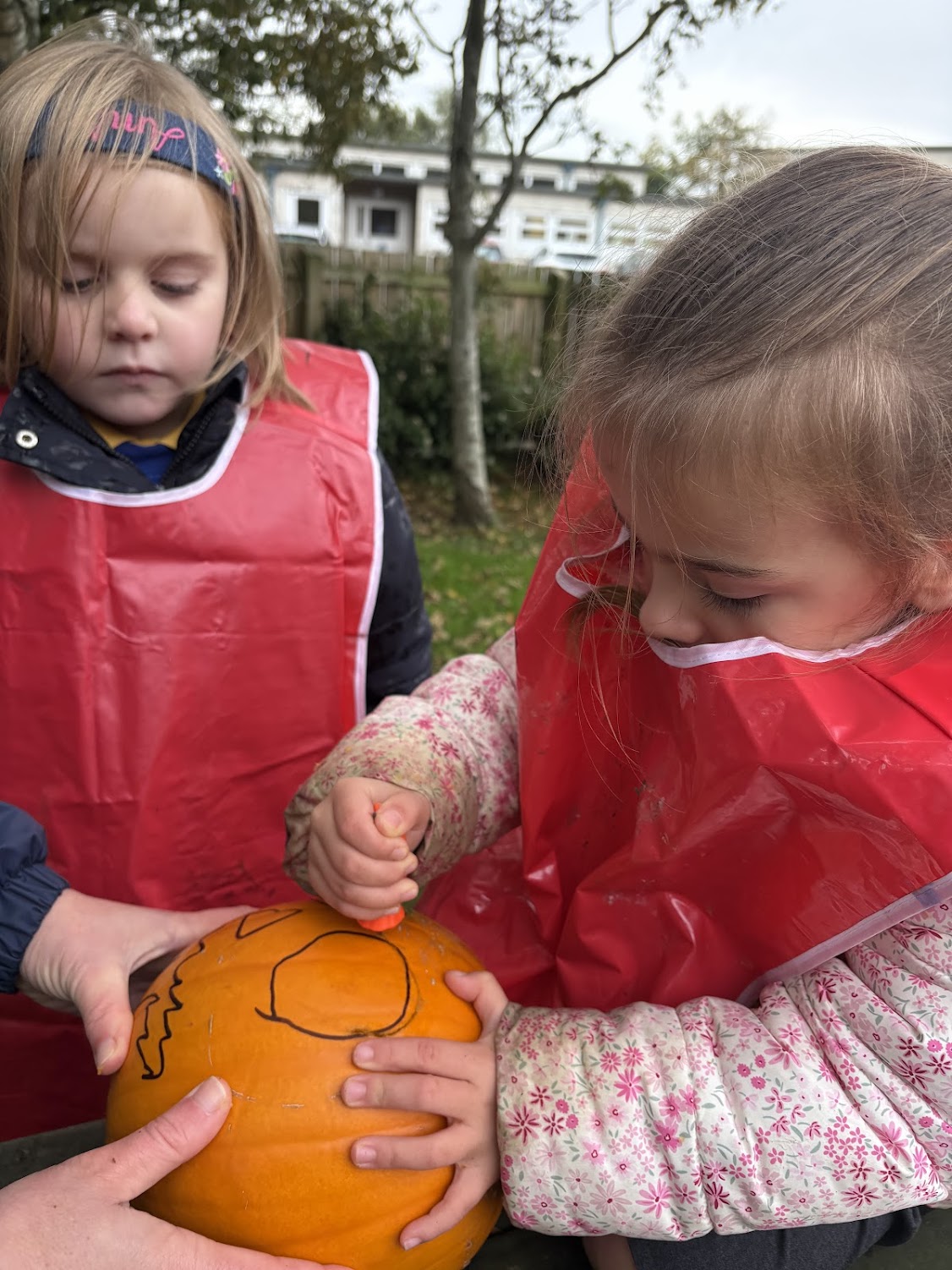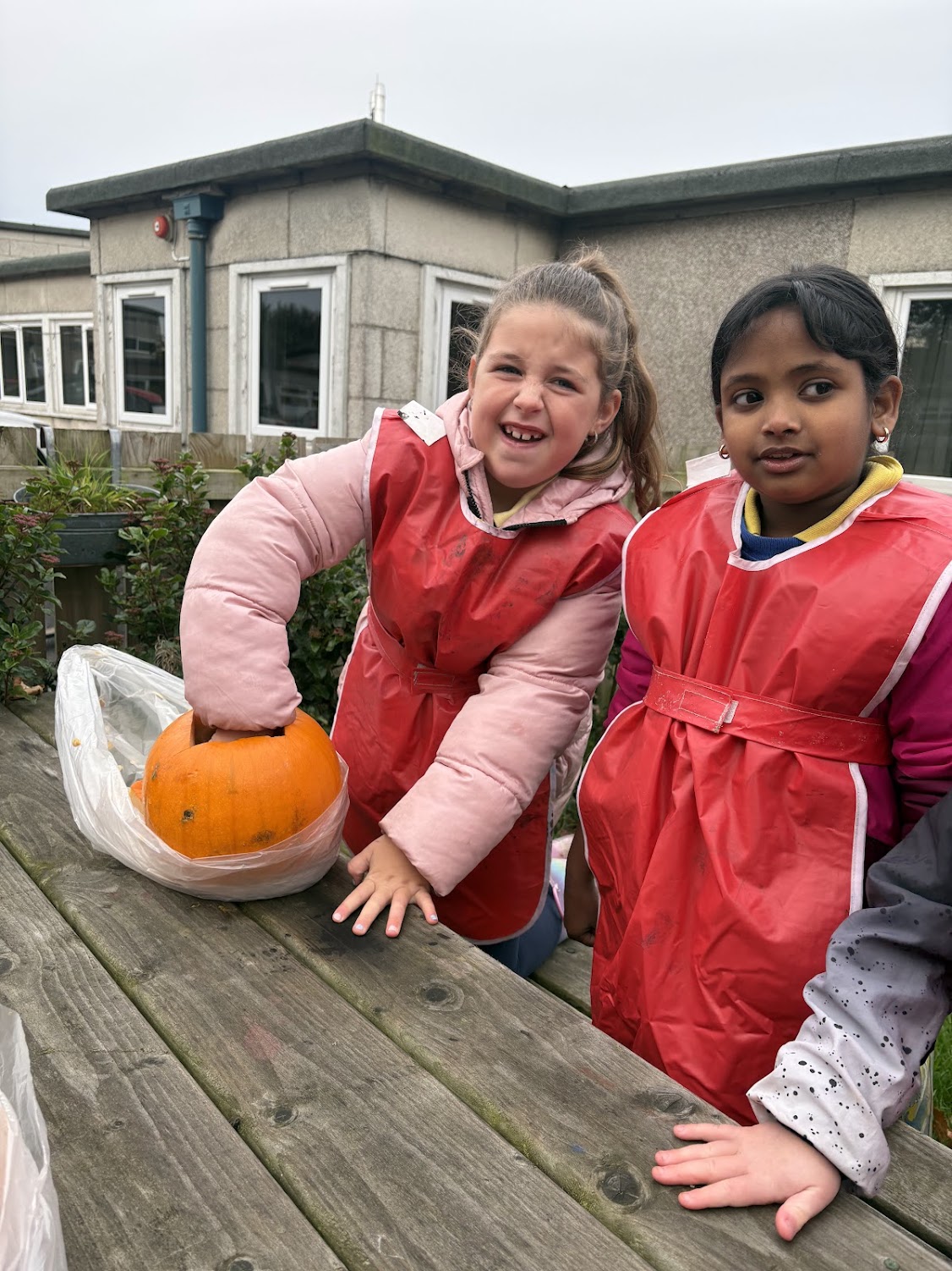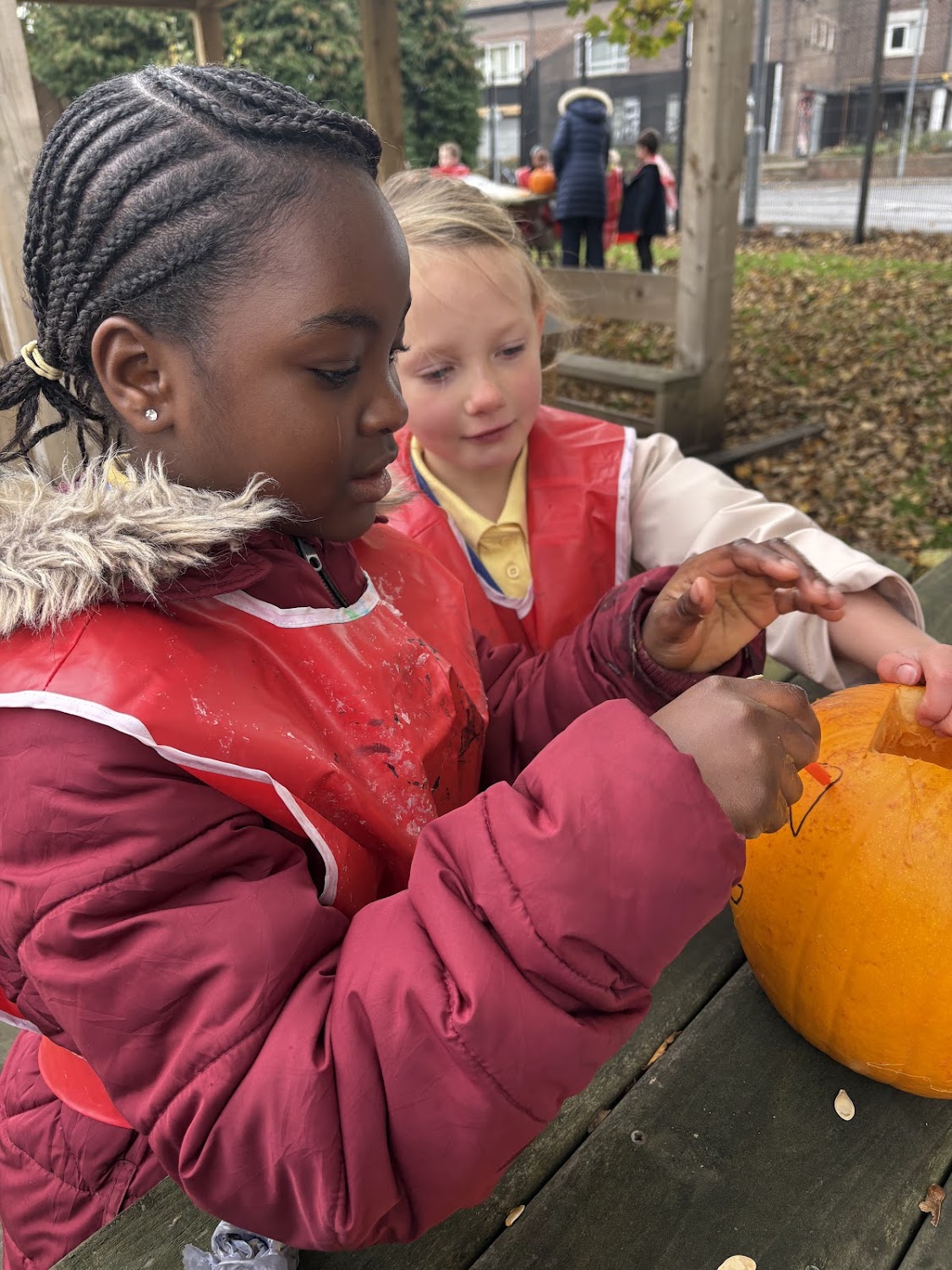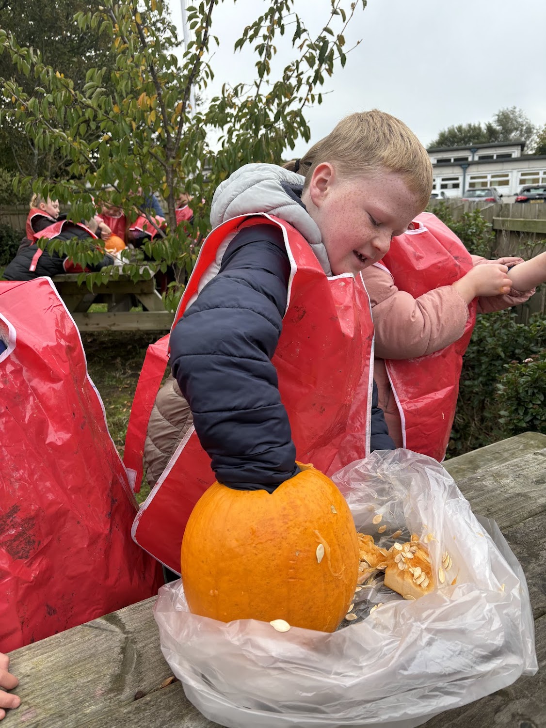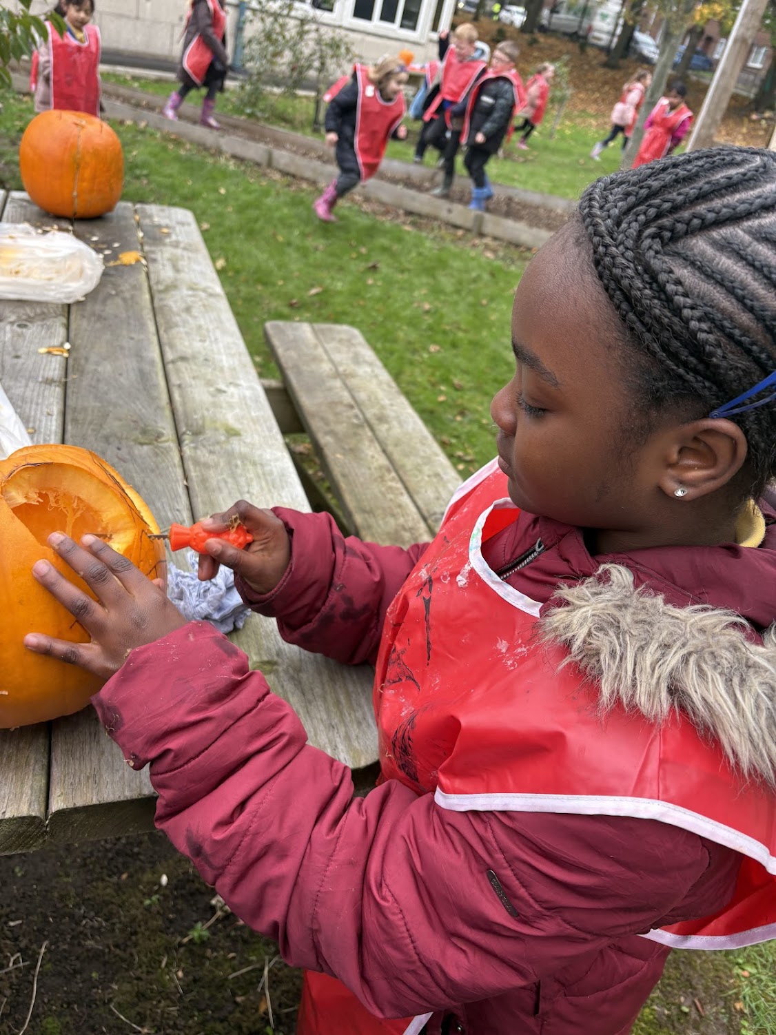 Then we drew our design onto the front of our pumpkin, before scooping out the pumpkin guts! 🥴 Finally, we very carefully used our pumpkin carving knife to cut out the shapes to create our faces! 🤩