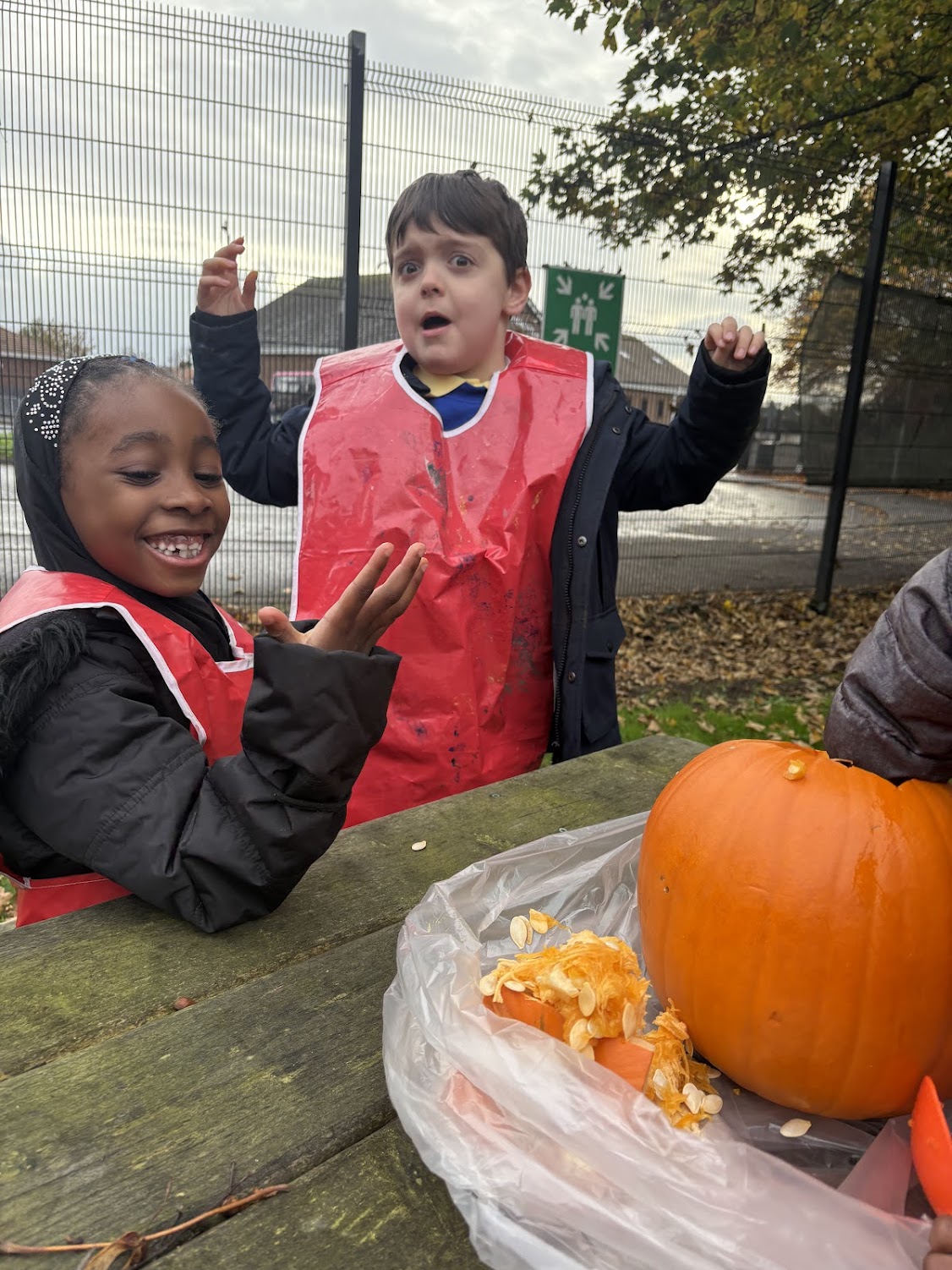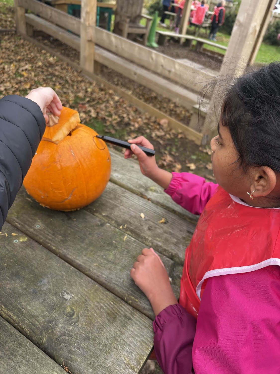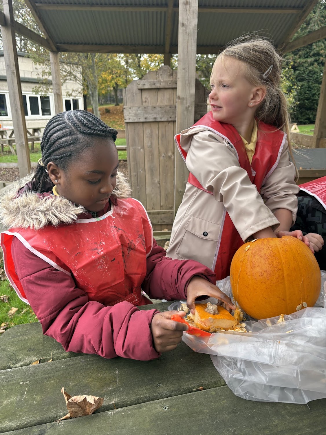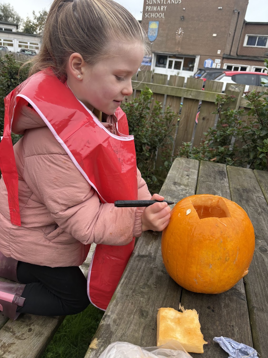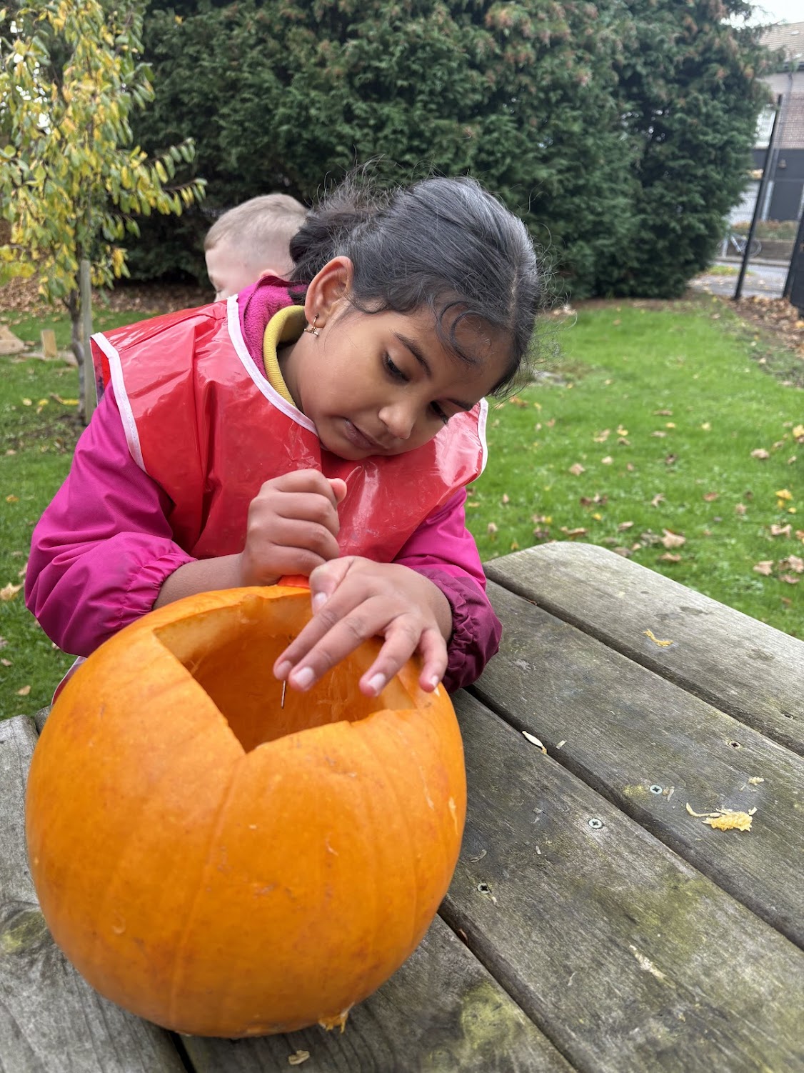 Then we drew our design onto the front of our pumpkin, before scooping out the pumpkin guts! 🥴 Finally, we very carefully used our pumpkin carving knife to cut out the shapes to create our faces! 🤩