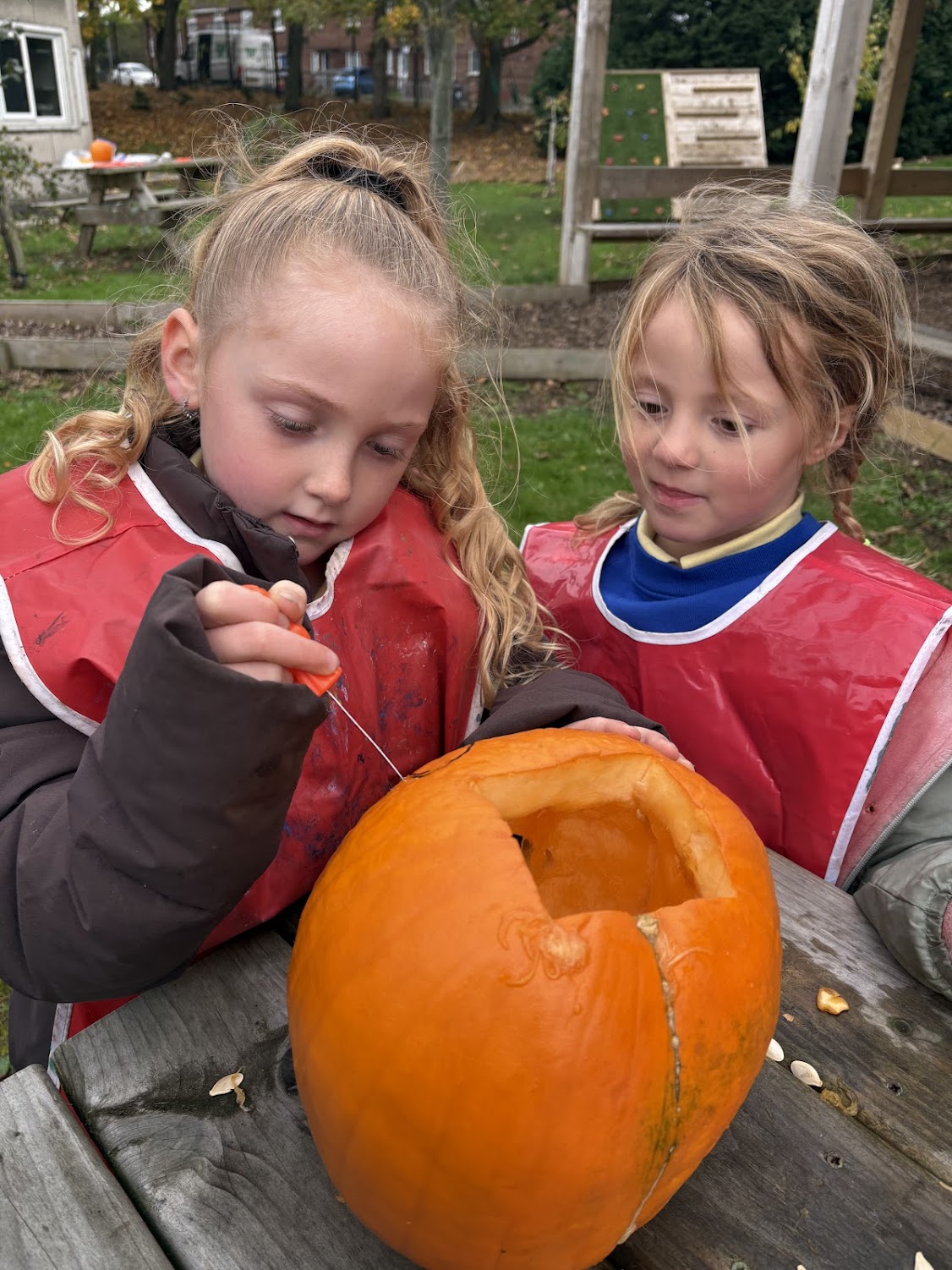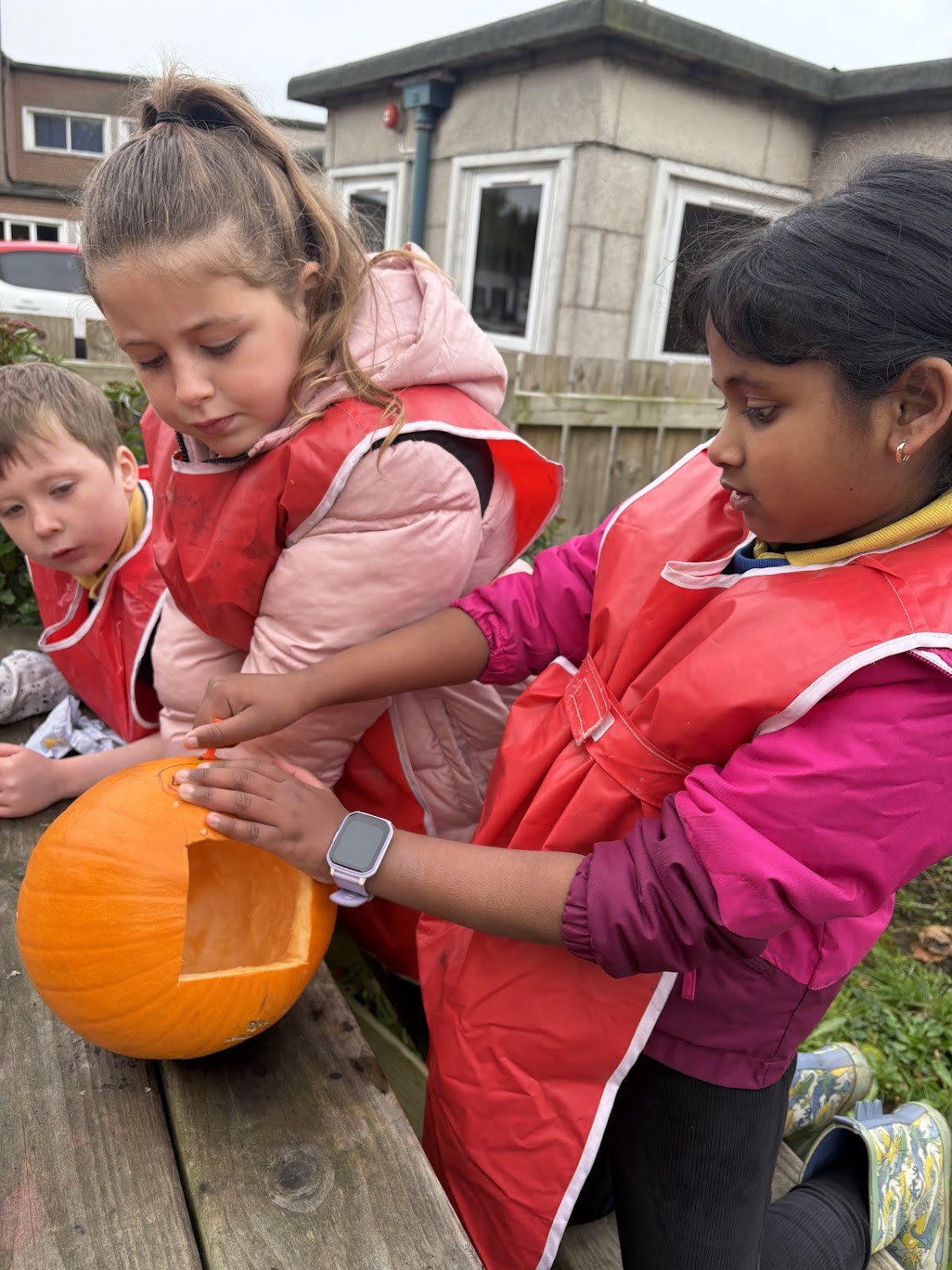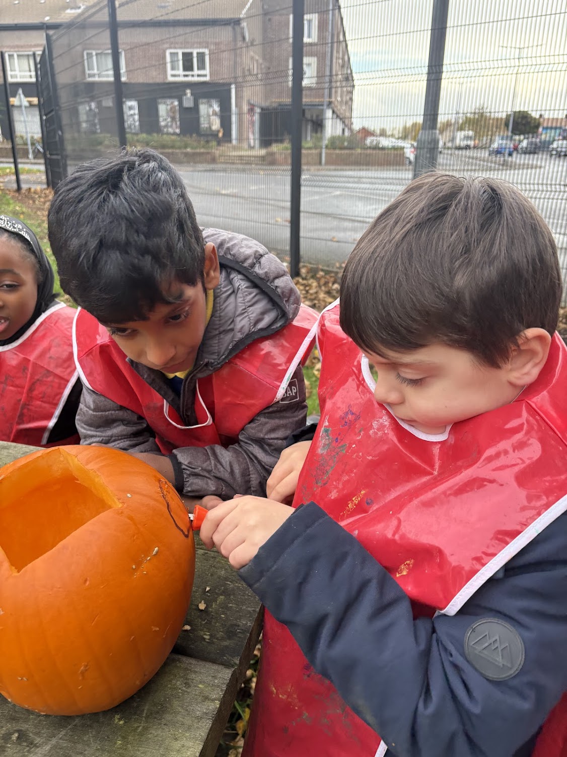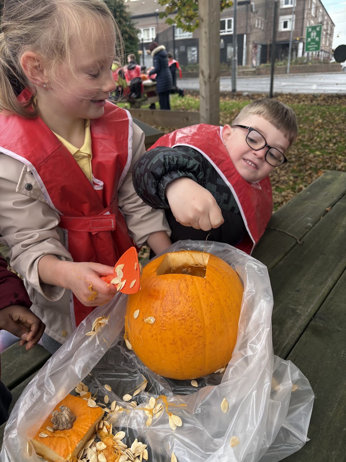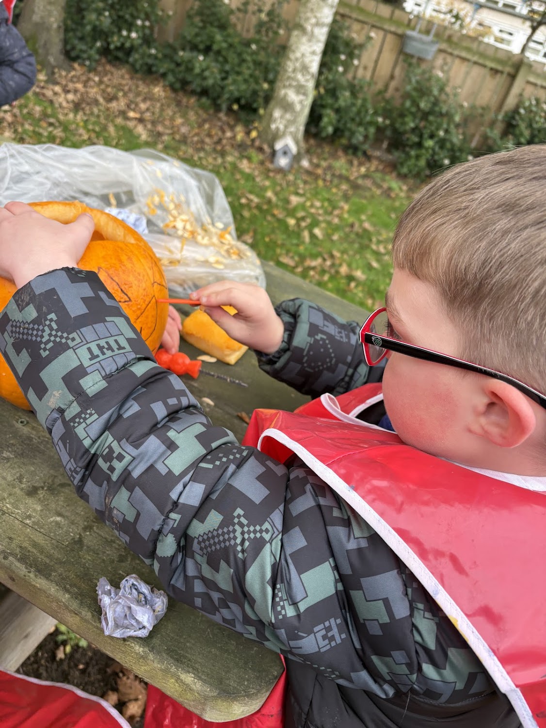Then we drew our design onto the front of our pumpkin, before scooping out the pumpkin guts! 🥴 Finally, we very carefully used our pumpkin carving knife to cut out the shapes to create our faces! 🤩
