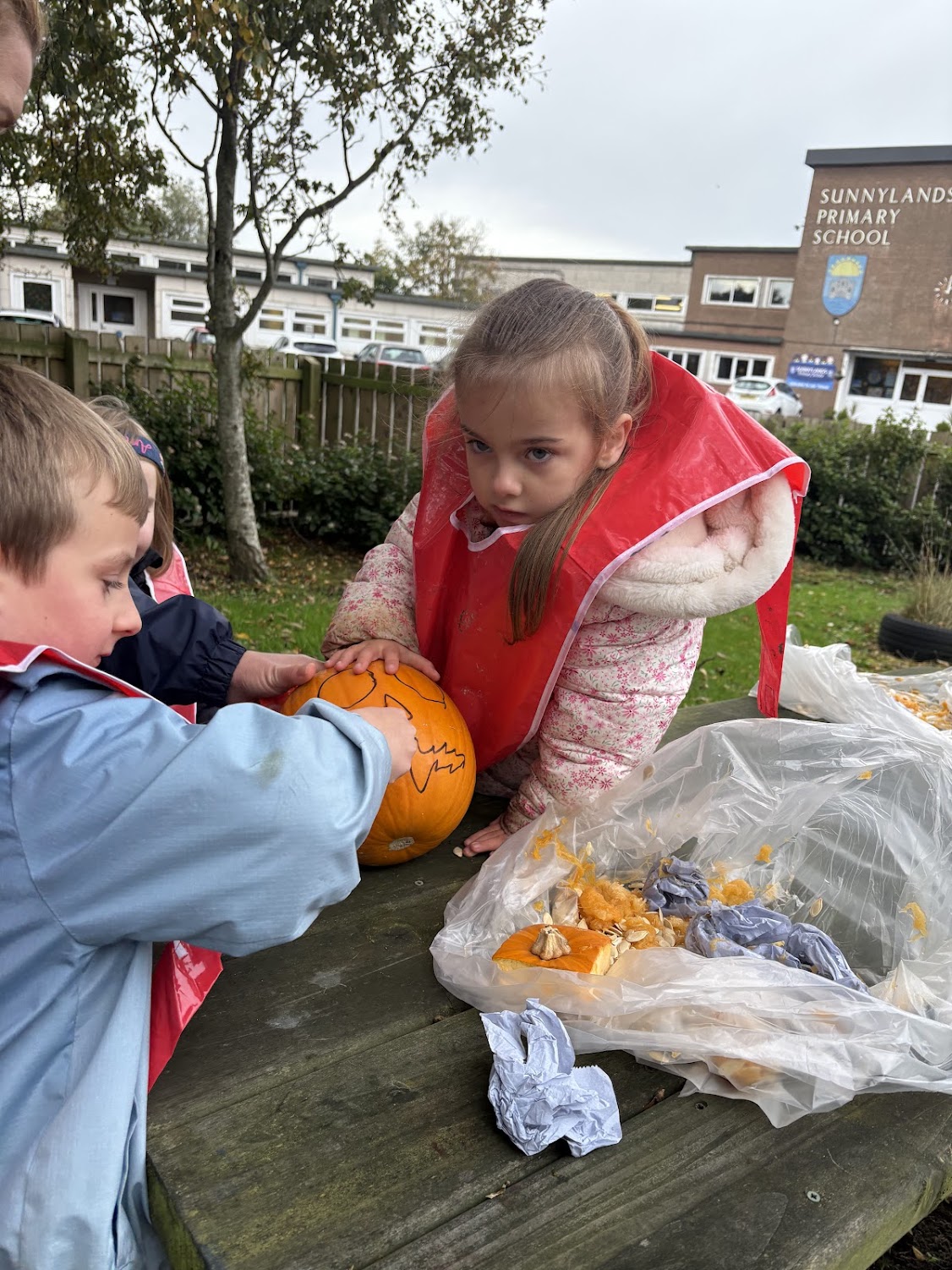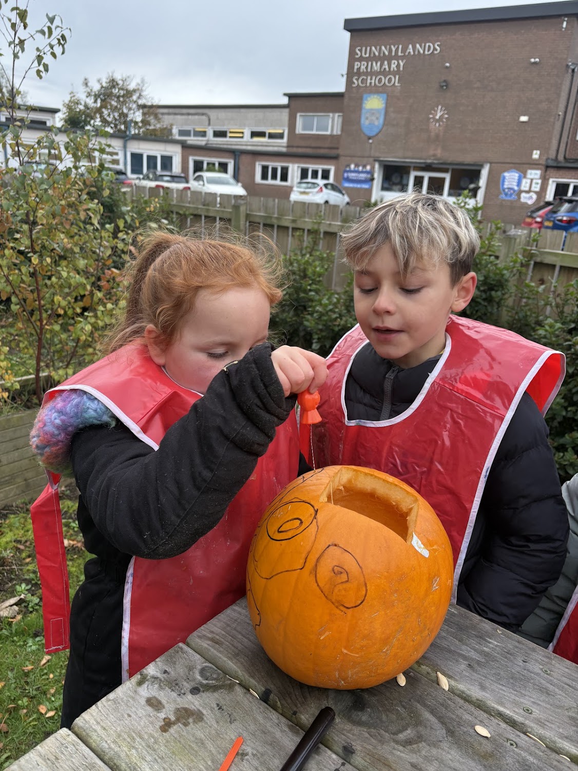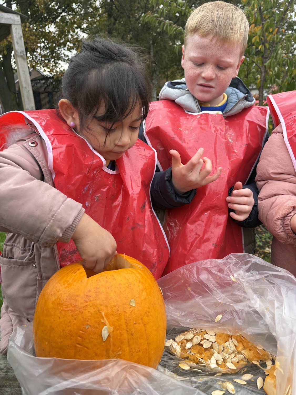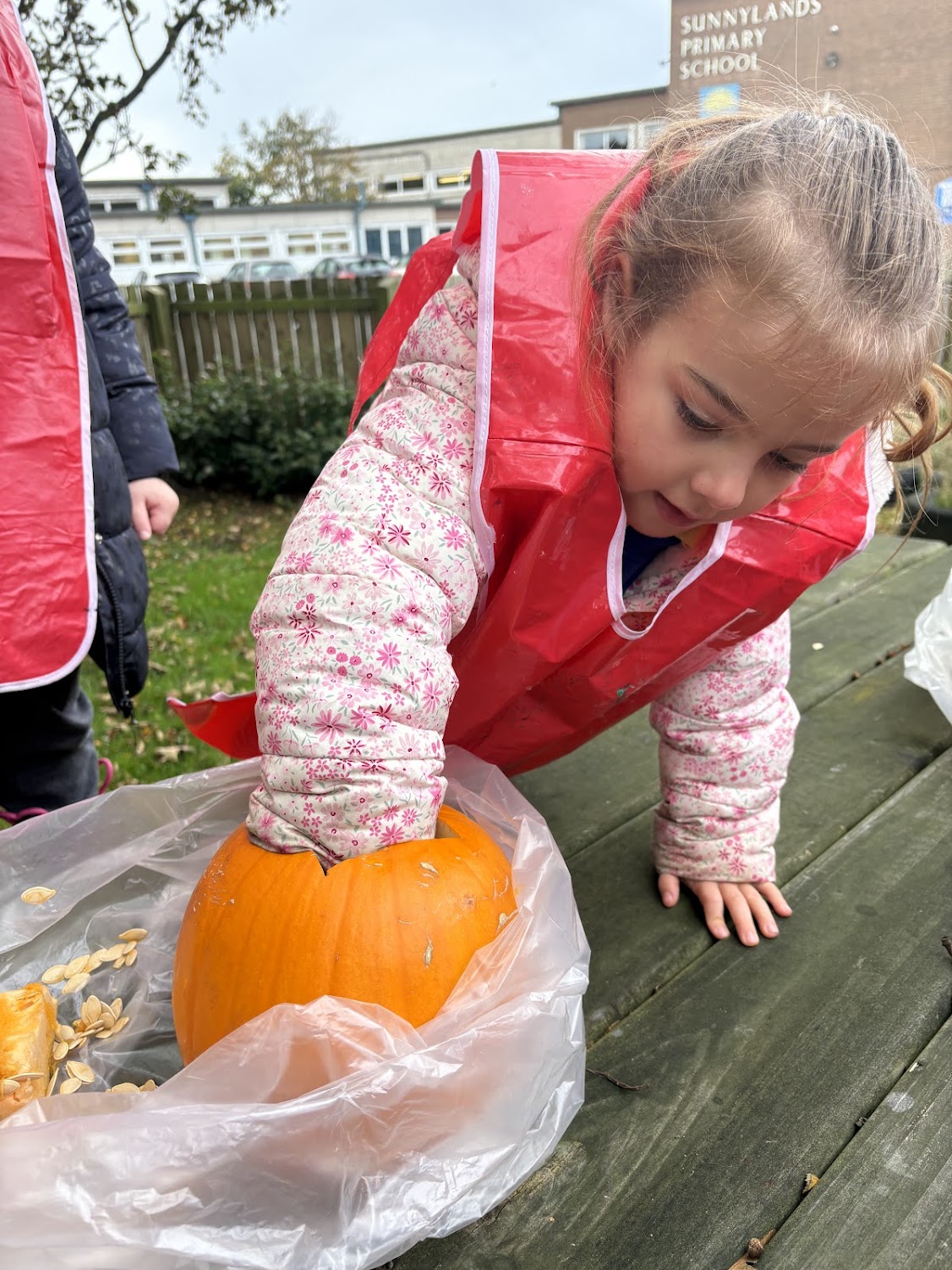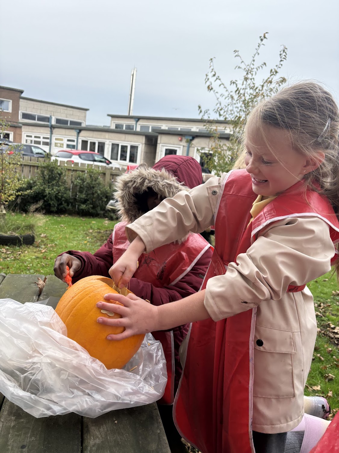 Then we drew our design onto the front of our pumpkin, before scooping out the pumpkin guts! 🥴 Finally, we very carefully used our pumpkin carving knife to cut out the shapes to create our faces! 🤩