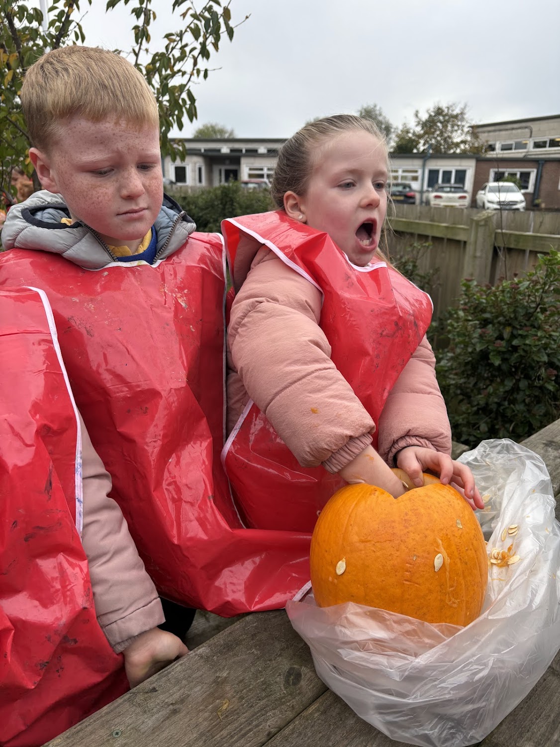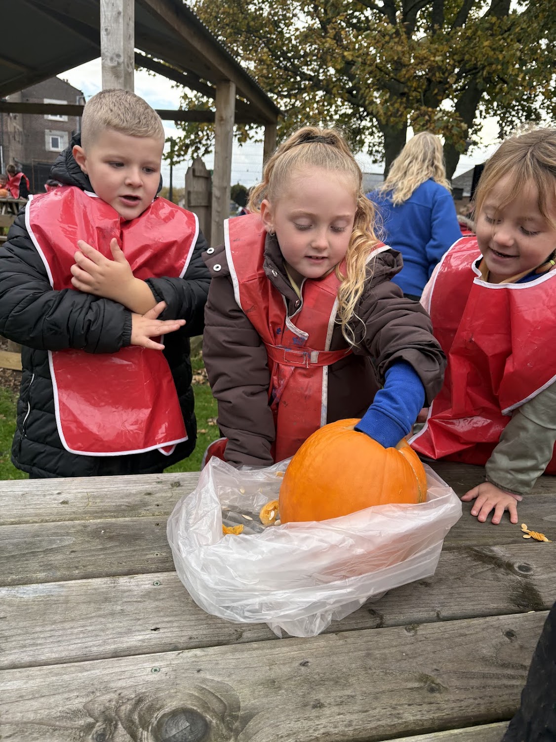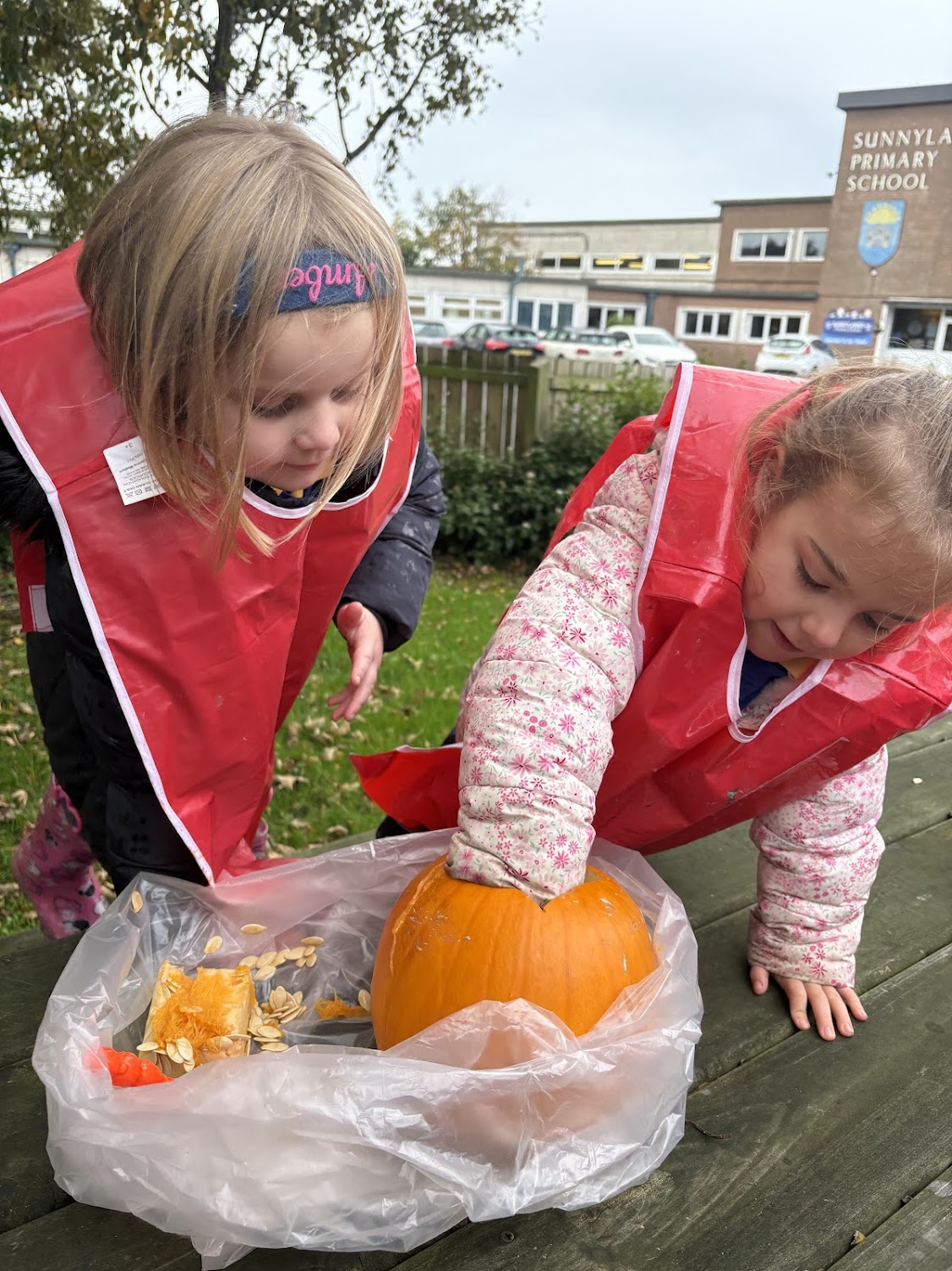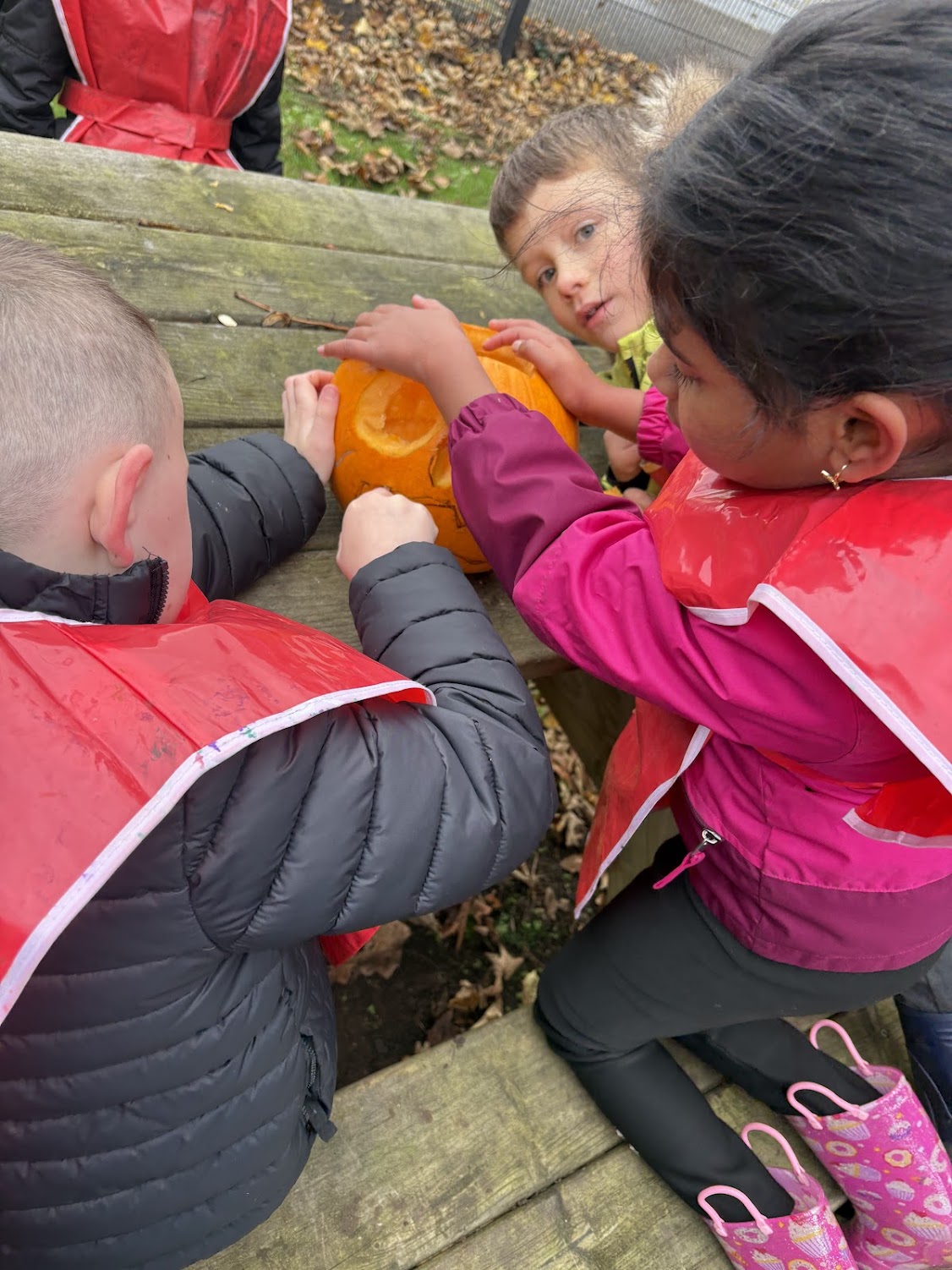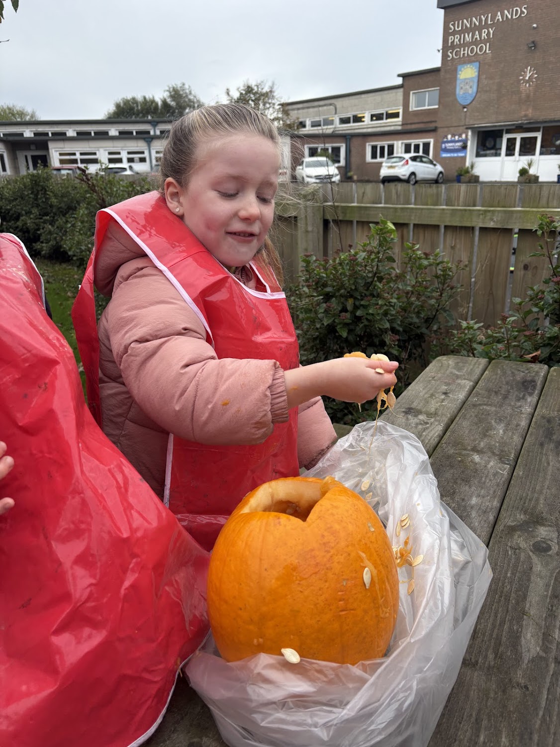 Then we drew our design onto the front of our pumpkin, before scooping out the pumpkin guts! 🥴 Finally, we very carefully used our pumpkin carving knife to cut out the shapes to create our faces! 🤩