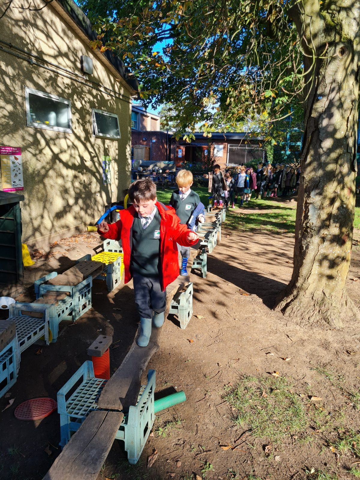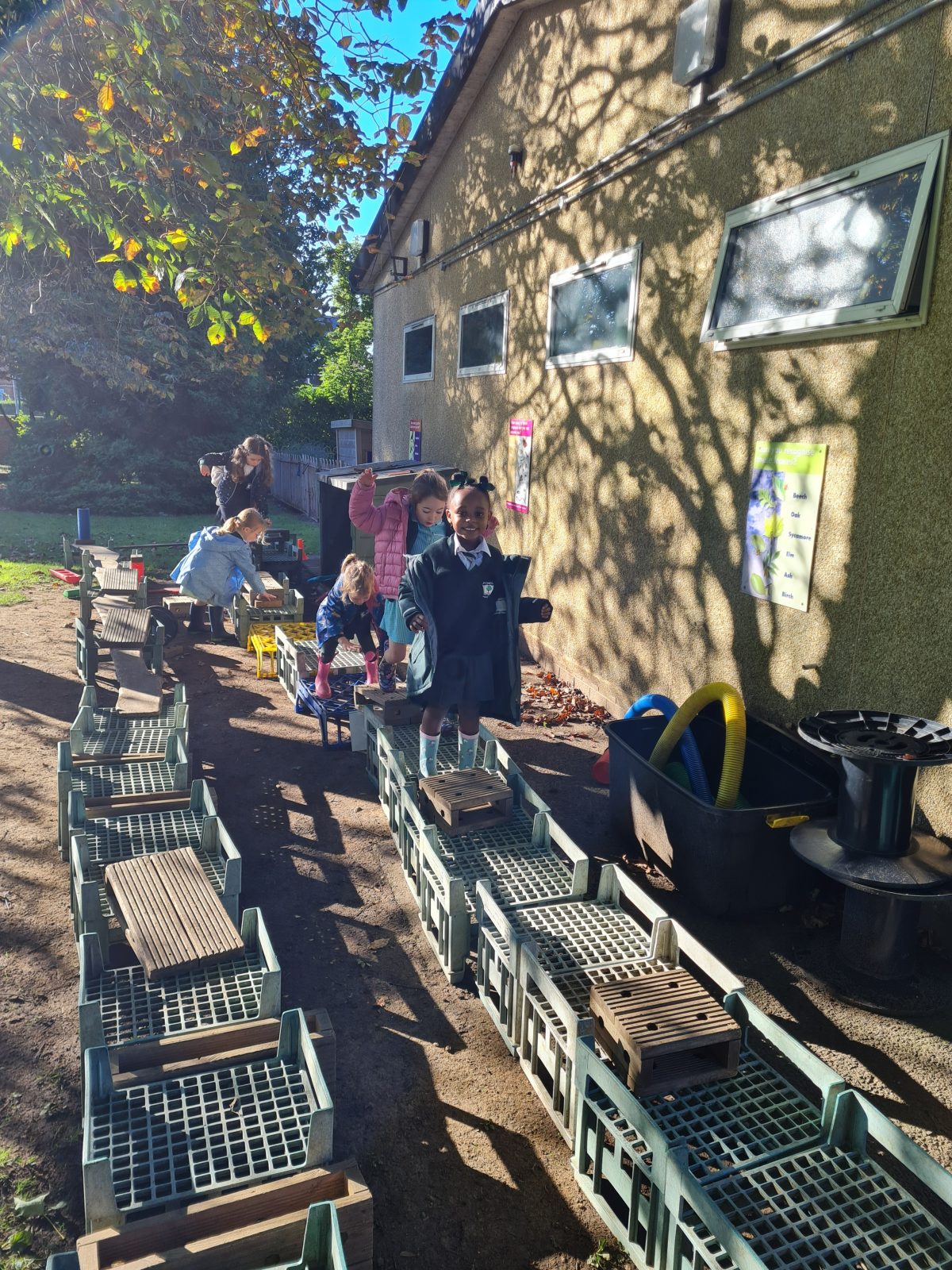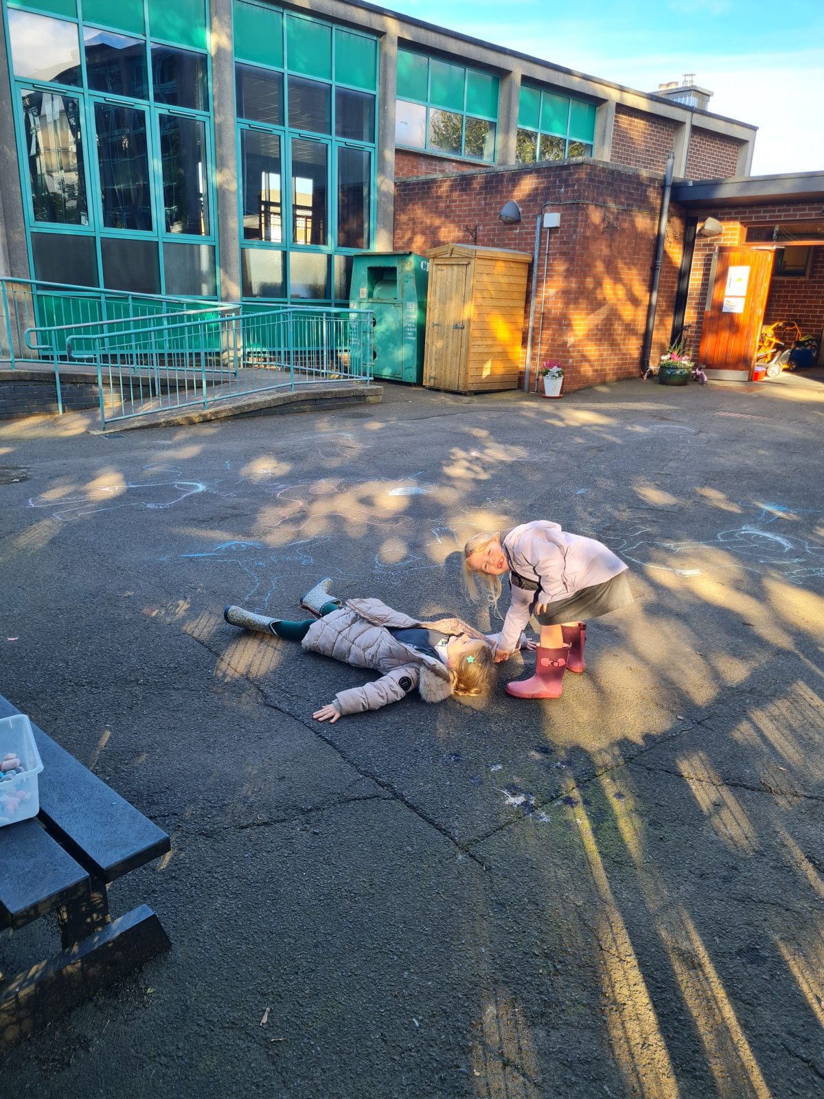 Our topic is body and bones. The children were able to create an obstacle course to keep their bodies healthy, make medicine in the mud kitchen, draw round their bodies with chalk and use sticks to make a giant skeleton.