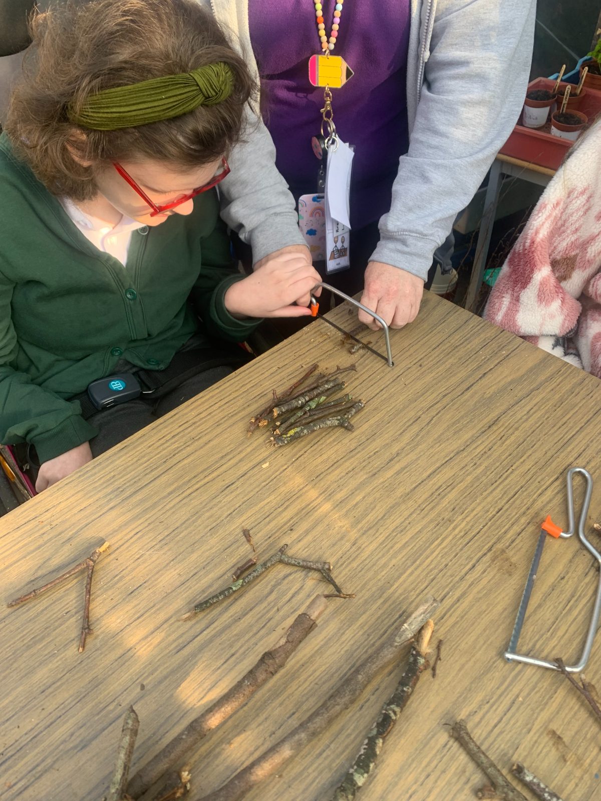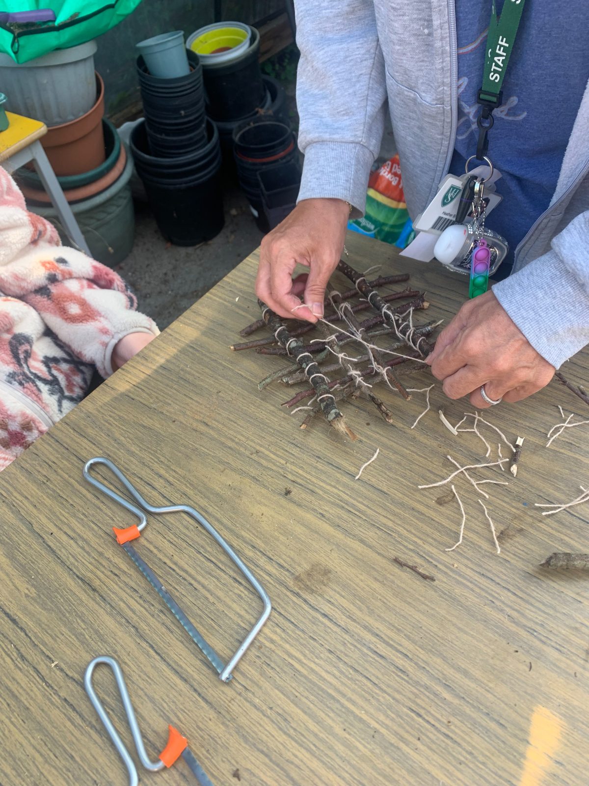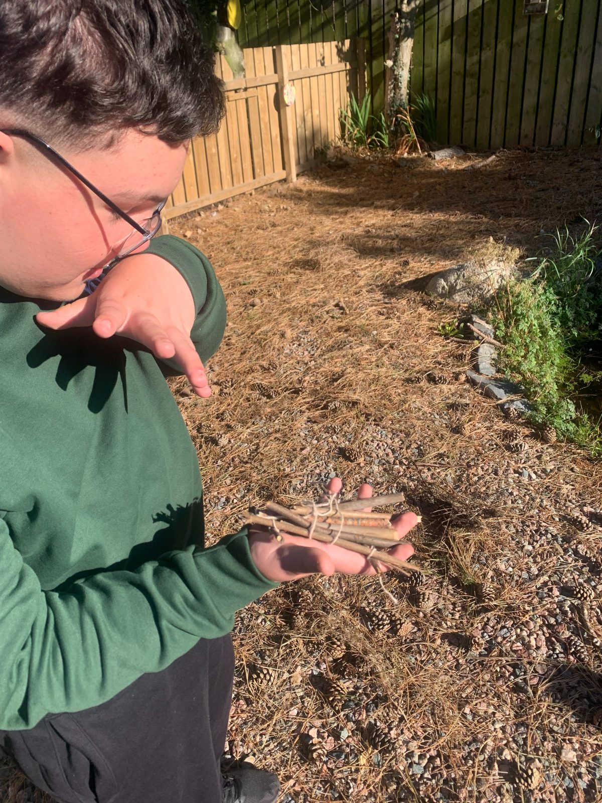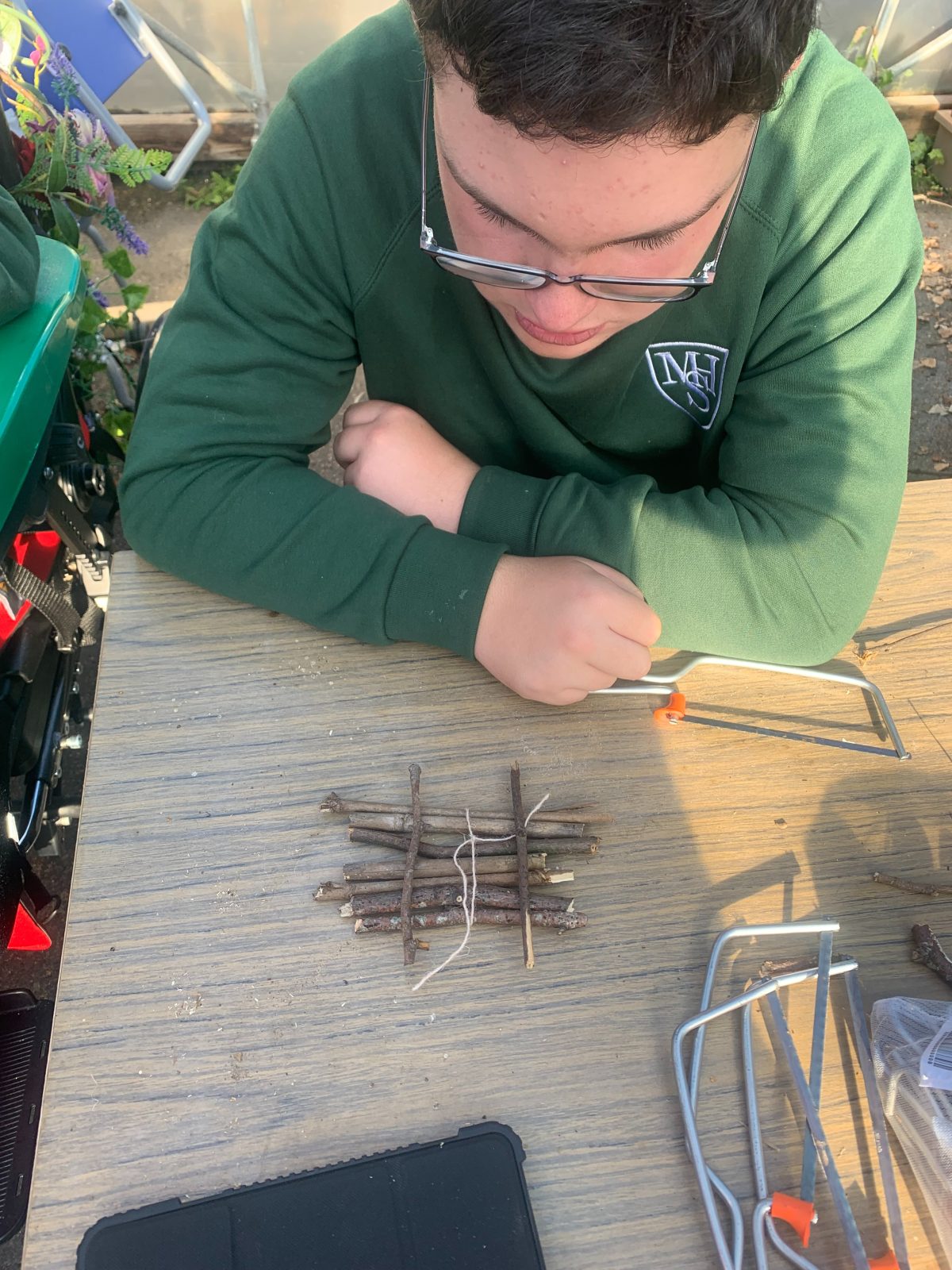 Spoke about what a Raft is and how we would go about building one. Discussed the tools that we would use. Moved out to the Polytunnel to cut our sticks and tie them together. Went down to the pond in our sensory garden to see if our rafts float!
