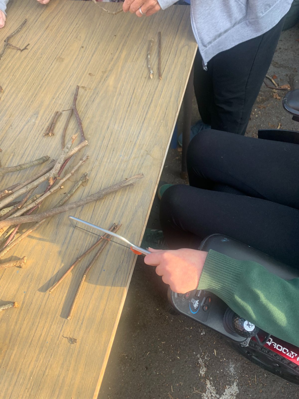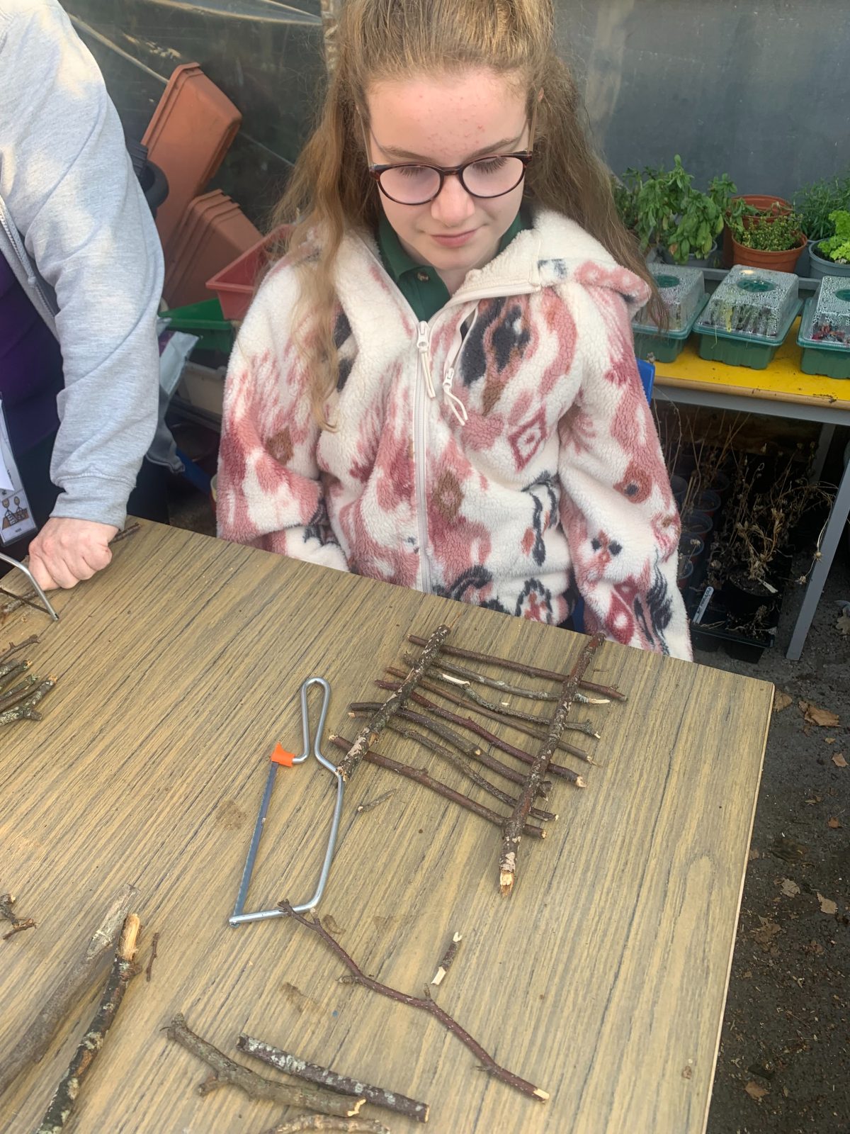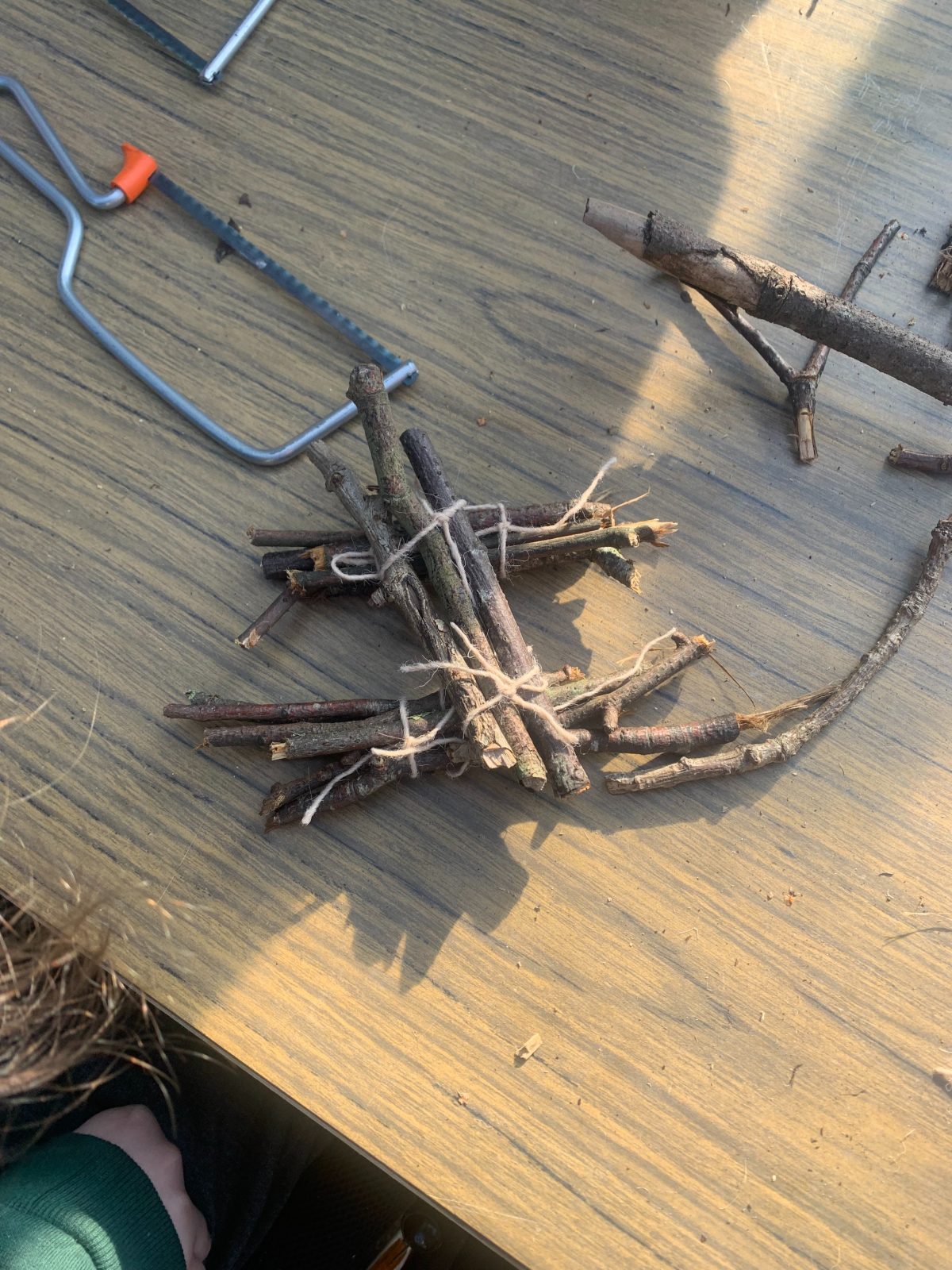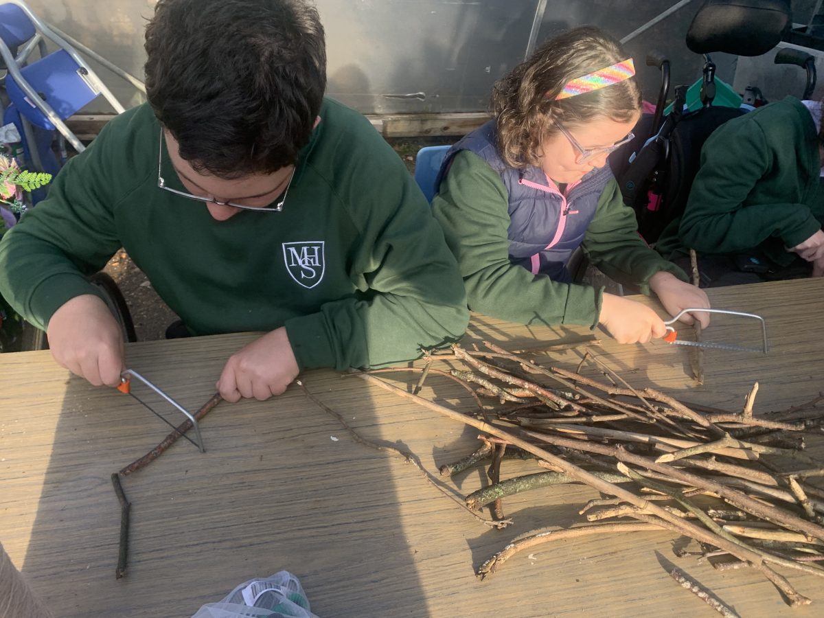 Spoke about what a Raft is and how we would go about building one. Discussed the tools that we would use. Moved out to the Polytunnel to cut our sticks and tie them together. Went down to the pond in our sensory garden to see if our rafts float!
