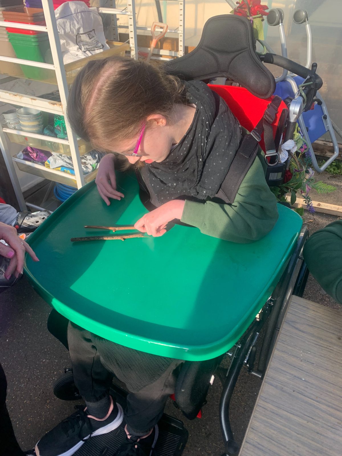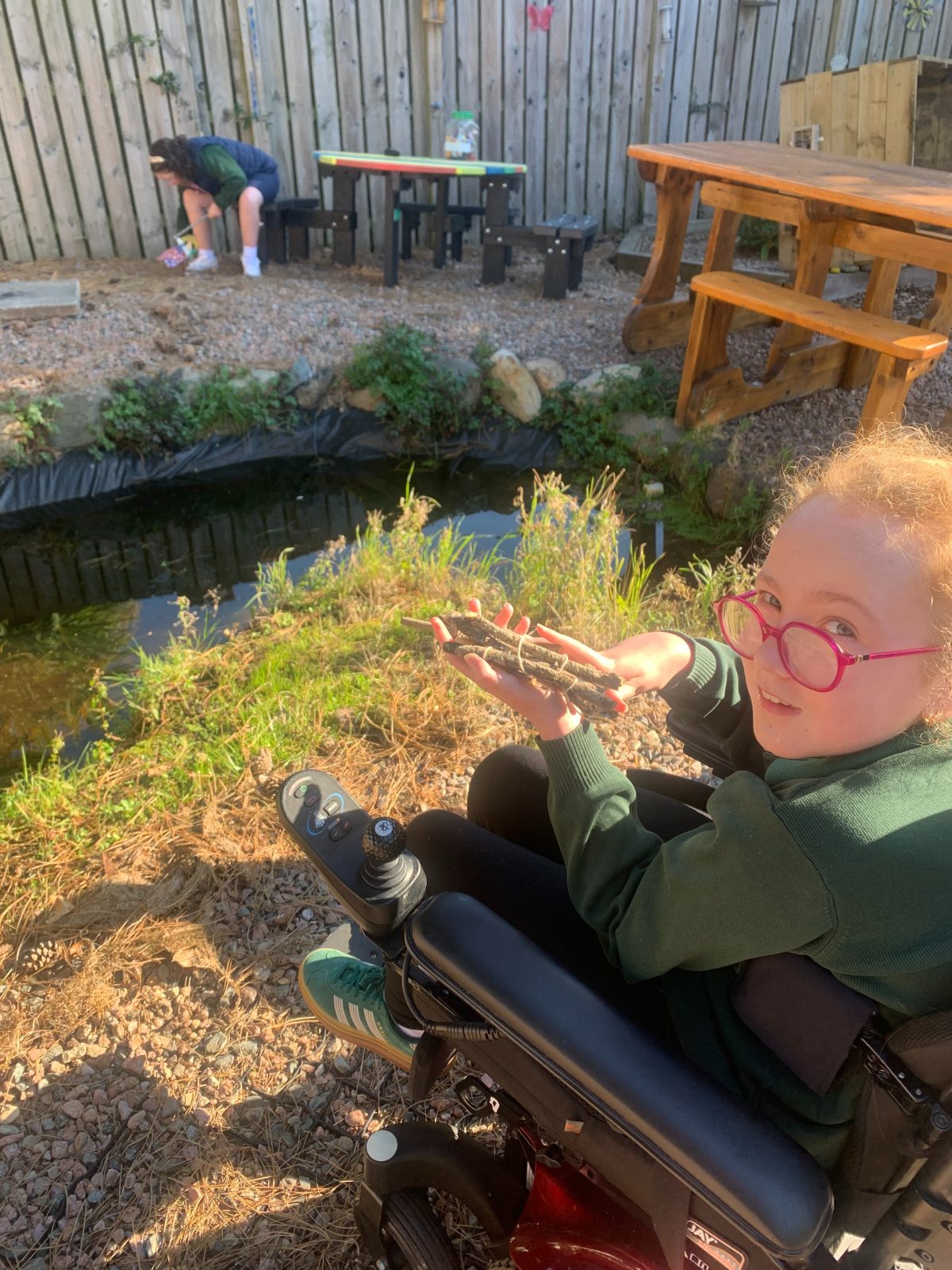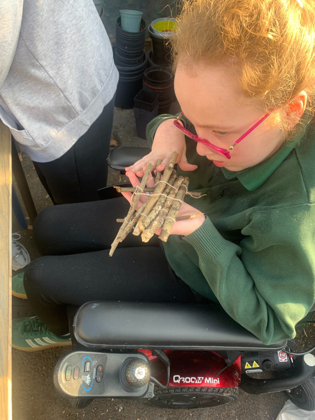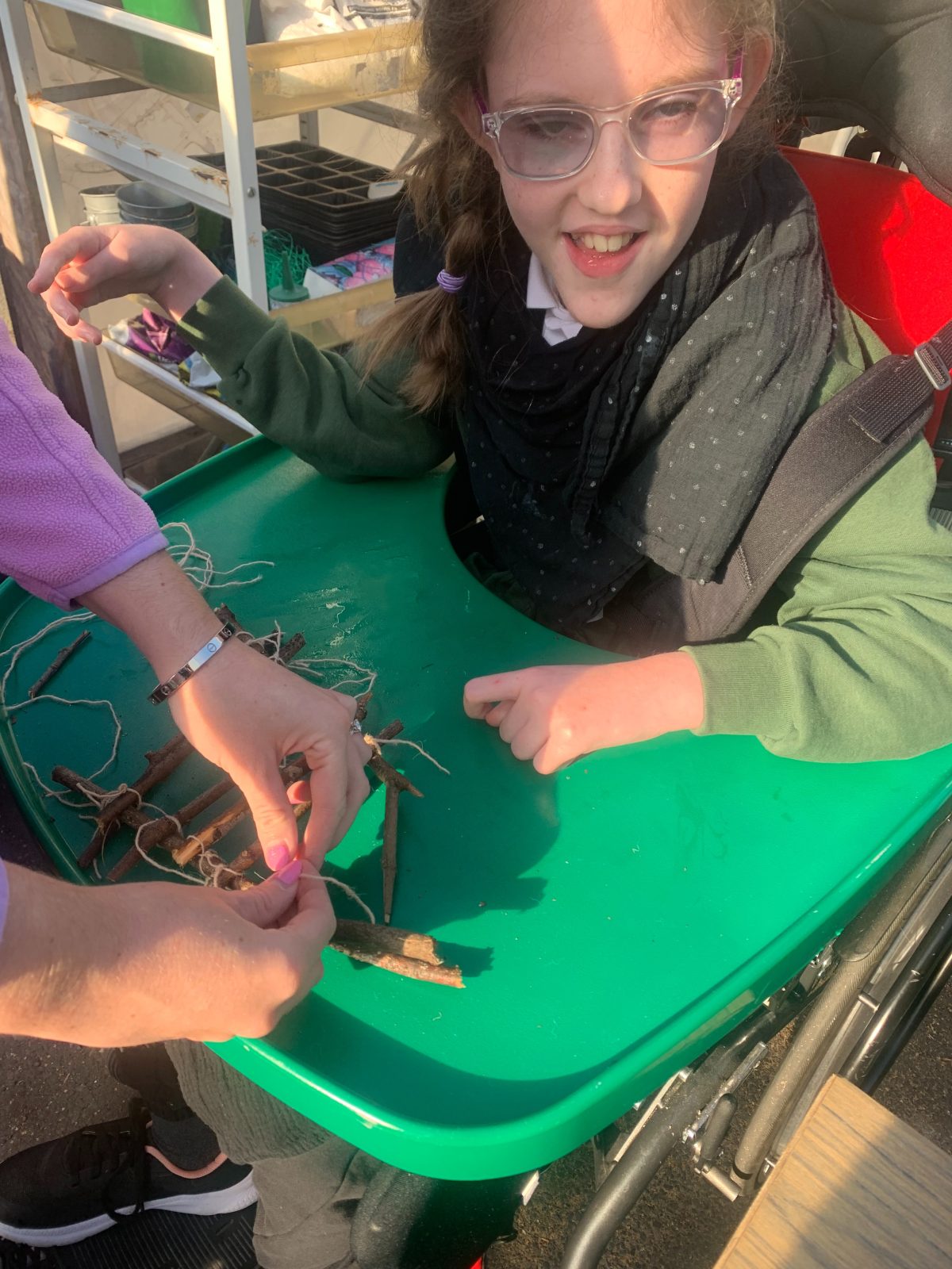 Spoke about what a Raft is and how we would go about building one. Discussed the tools that we would use. Moved out to the Polytunnel to cut our sticks and tie them together. Went down to the pond in our sensory garden to see if our rafts float!